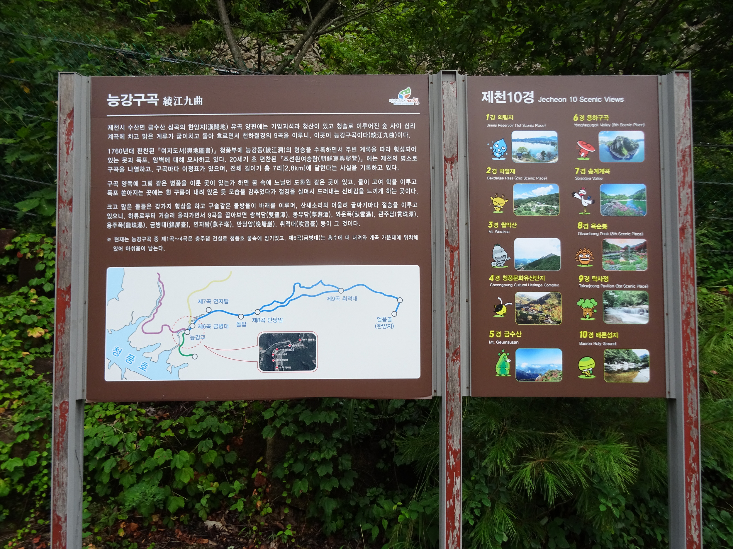 금수산 서북쪽 8부 능선의 한양지(寒陽地)에서, 능강천이 흐르는 제천시 수산면 능강리의 계곡을 능강계곡이라 하는데, 청솔로 우거진 숲 사이로 차고 맑은 물이 굽이쳐 흐르는 능강계곡에는, 능강구곡(綾江九曲)이라 하여 풍광이 빼어난 아홉 군데에 이정표를 세워 표시하였답니다.