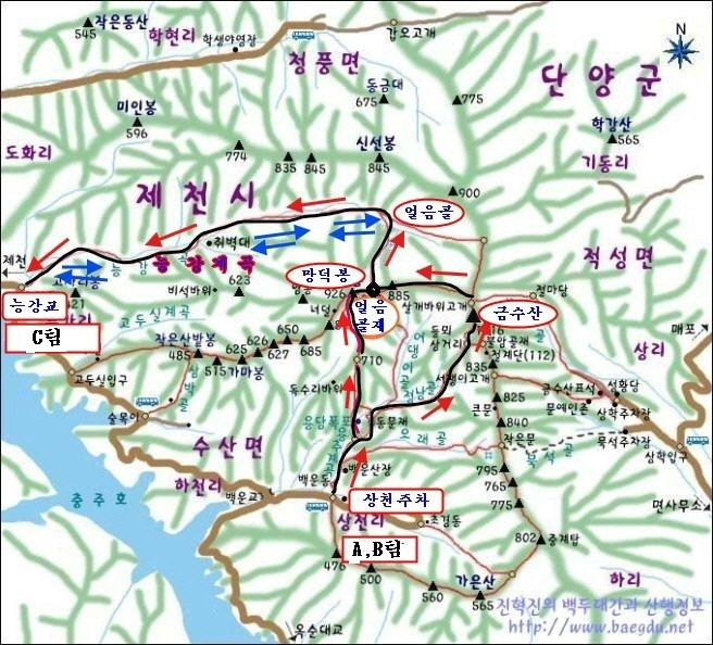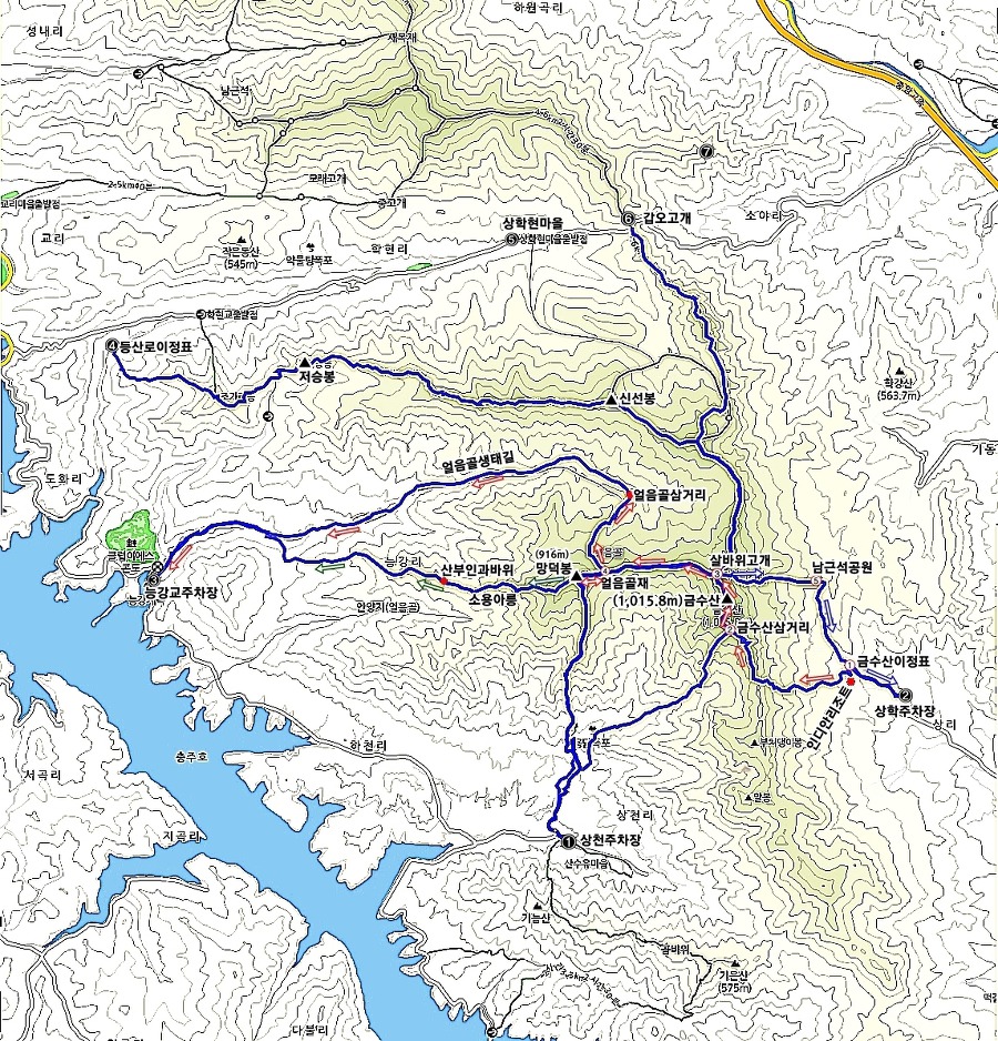 산행코스: 상천주차장→망덕봉갈림길→금수산삼거리→금수산→망덕봉삼거리→망덕봉(회귀)→얼음골재→한양지쉼터→취벽대→능강교(11km, 5시간 30분)