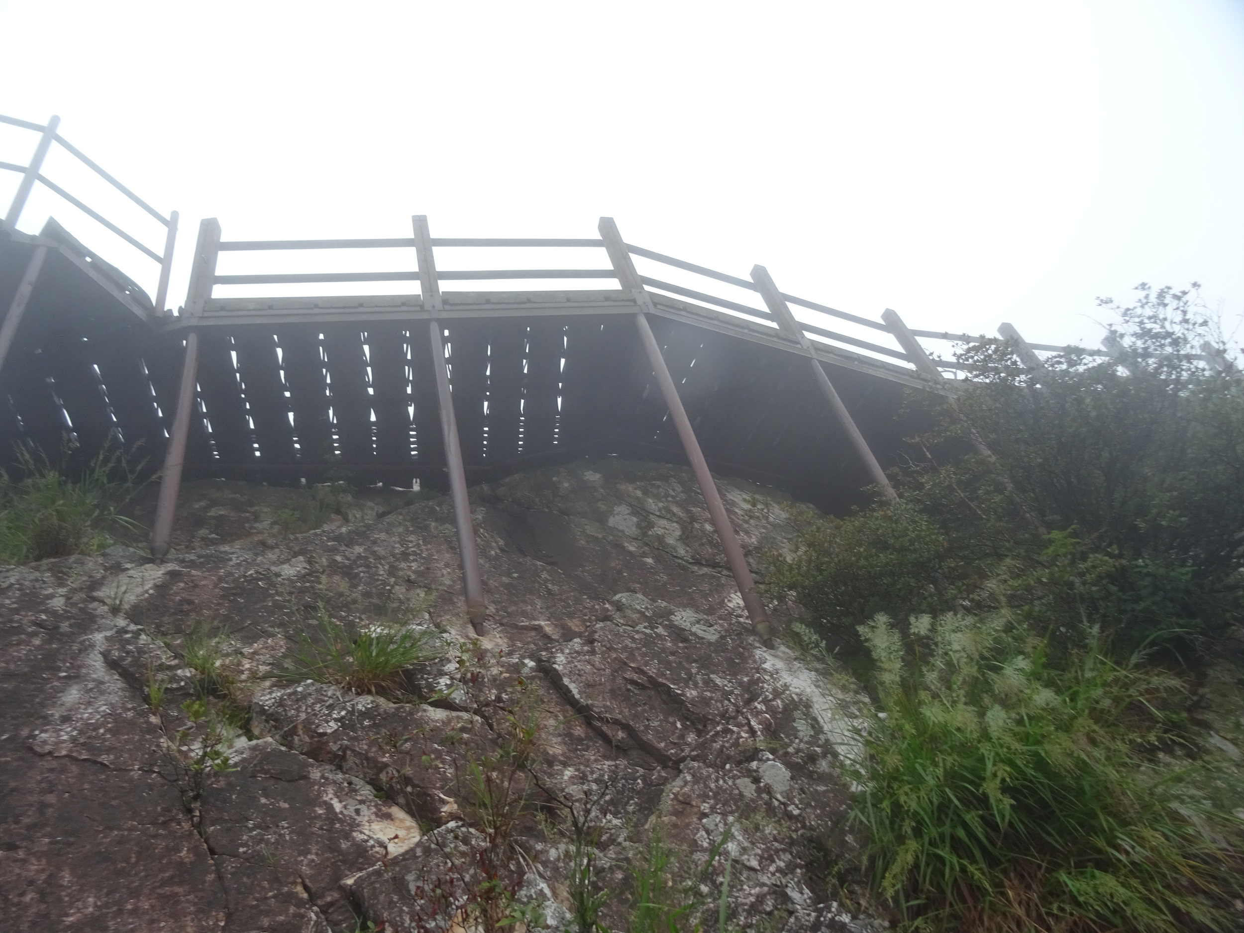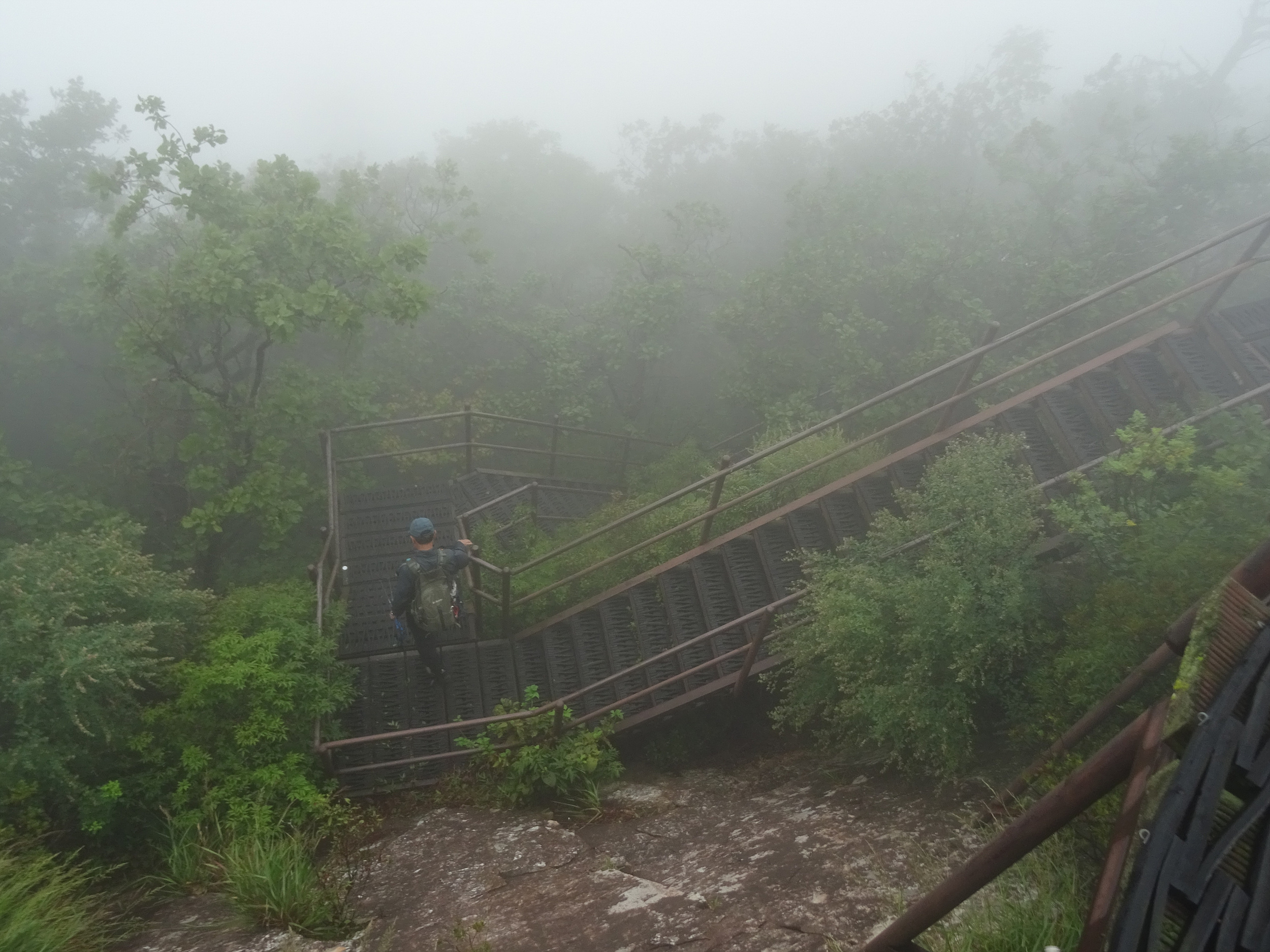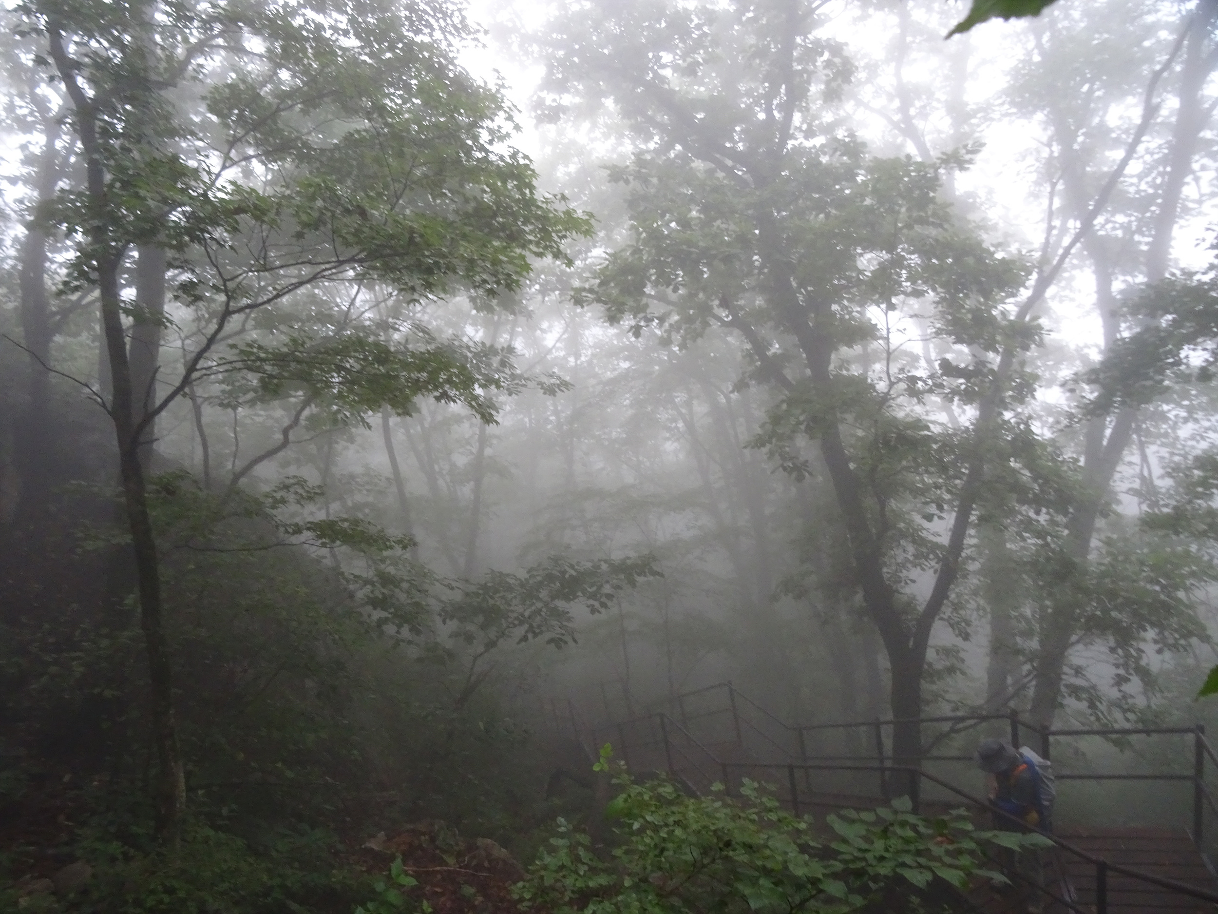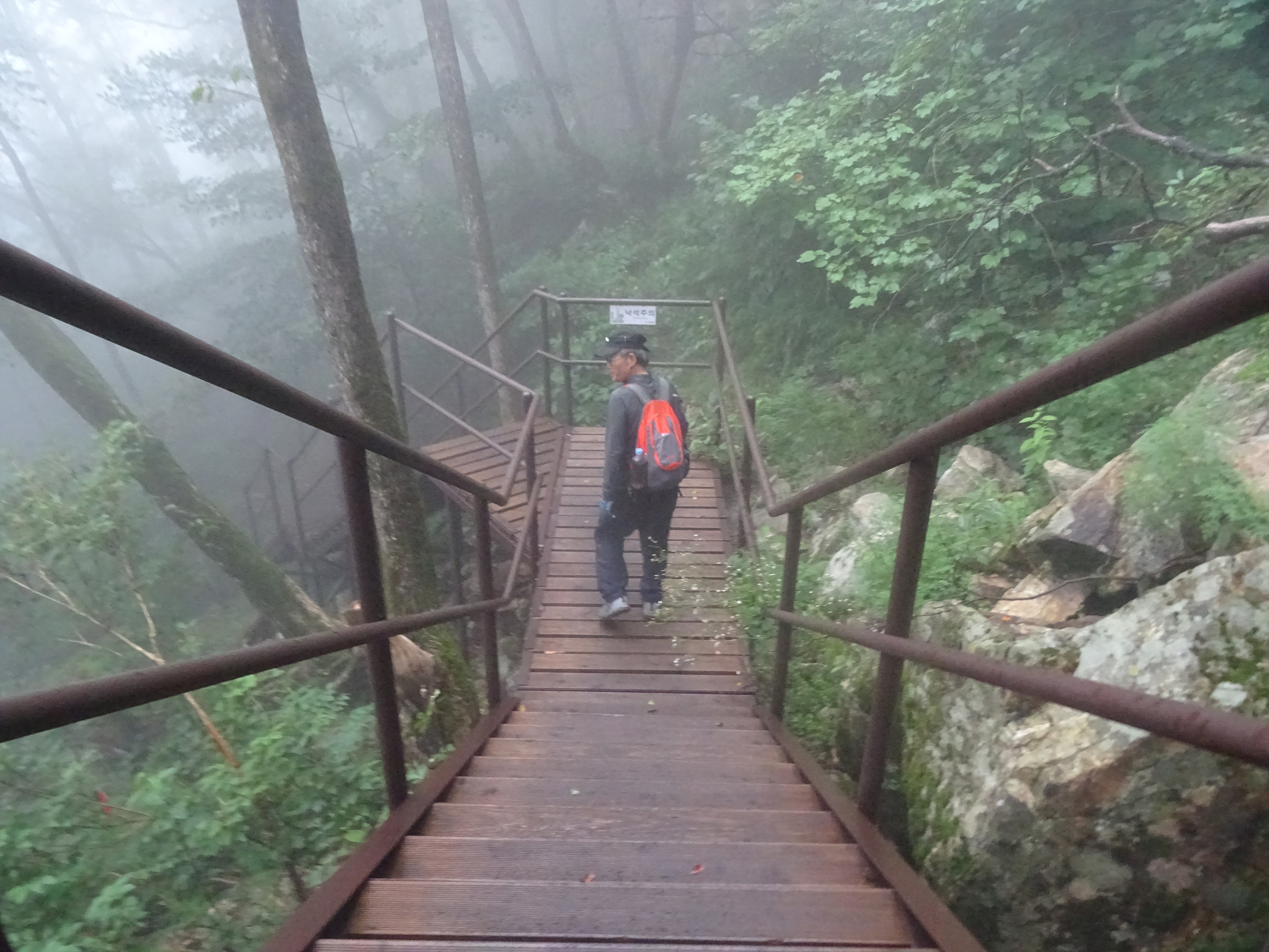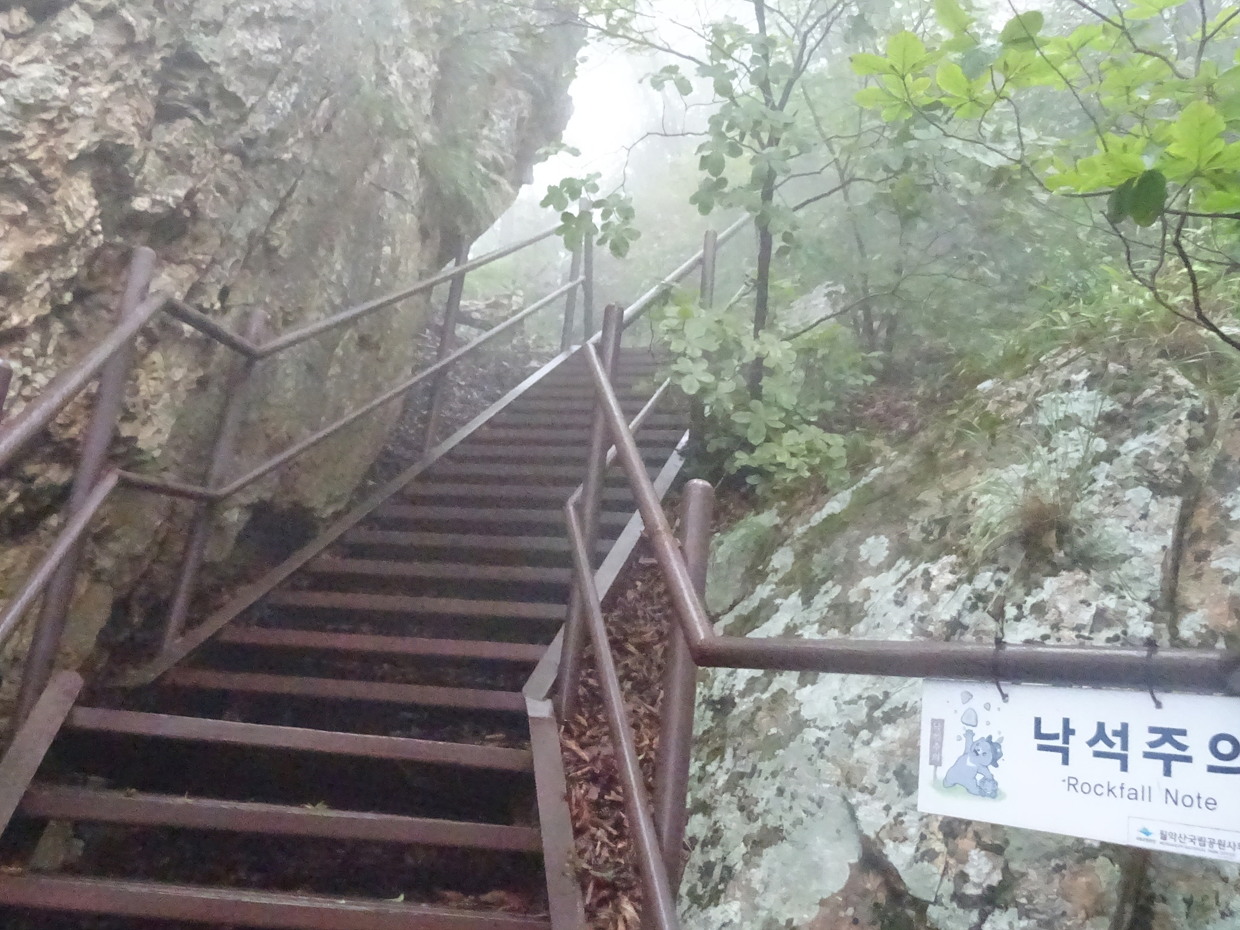 계단 왼쪽으로 보이는 멋진 바위들도 안개에 가려서 희미합니다.