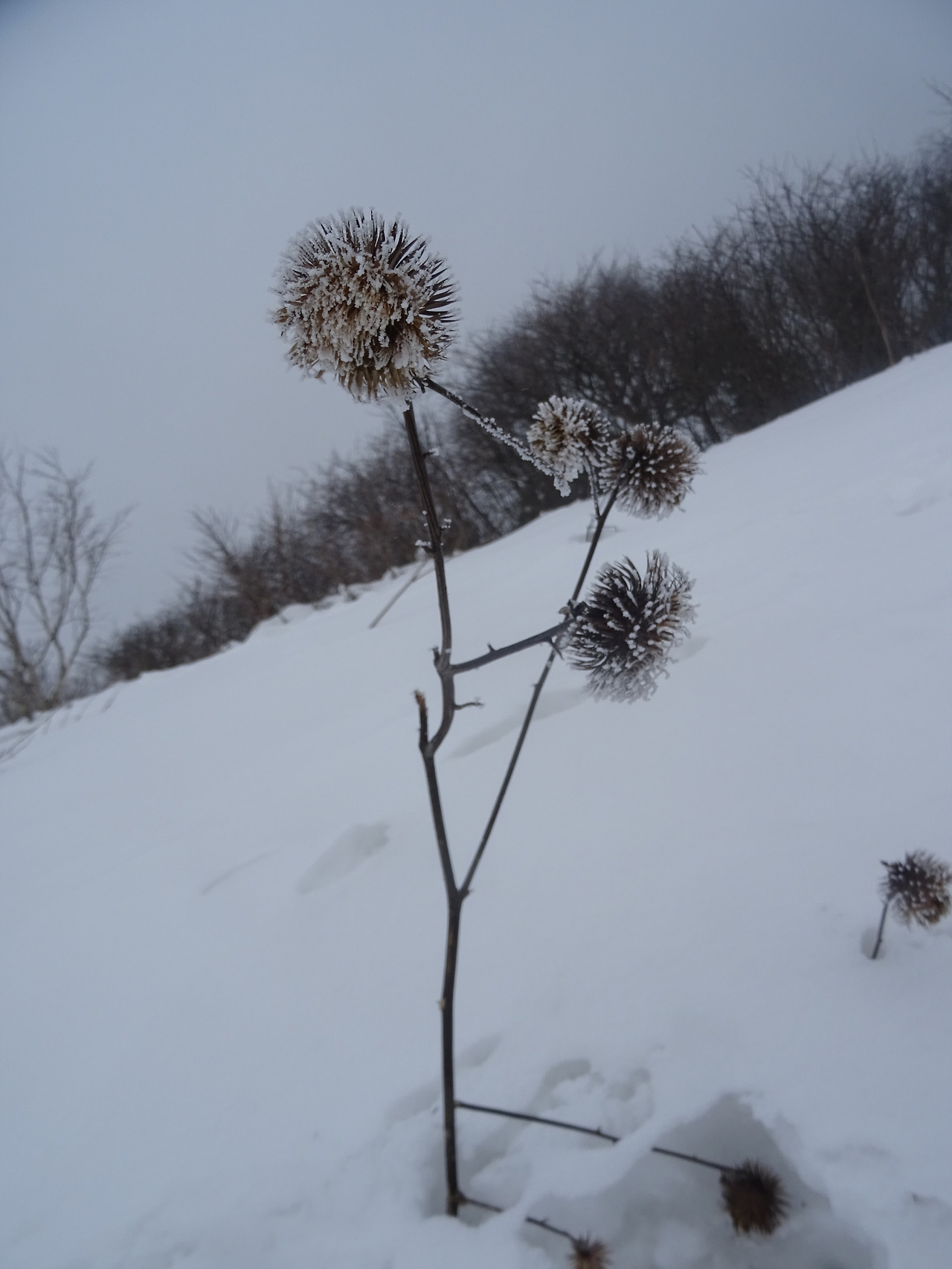 이 사진은 지난 2월 말 평창 계방산 눈밭에서 본, 꽃이 진 뒤의 수리취입니다.
