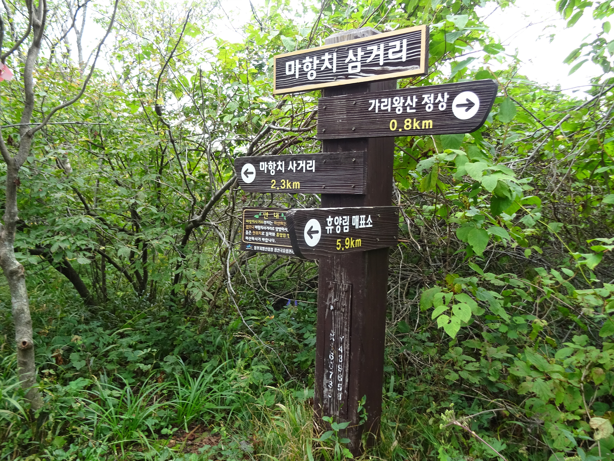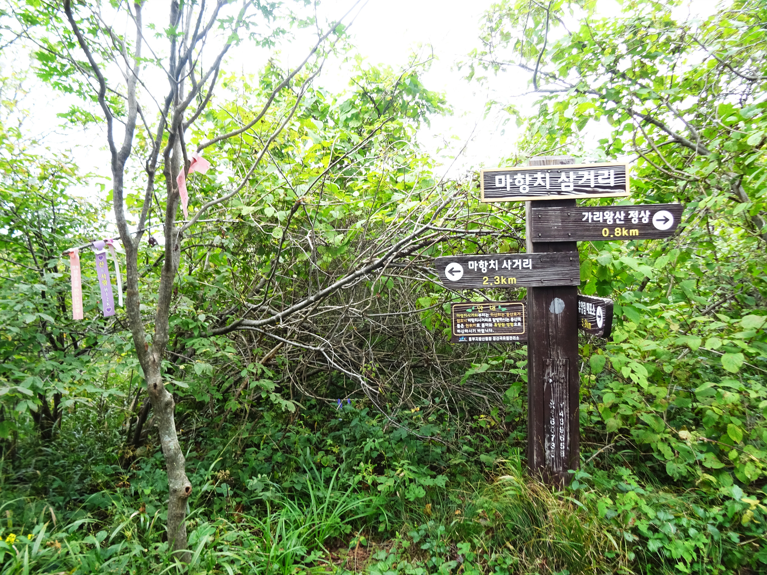 정상에서 800m를 내려오면 마항치 삼거리에 도착하는데, 여기서 휴양림은 이정표 정면에 보이는 내리막으로 가야 합니다.