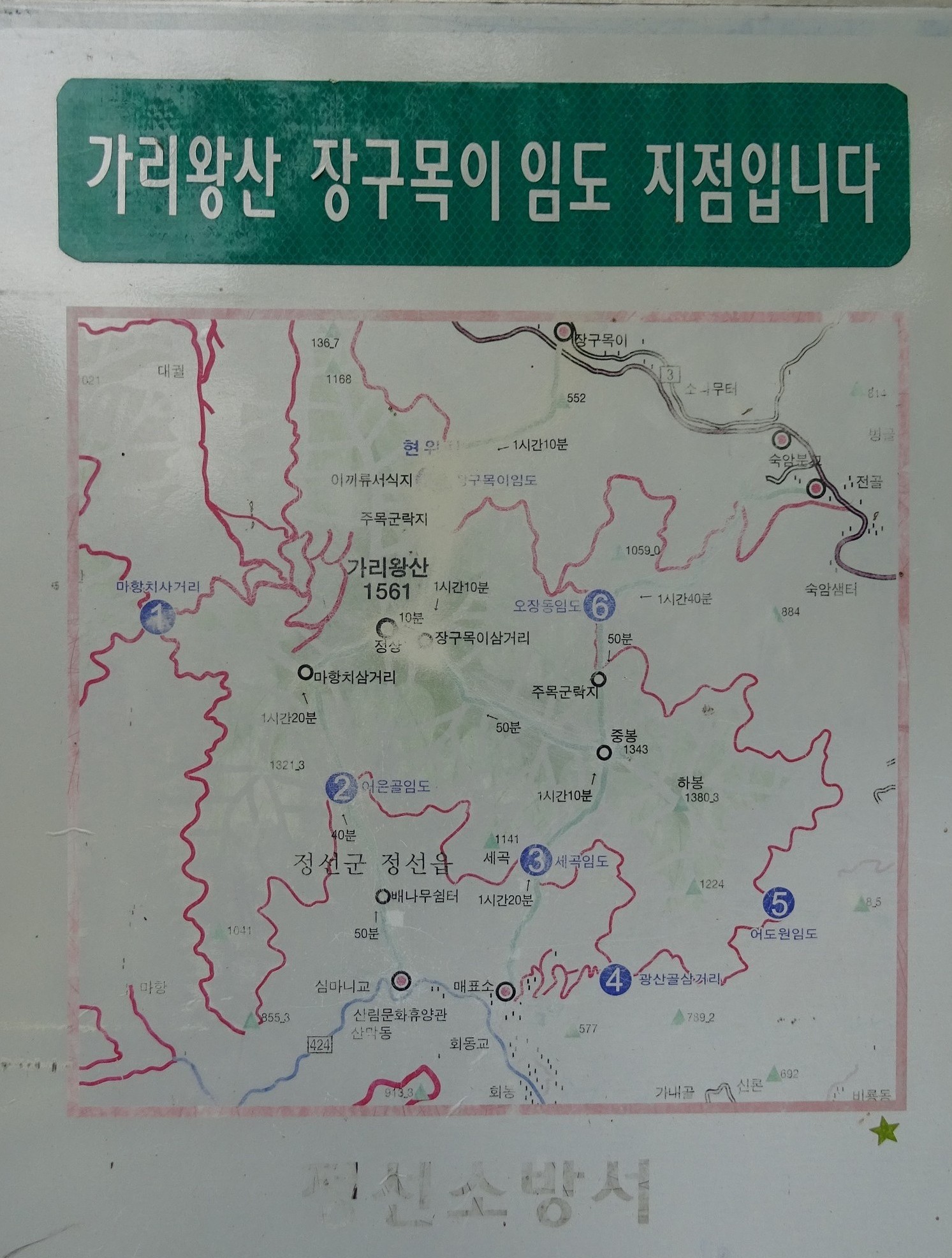 정선군 북평면 숙암리 산400-22 장구목이에서 산행은 시작됩니다.