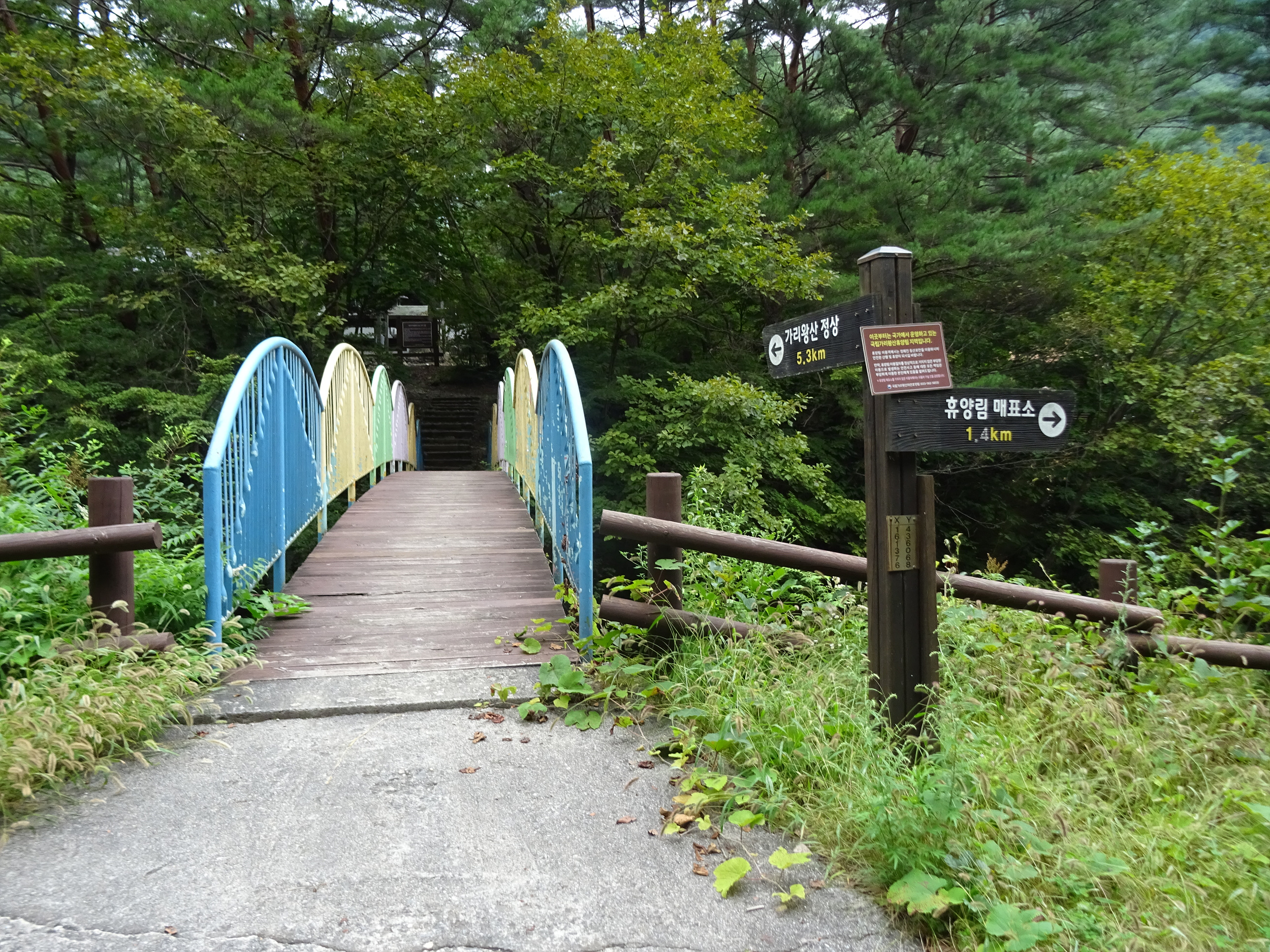 휴양림 건물쪽으로도 길이 있어 그리로 가도 되지만 곧 바로 앞으로 가, 예쁘고 작은 다리를 건넙니다.