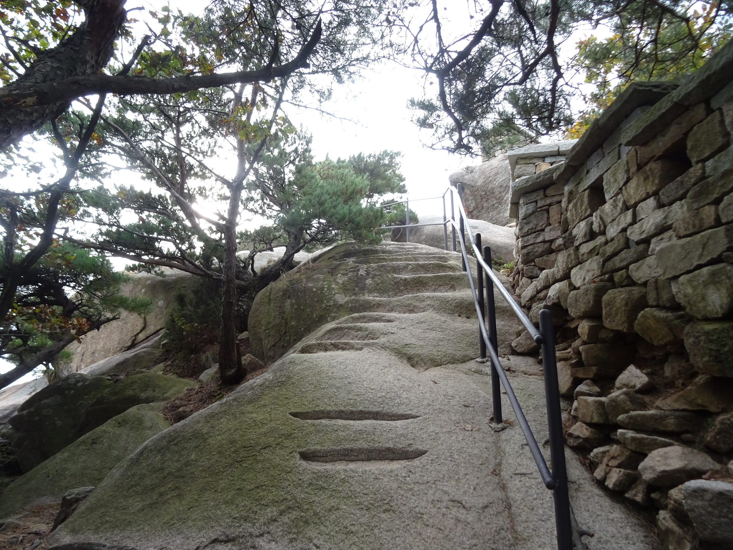 왼쪽의 소나무가 있는 옆에, 바위를 쪼아 만든 희미한 계단이 있어 그리로 내려갑니다.