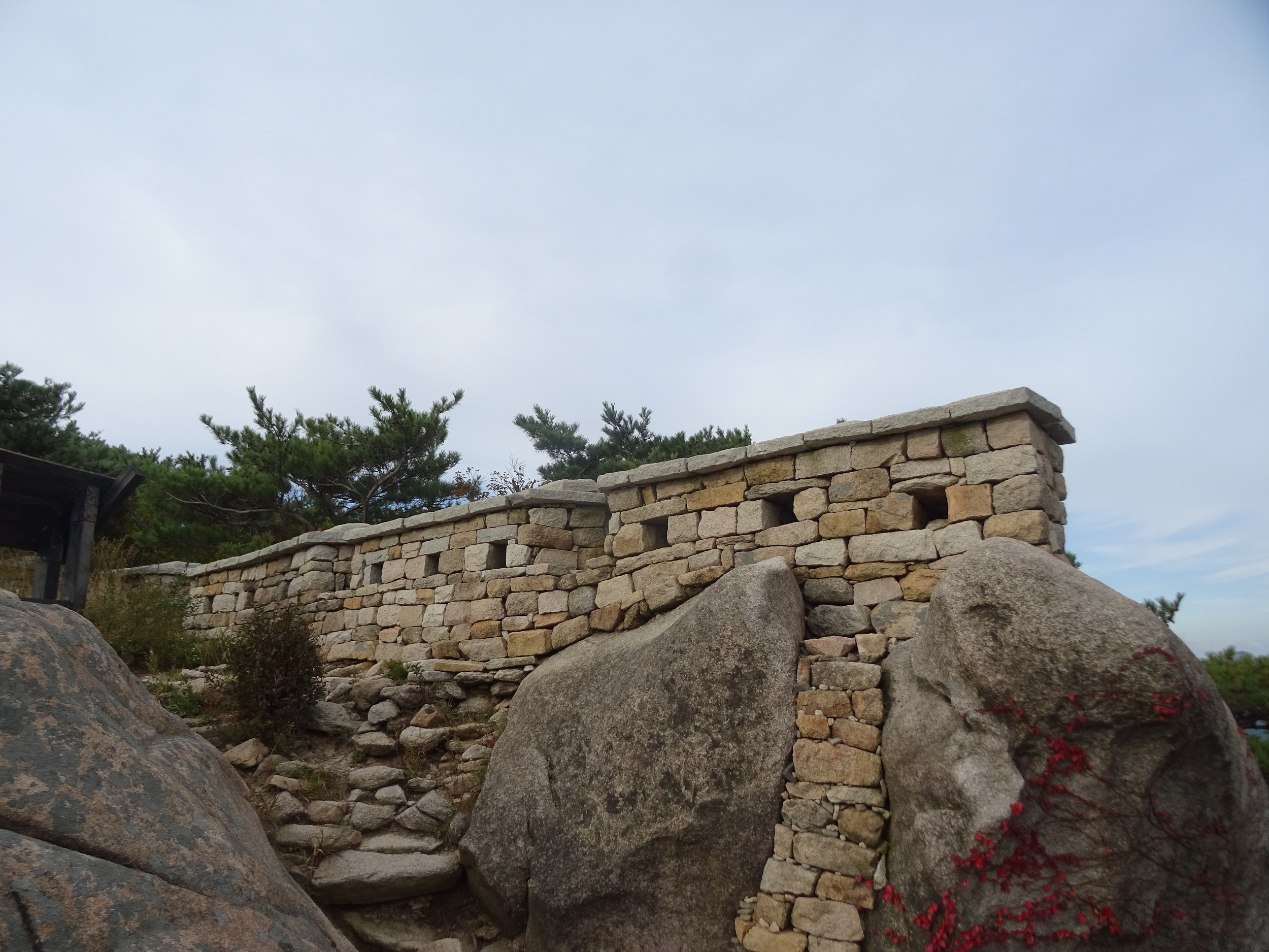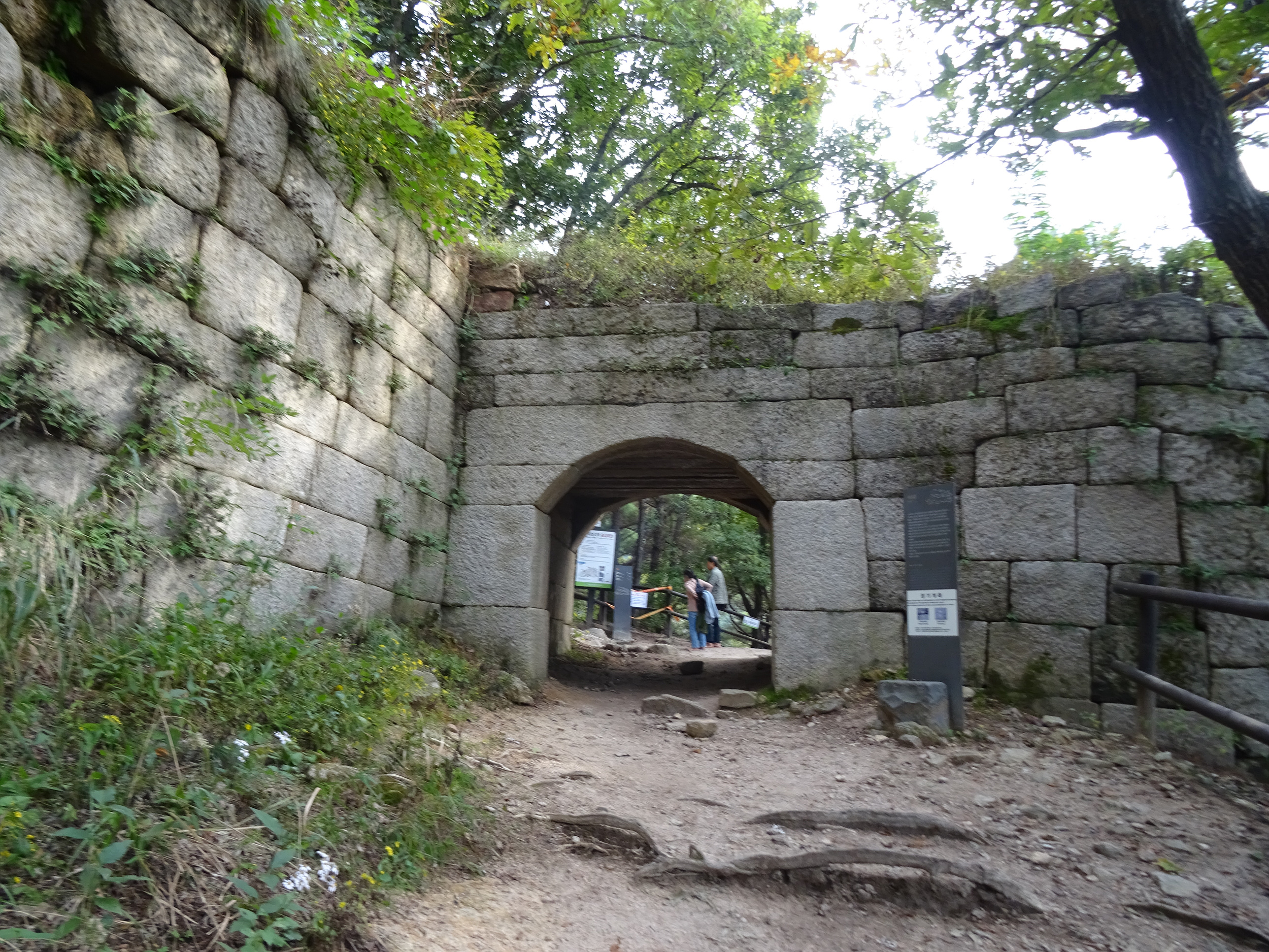 성벽은 평지, 산지, 봉우리 등 지형에 따라 계곡부는 온전한 높이로 쌓고, 지형이 가파른 곳은 그보다 낮거나 여장(女墻)을 올리는 등 높이를 달리하여 쌓았다고 하죠. 성벽의 높이를 지형에 따라 달리한 점, 성문의 여장을 한 장의 돌로 만든 점, 옹성과 포루를 설치하지 않은 것, 성을 이중으로 쌓은 것 등은 다른 산성과 다른 북한산성만의 특징이랍니다.