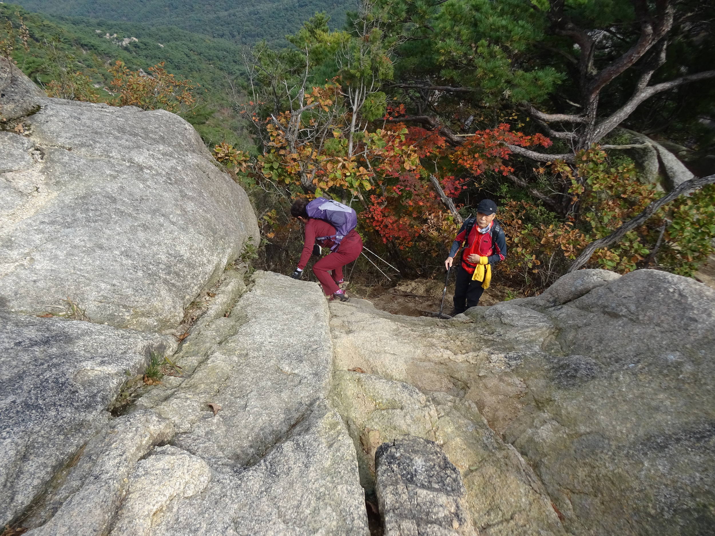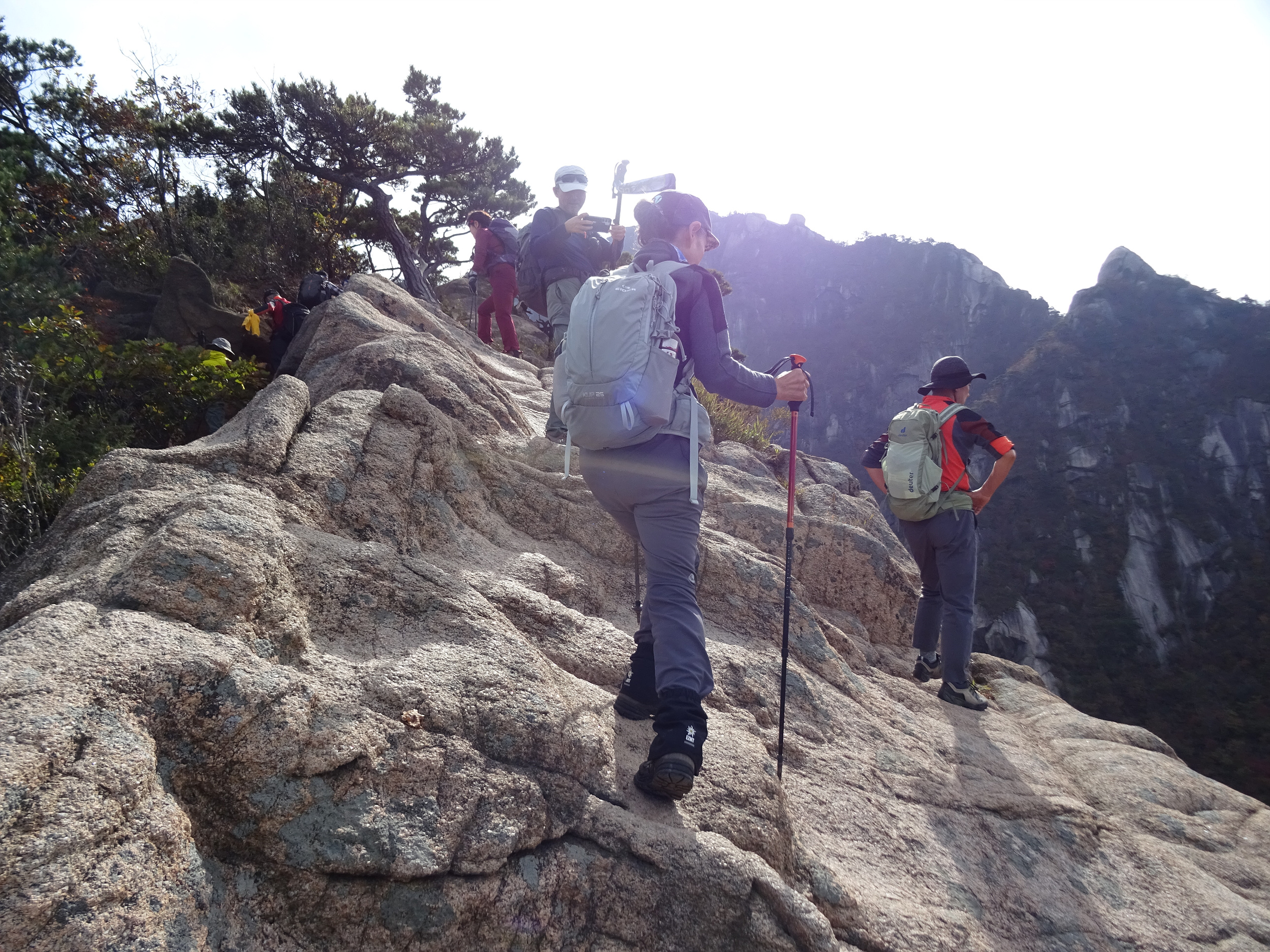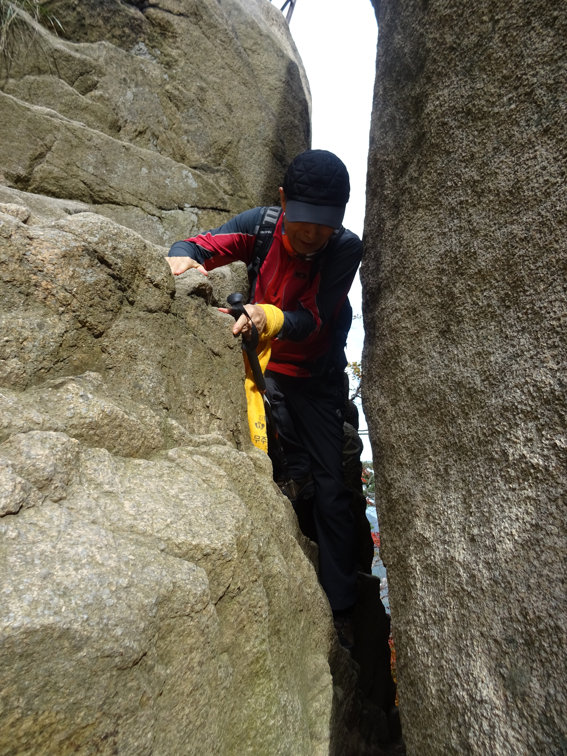 바위틈에 낑겨서 애를 먹는데 먼저 빠져나간 일행이 배낭을 받아줘서 겨우 빠져나갑니다.