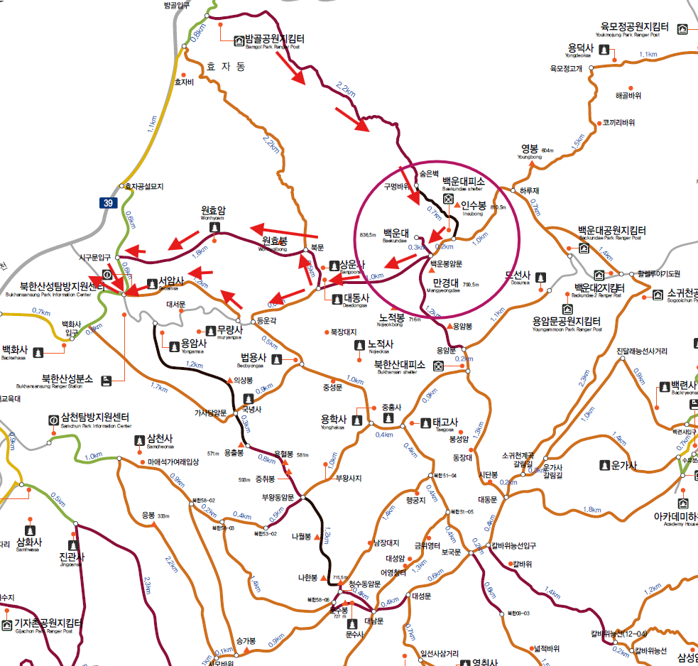 오늘의 산행코스는 밤골공원지킴터를 들머리로 해서 숨은벽을 지나 백운대까지 올랐다가 북한산성탐방지원센터로 내려 갈 요량입니다.