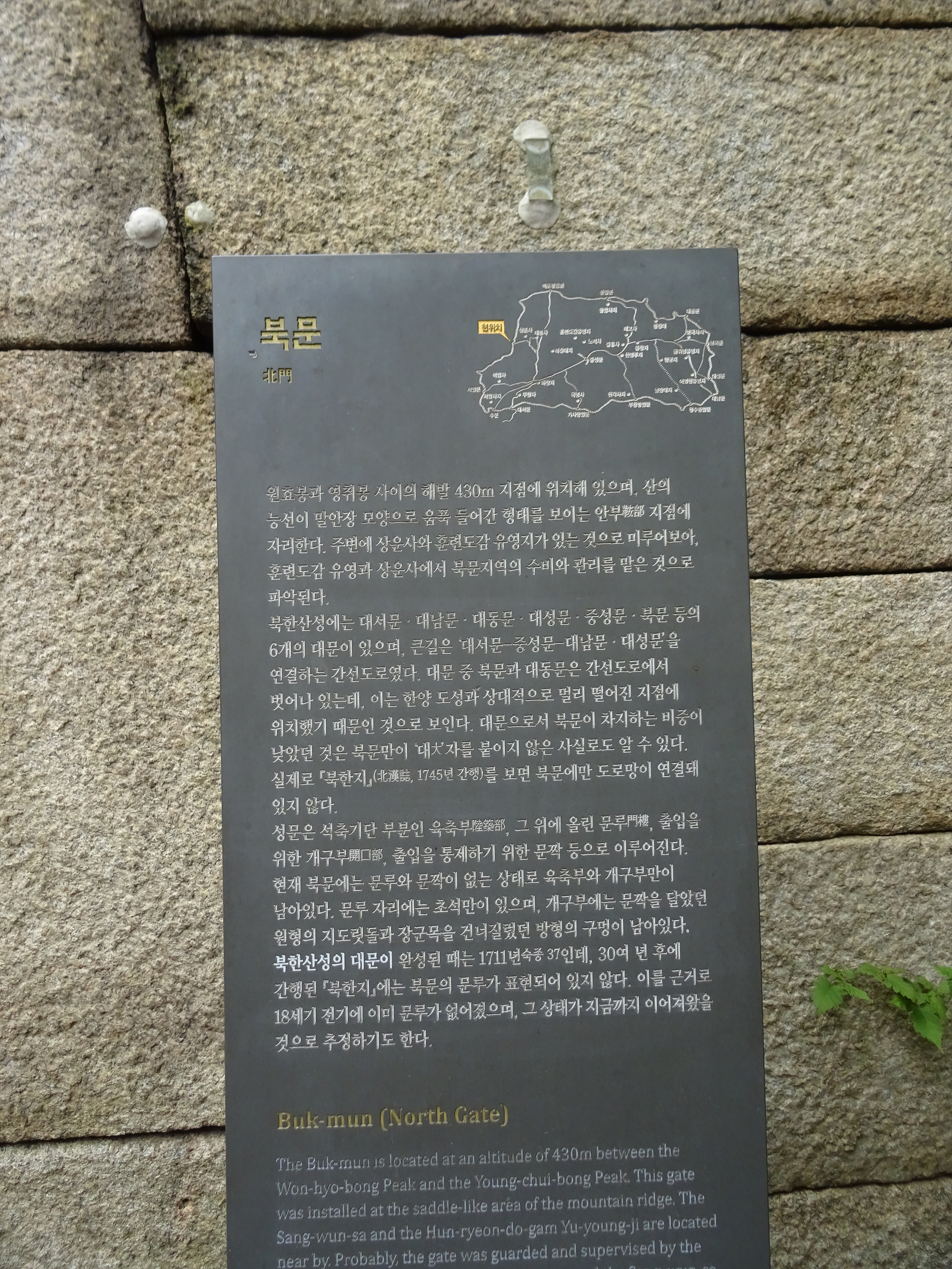 해발 430m의 능선 안부에 있는 북문은, 훈련도감 유영과 상운사에서 북문지역의 수비와 관리를 맡았던 것으로 추정한답니다.