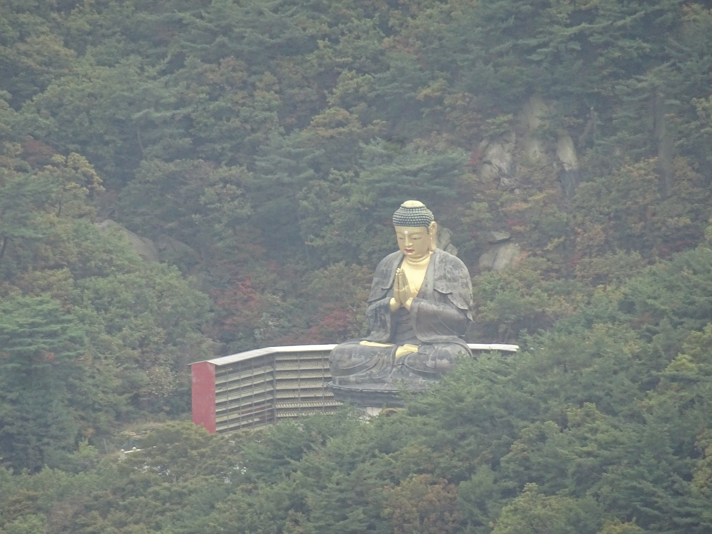 동쪽으로 보면 산 중턱에 불상이 보입니다. 어느 절(寺)인지 모르지만 불상만 보여요.
