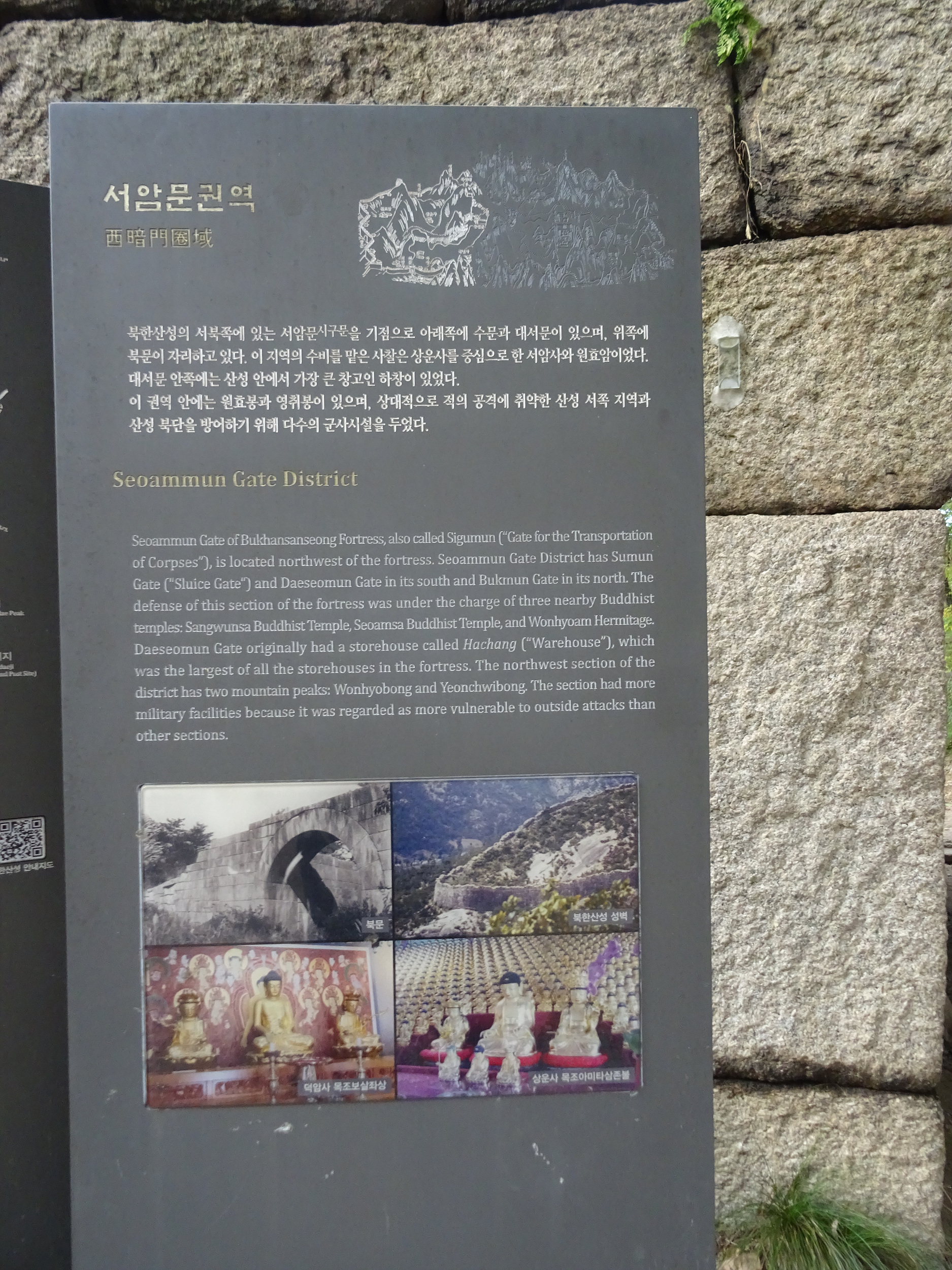 서암문은 1711년 북한산성을 축조하면서 설치한 8개의 암문(巖門) 중 하나로, 비상시에 병기나 식량을 반입하는 통로였으며 구원병의 출입로로 활용되었다고 합니다. 城안의 시신을 내보내던 시구문(屍口門)이기도 했구요.