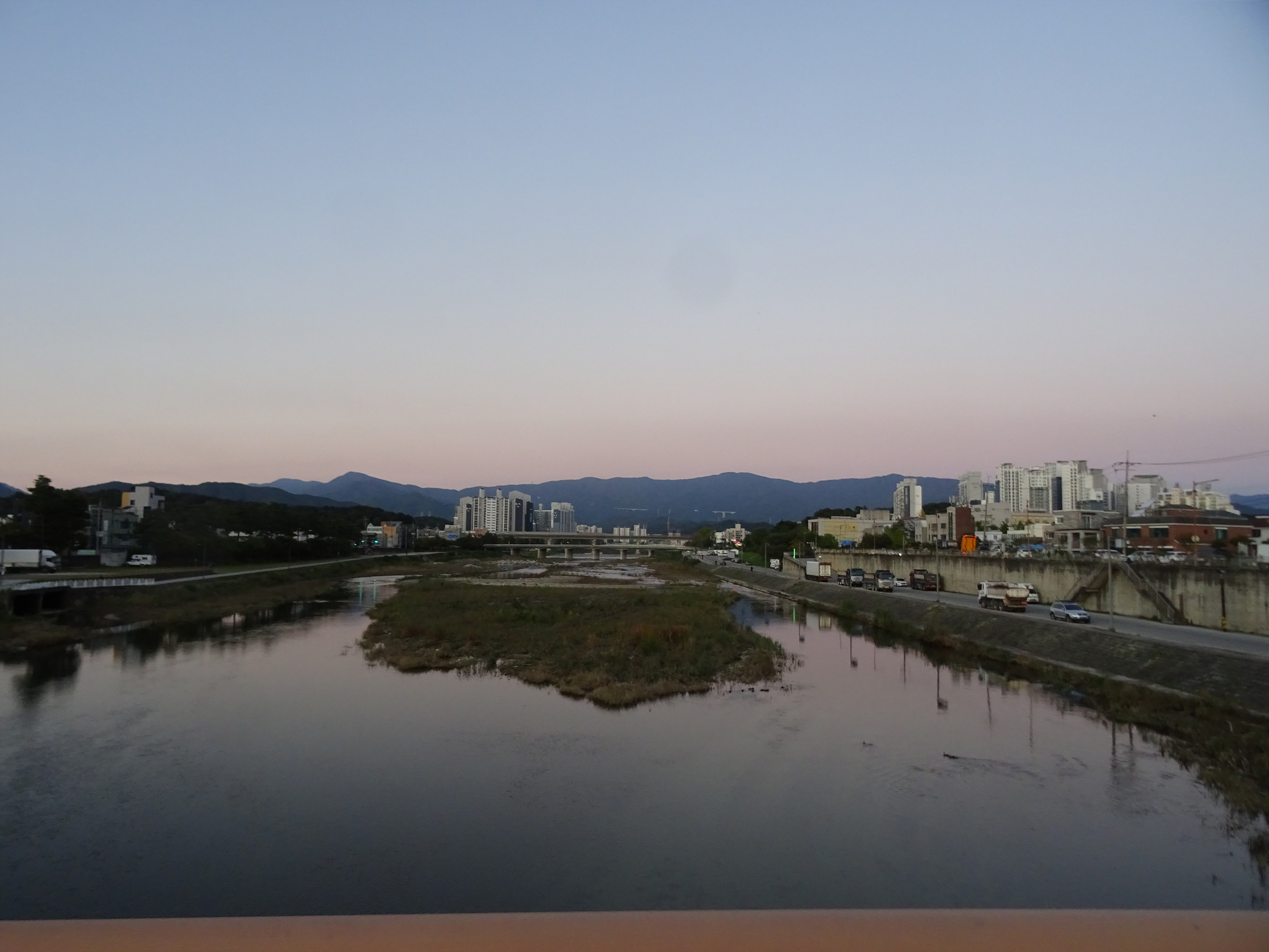 다리위에서 바라보는 동해쪽은 먼동이 터오느라 주황색으로 물들고, 강물은 찰랑 찰랑 흐르고 있습니다.