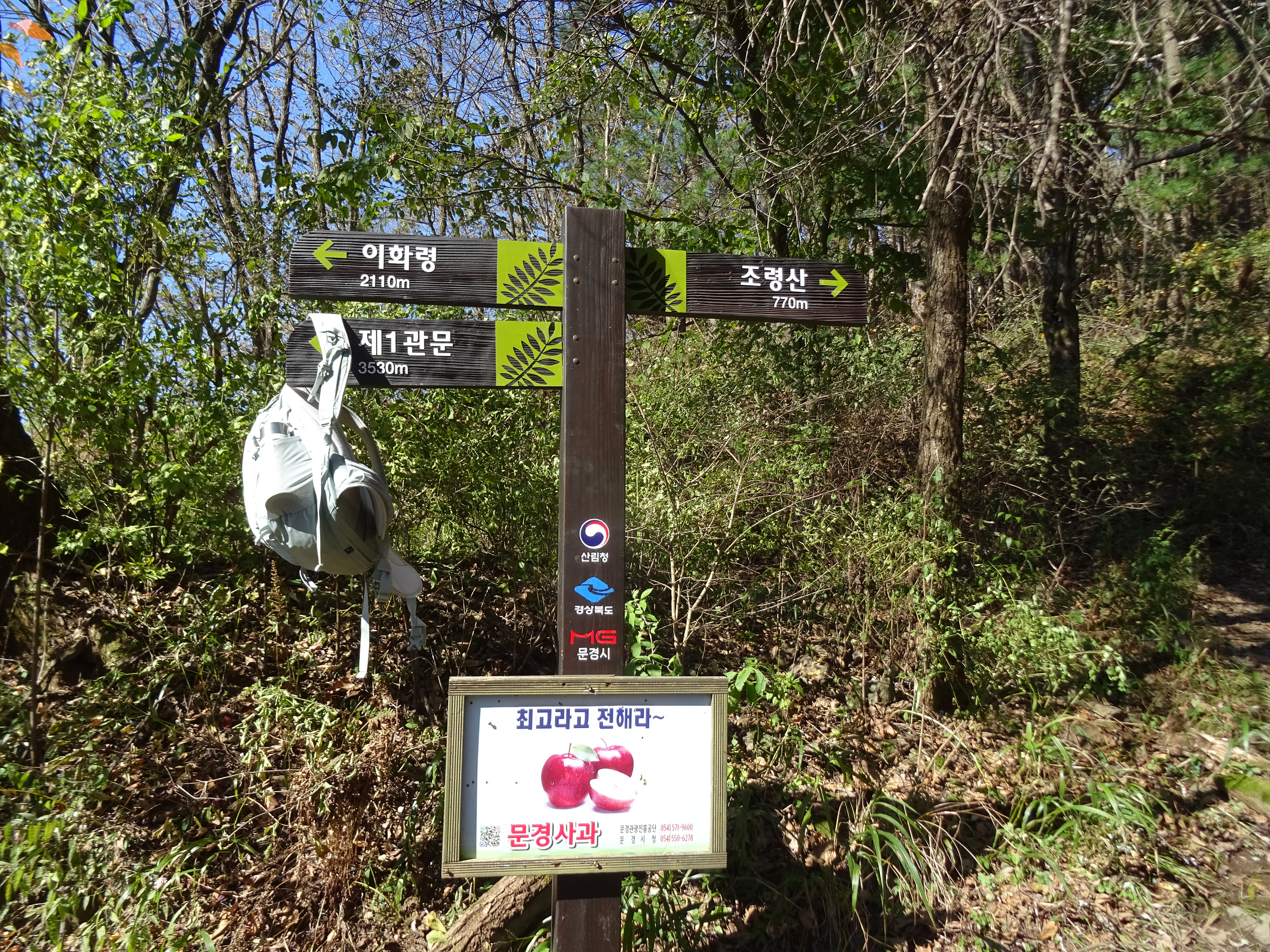 문경은 사과가 유명합니다. 문경 사과가 맛있는 건 중산간지방의 높은 일교차와 비옥한 땅, 깨끗한 환경으로 인해 사과는 육질이 단단하고 당도가 높아서 사과를 명품으로 만들기 때문인데, 문경지역 등산로 곳곳에는 사과홍보 안내판이 부착되어 있으며, 등산로에 지역 특산품 홍보안내를 하는 것도 문경만의 독특한 홍보 방법입니다.