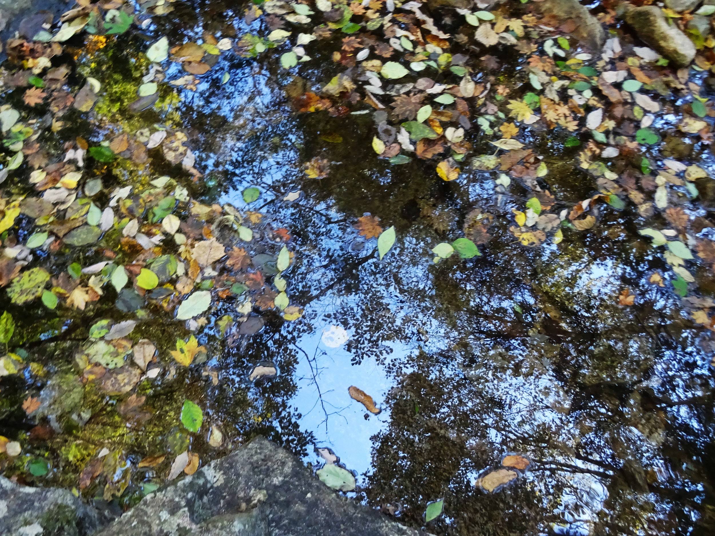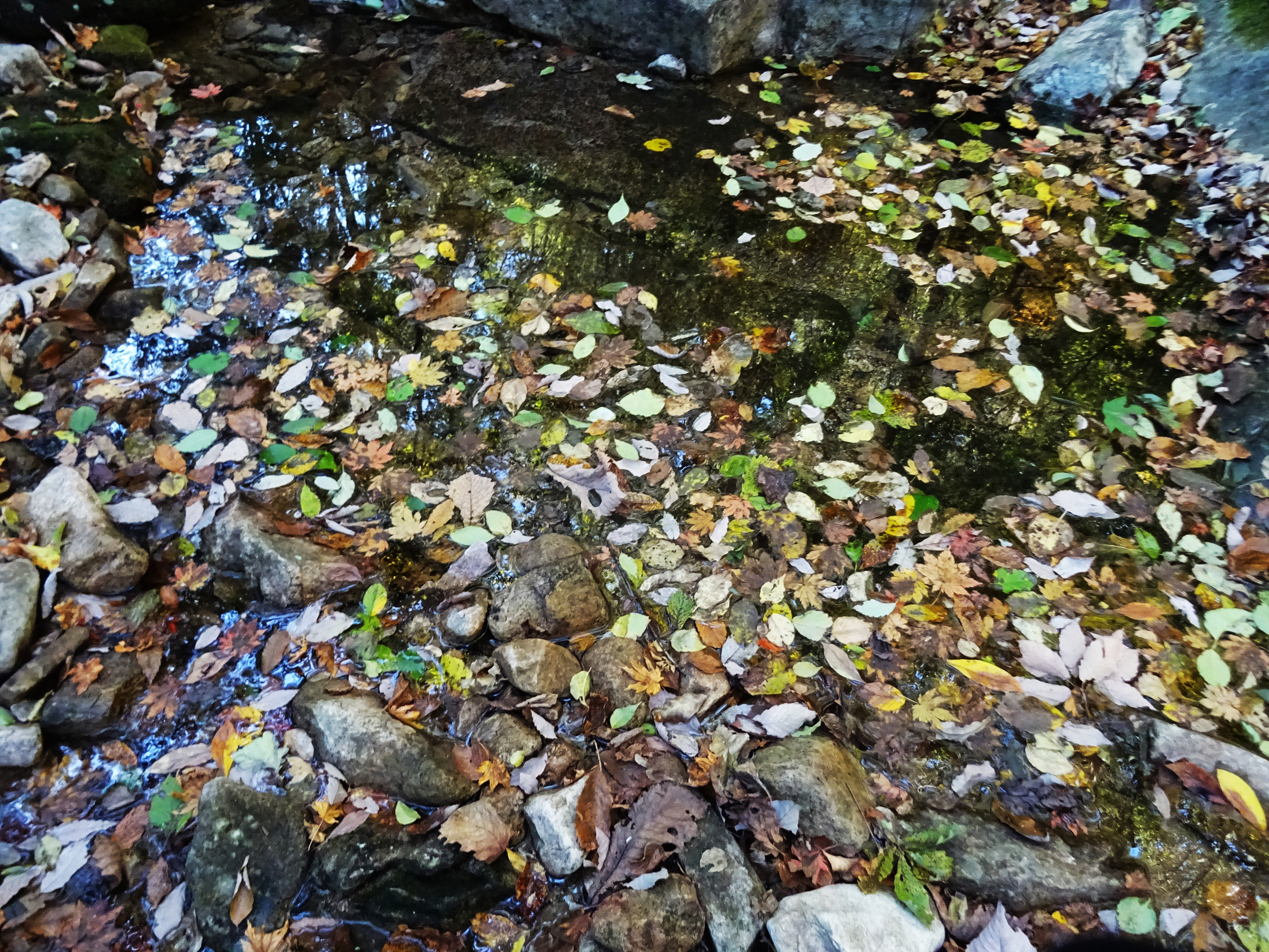 웅덩이처럼 고여있는 개울물에 떠 다니는 나뭇잎들이, 다시 아름답게 보입니다.