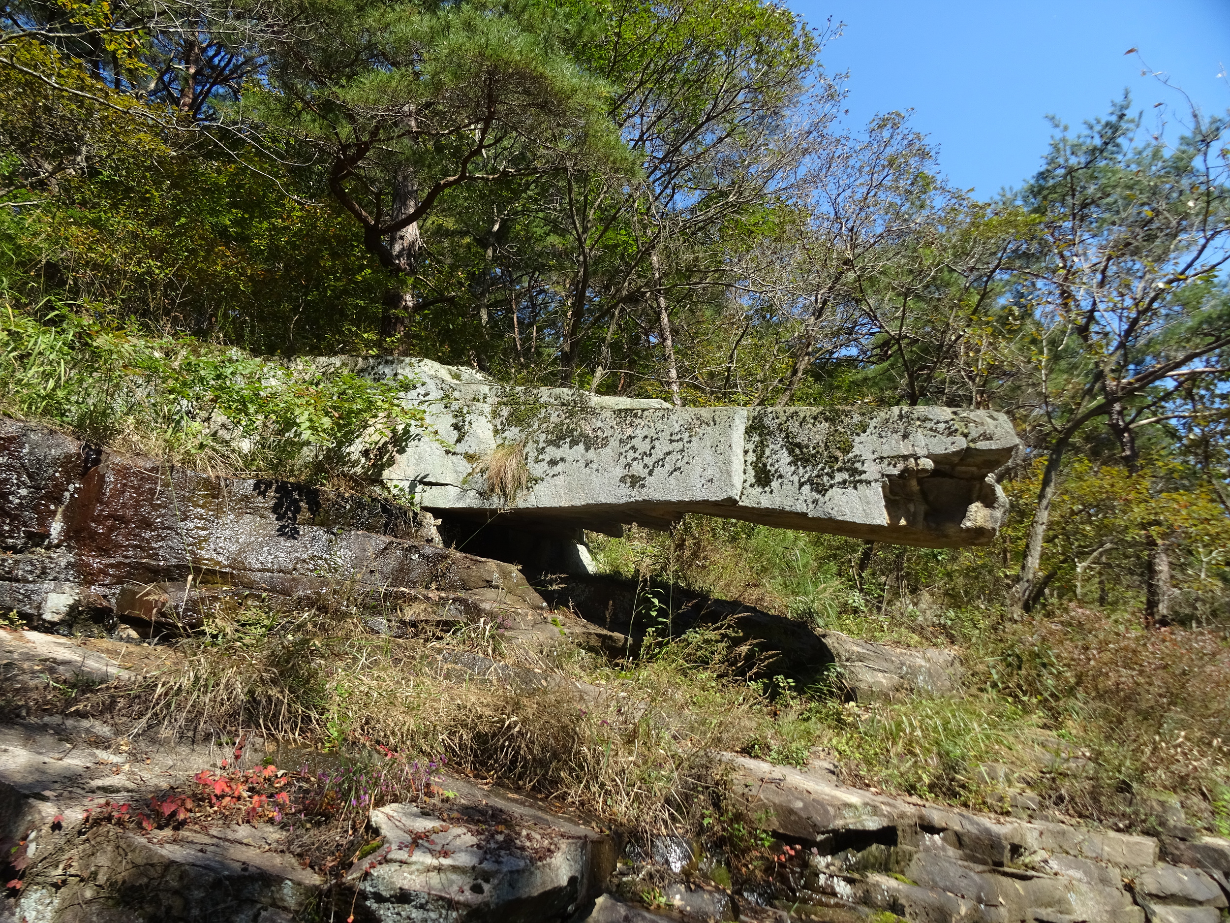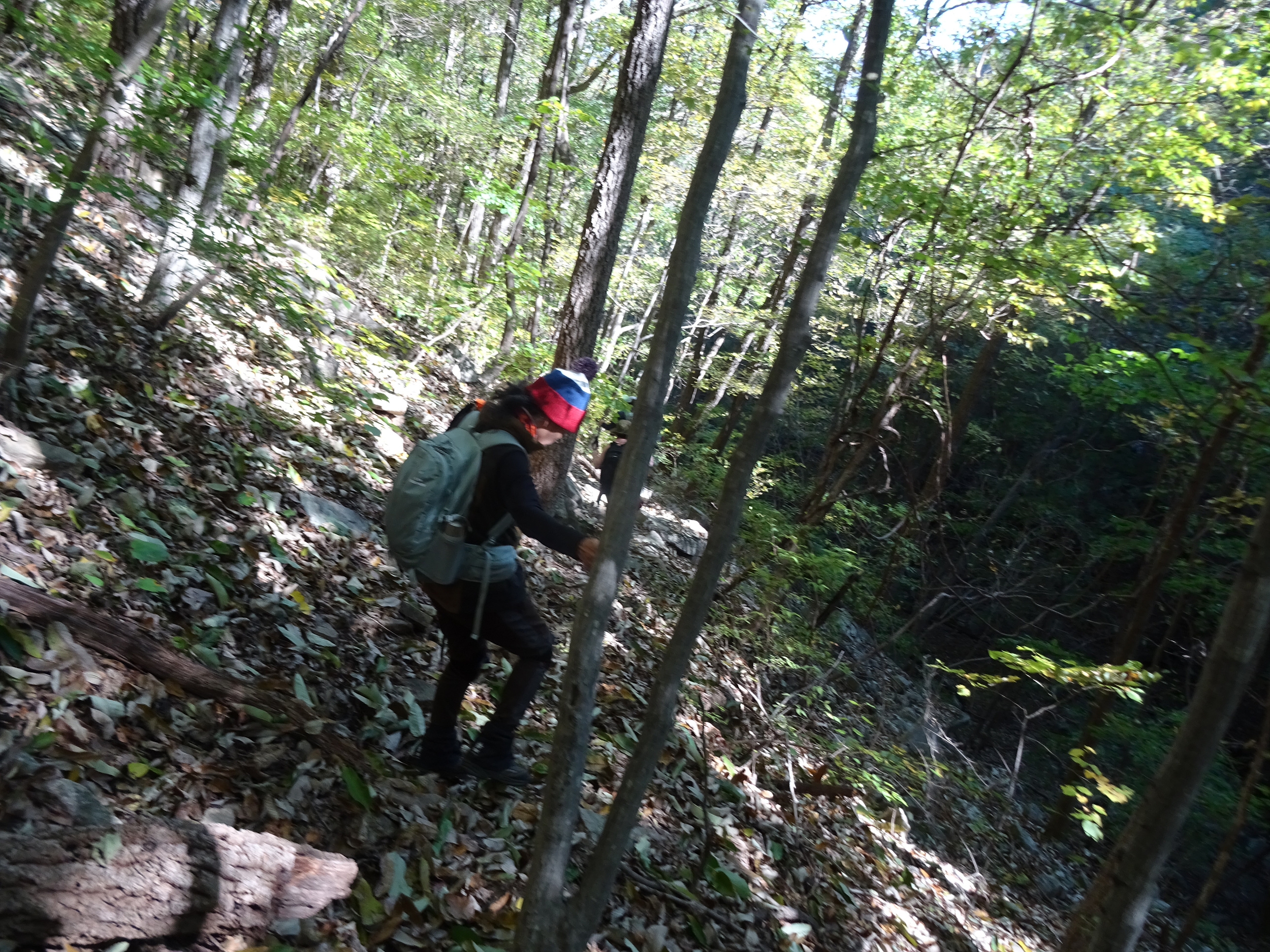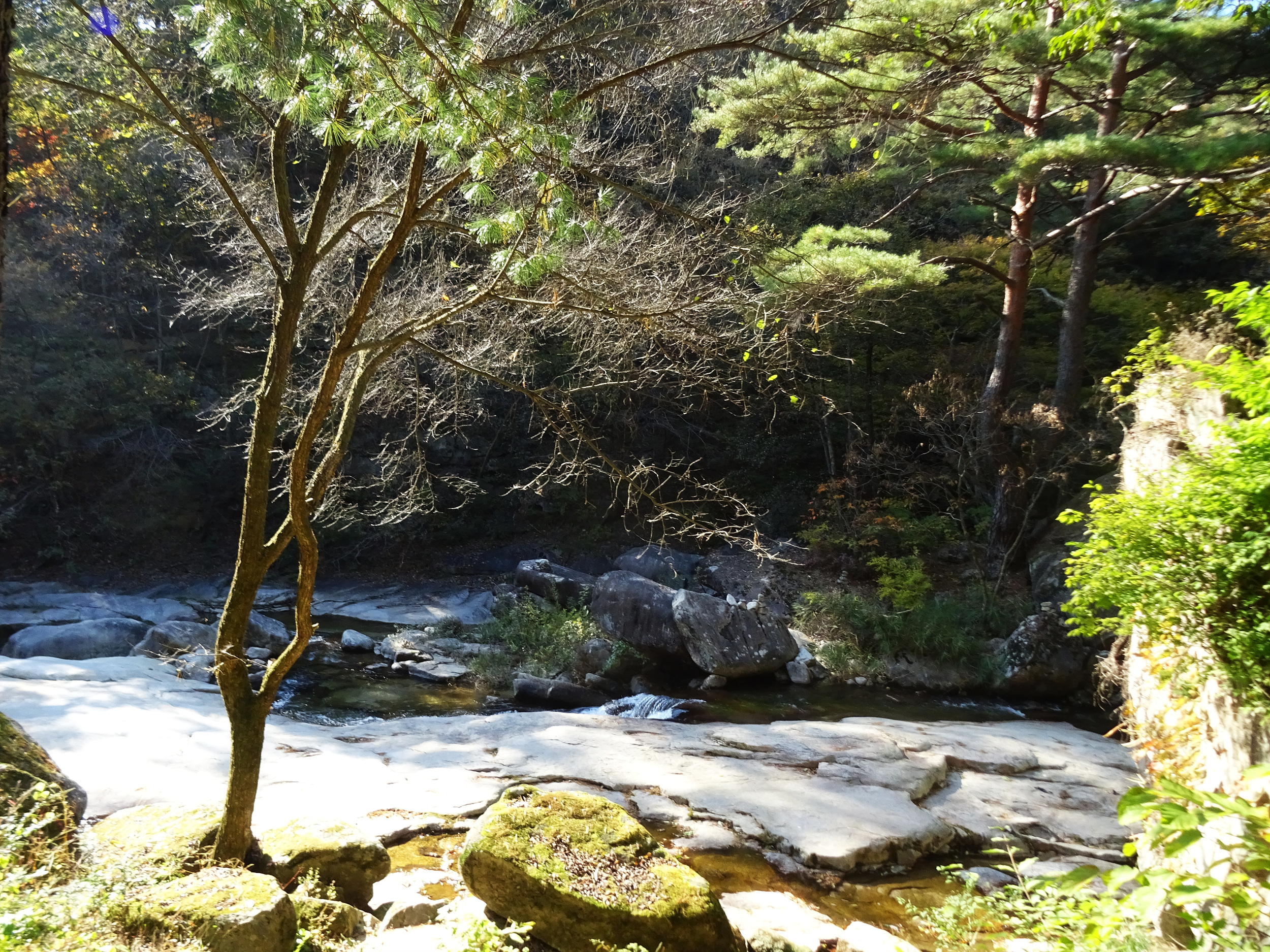 울퉁불퉁 삐죽삐죽한 돌을 딛고 내려오는 길은 진땀이 납니다. 마음놓고 디딜 수도 없는 너덜길은 낙엽에 덮힌데다 물기가 있어 쭈르륵 미끄러지며 개울물에 빠지기도 합니다.