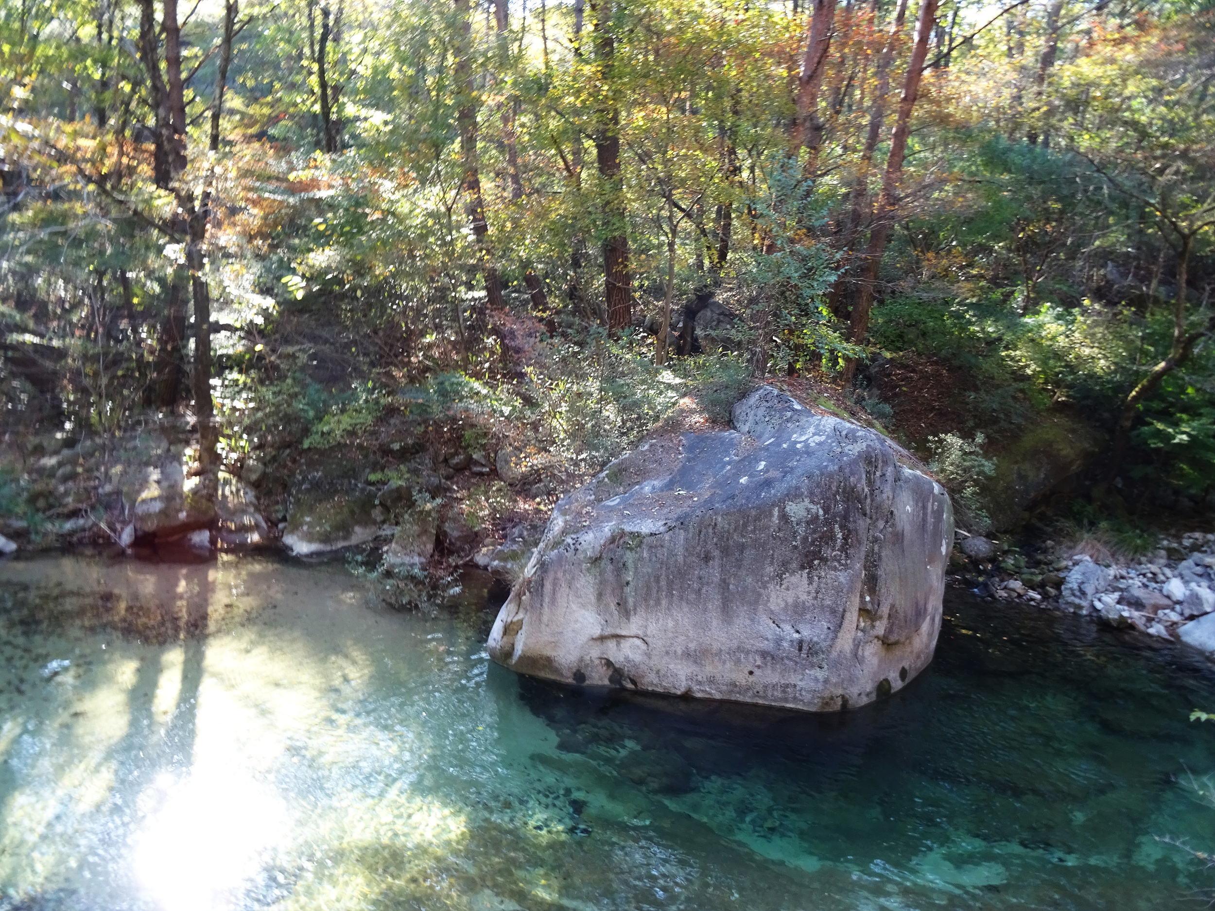 쉼터에서 조금 내려오면 개울가에 둥그스럼한 바위 하나가 눈에 띕니다. 꾸구리바위입니다.