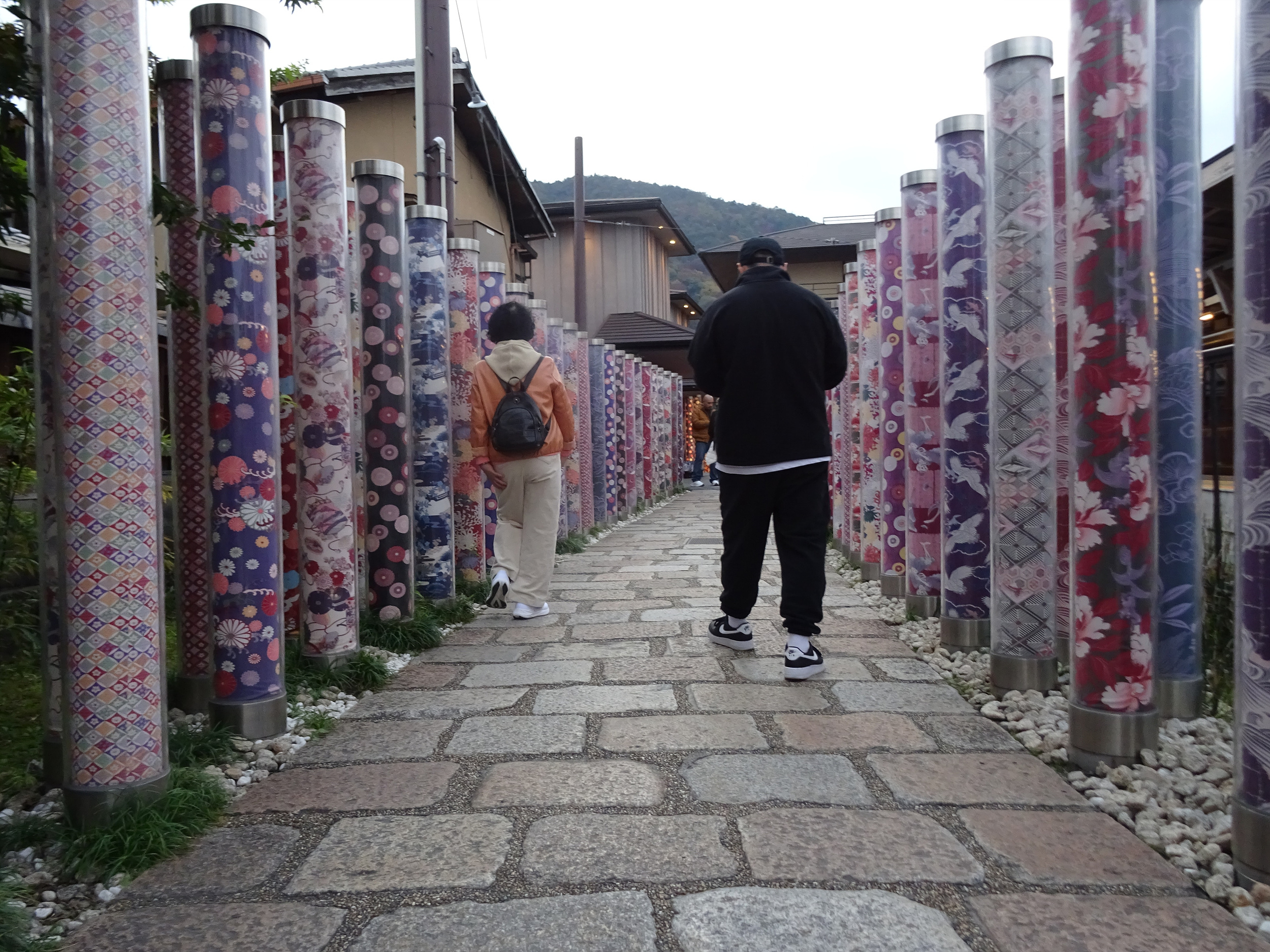 밤이 오고 조명이 들어오면 원통의 불빛과 저마다 다 다른 기모노 문양들이 예쁜모습을 뽐내는 기모노 숲.