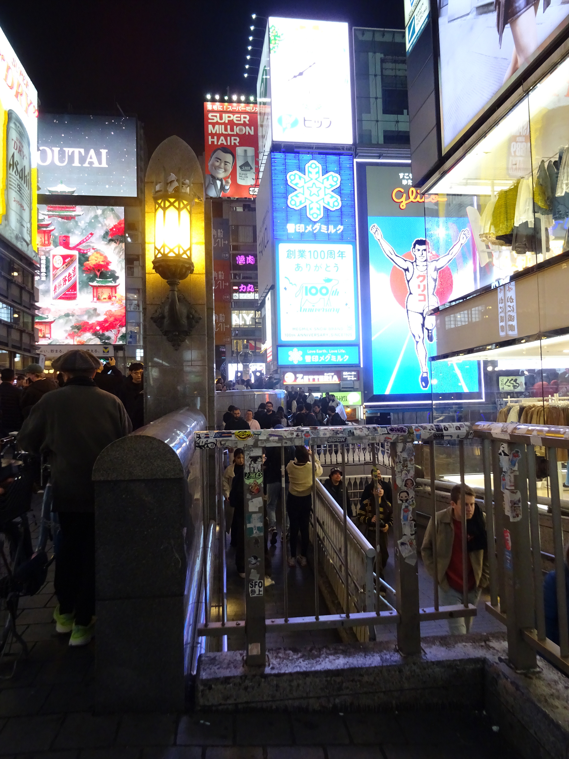 광고판 중에도 우리에게 친숙한 게 하나 있죠. 바로 글리코 상인데요, 20년쯤인가 우리나라 TV에도 소개된 적이 있어 다 알고 있는 그 '글리코 상' 전광판이 있는 '에비스바시'로 인파를 뚫고 갑니다.