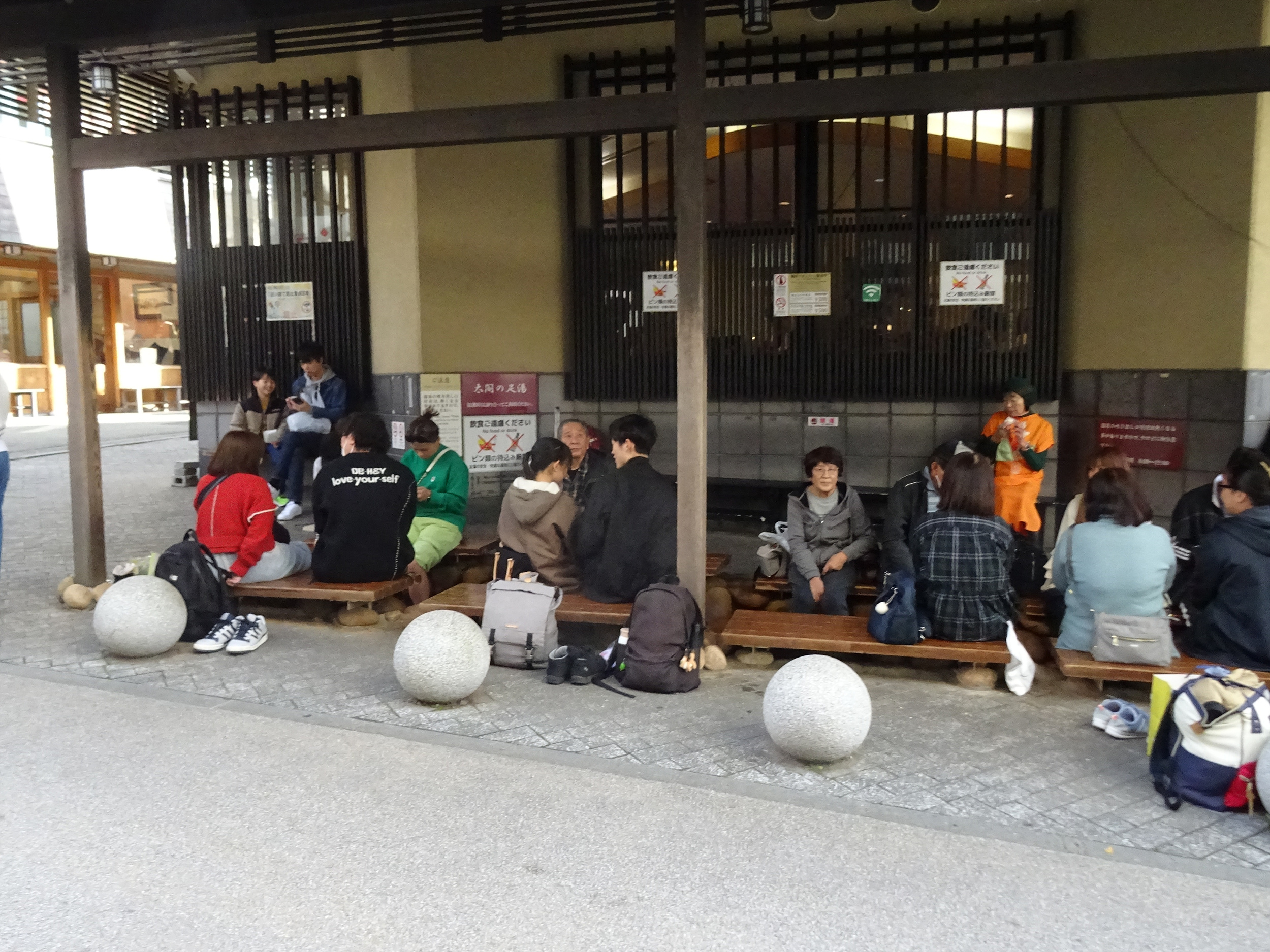 온천 건물 밖 족욕탕에 있는 사람들.