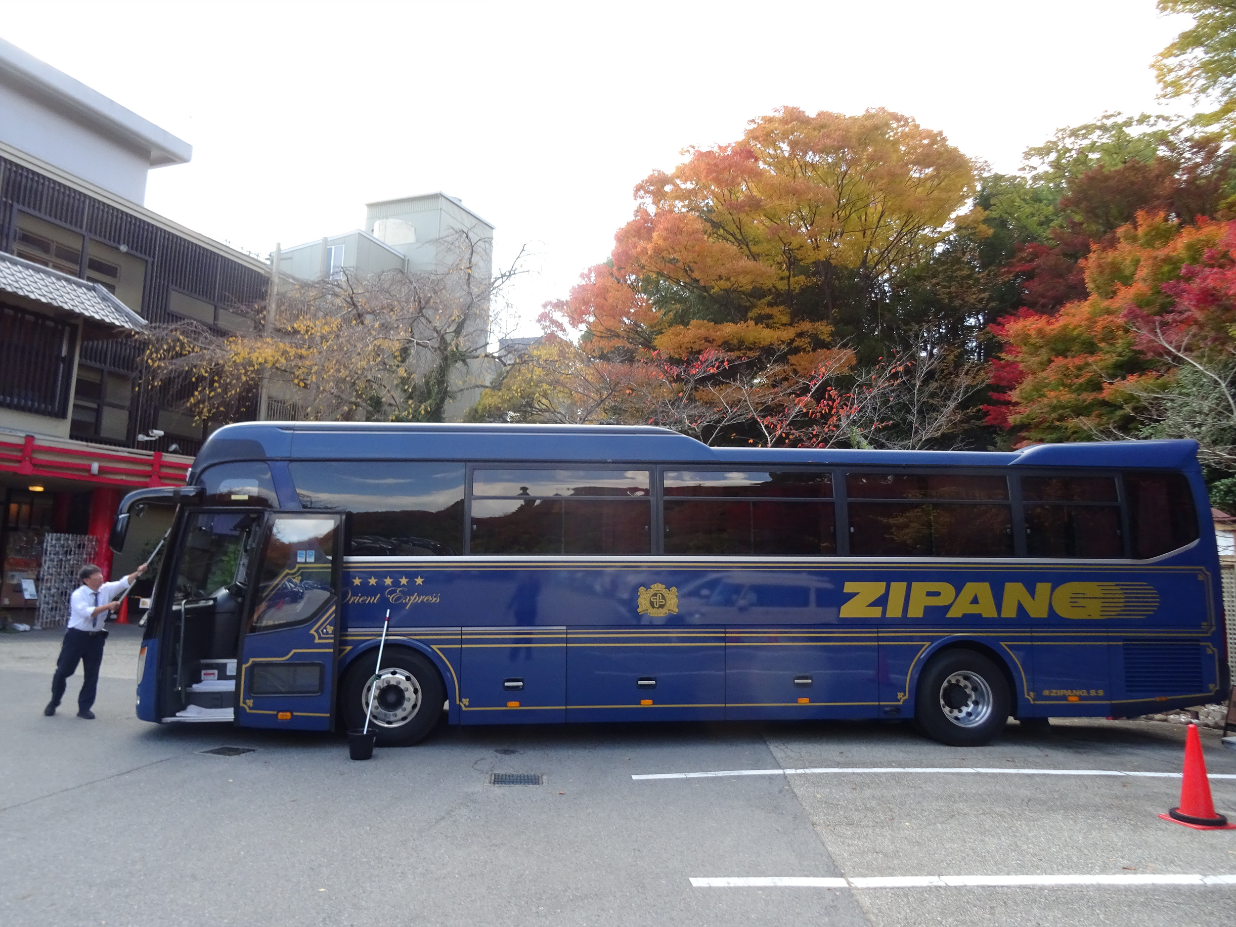 우리를 아리마온천으로 데려 온 지팡버스(와쿠와쿠 투어버스) 기사는, 버스를 깨끗하게 열심히 닦고 있네요.