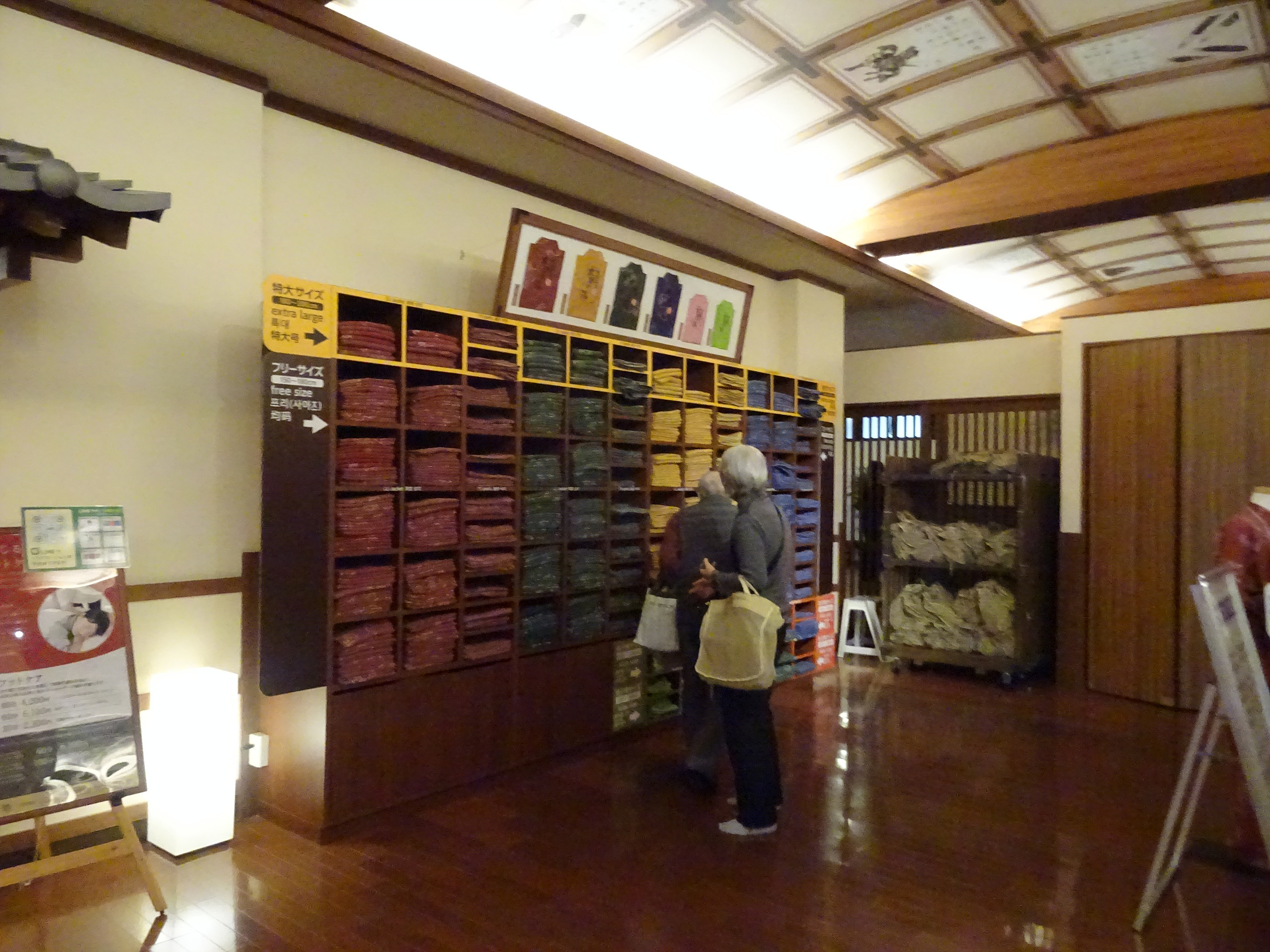안으로 들어가서 일단 신발장에 신발을 넣고, 신발장열쇠를 주머니에 넣죠. 안으로 더 들어가면 유카타와 큰수건, 작은 수건이 든 가방을 줍니다. 유카타는 프리사이즈이고 어린이는 어린이용으로 교환을 하죠.
