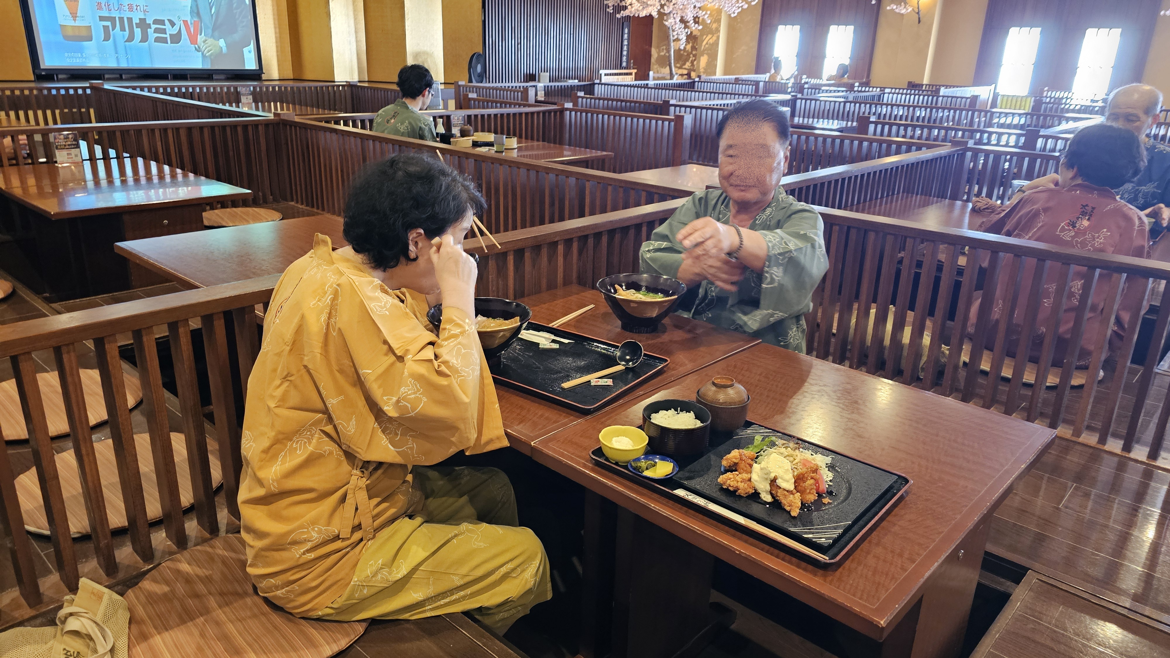 탈의는 1층과 지하1층, 2곳에서 하는데 윗 사진 저 끝까지 가면 좌우로 남자,여자 탈의실이 있습니다. 여기서 유카타를 갈아입어요. 옷장열쇠는 팔목에 차고, 그러고 난 뒤 가족과 만나서 지하로 가는 계단을 내려가, 오른쪽으로 쭈욱 가서 푸드코트(식당)에서 식사를 합니다.