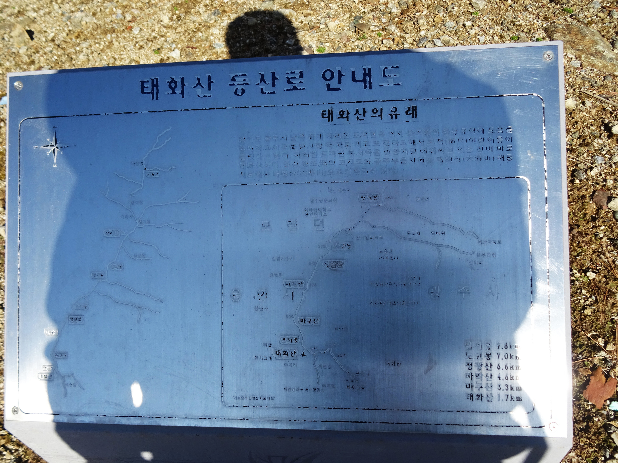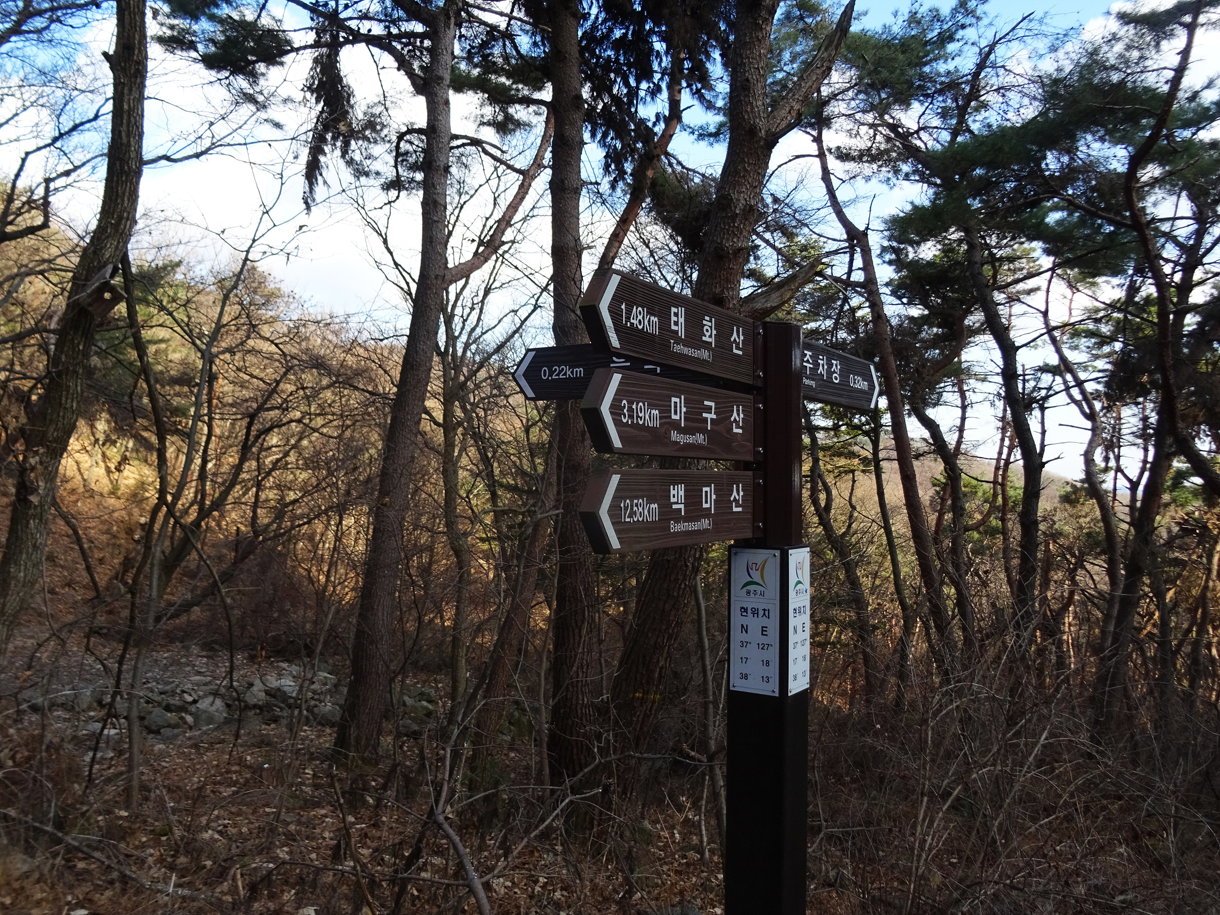 광주시는 태화산을 너무 너무 아끼고 사랑하는 가 봅니다. 곳곳에 설치한 많은 계단들, 벤치는 물론이려니와 정상에 까지 설치한 전망대, 둥근 원탁의자, 많은 이정표 등등, 등산로 정비에 이토록 심혈을 기울인 지자체는 진짜 처음으로 봅니다.