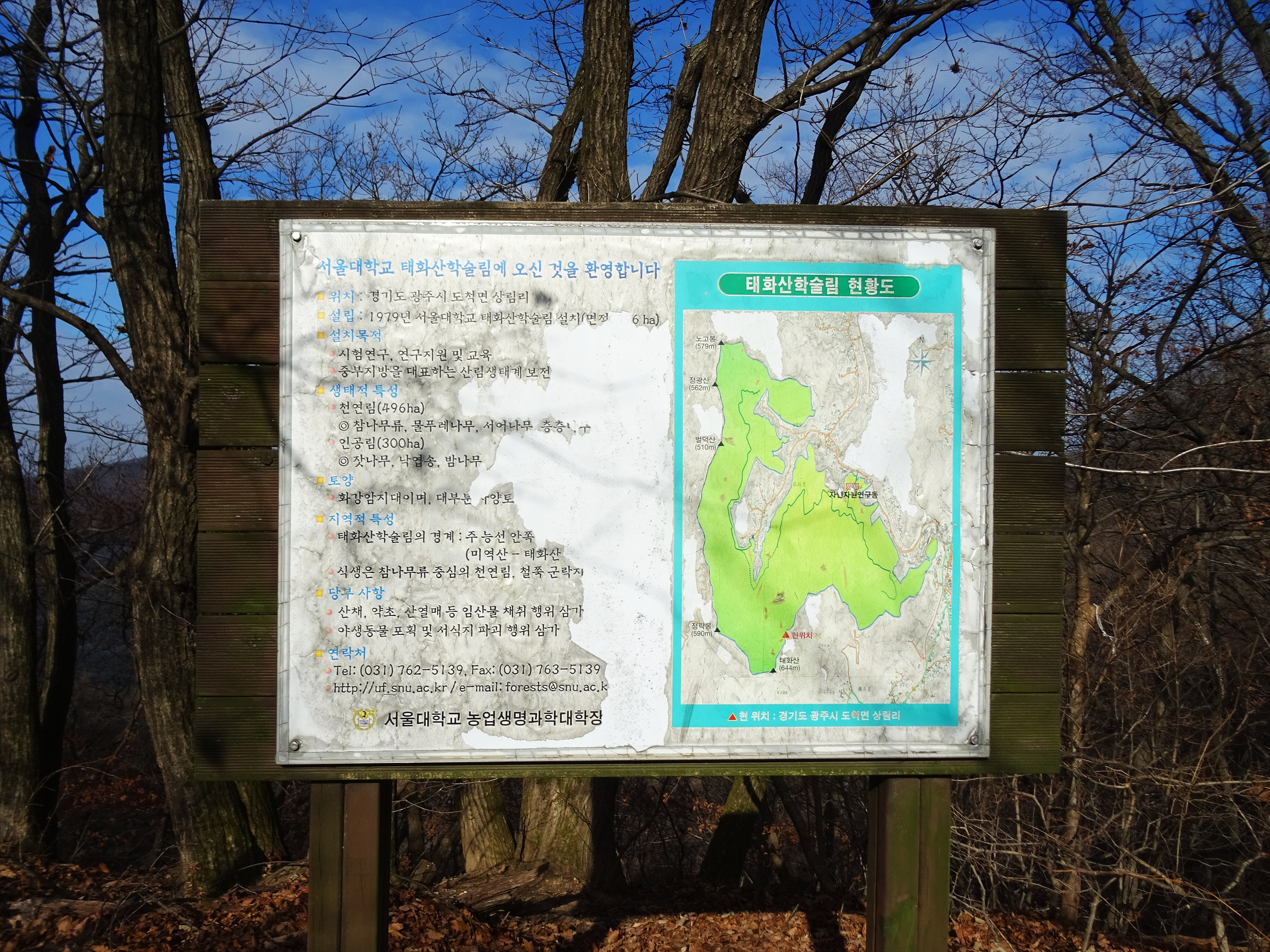서울대 태화산 학술림은 경기 광주시 도척면 태화산일대에 조성된 교육, 연구용 산림으로 서울대 농업생명과학대학 산림과학부 학생들의 실습지로 활용되며, 학생들은 이곳에서 조림, 산림측정, 임도 설계, 생태계 보전 등을 직접 경험한다고 해요.