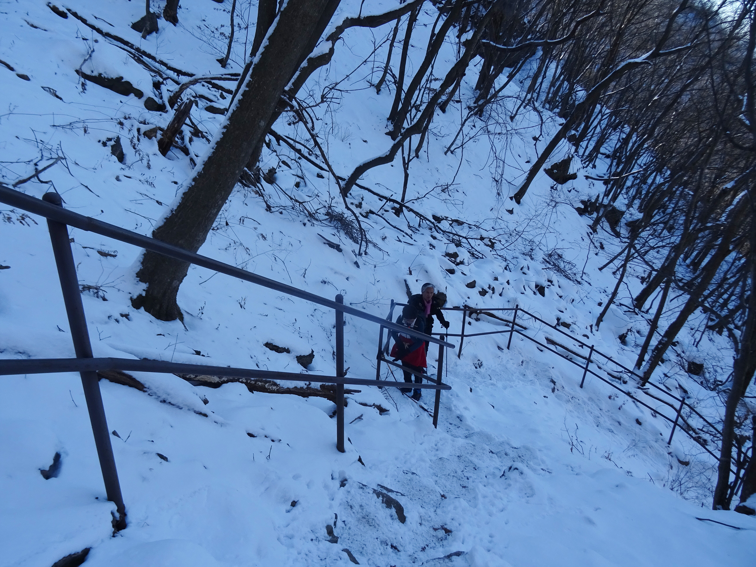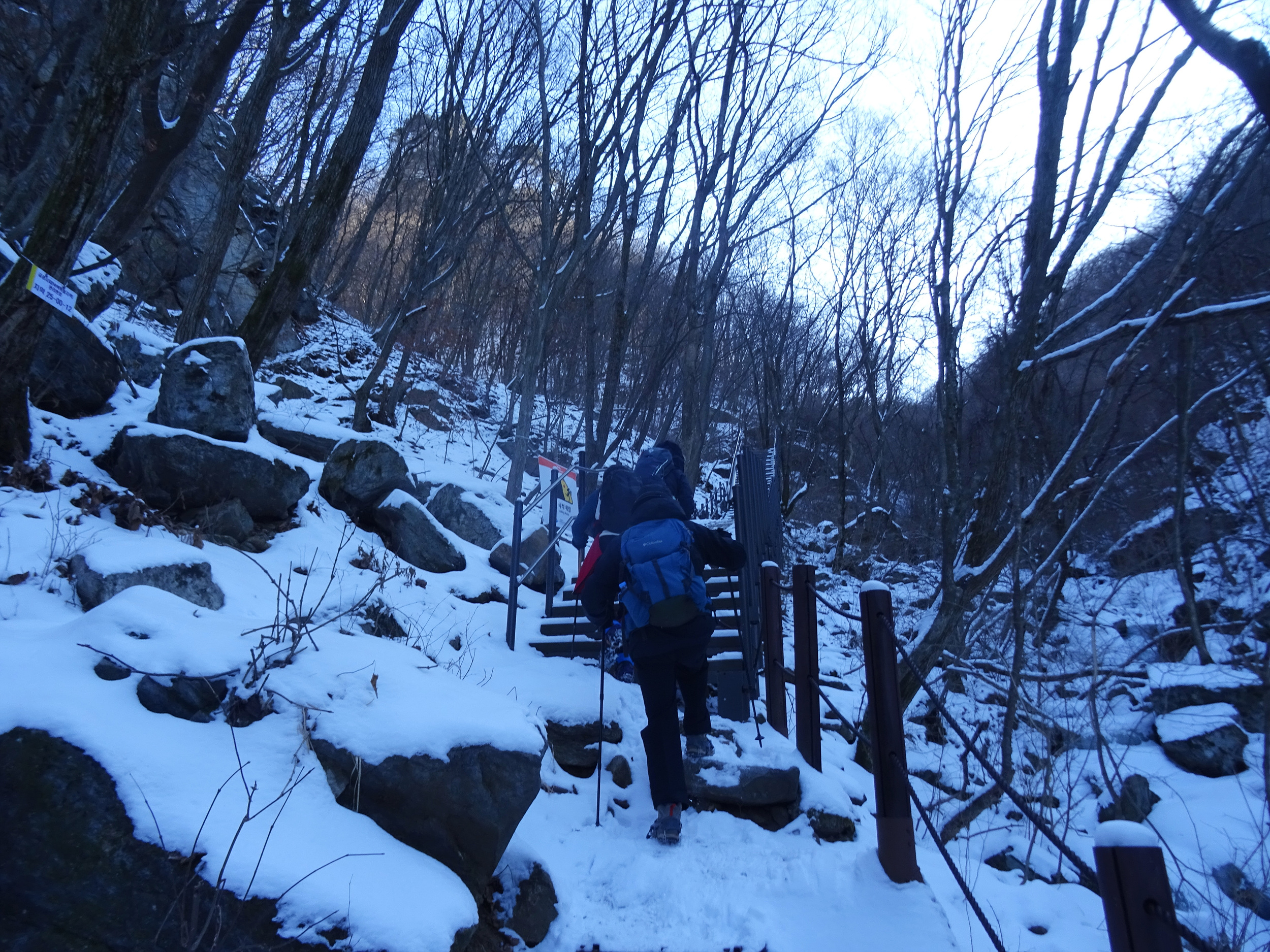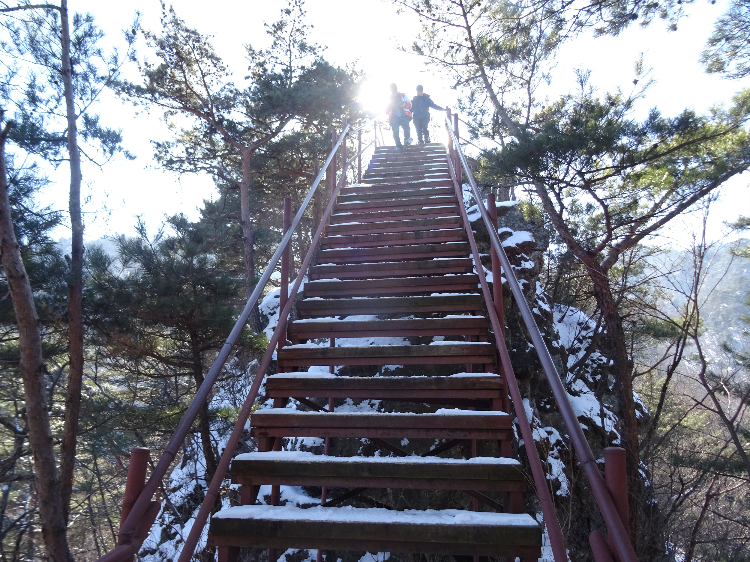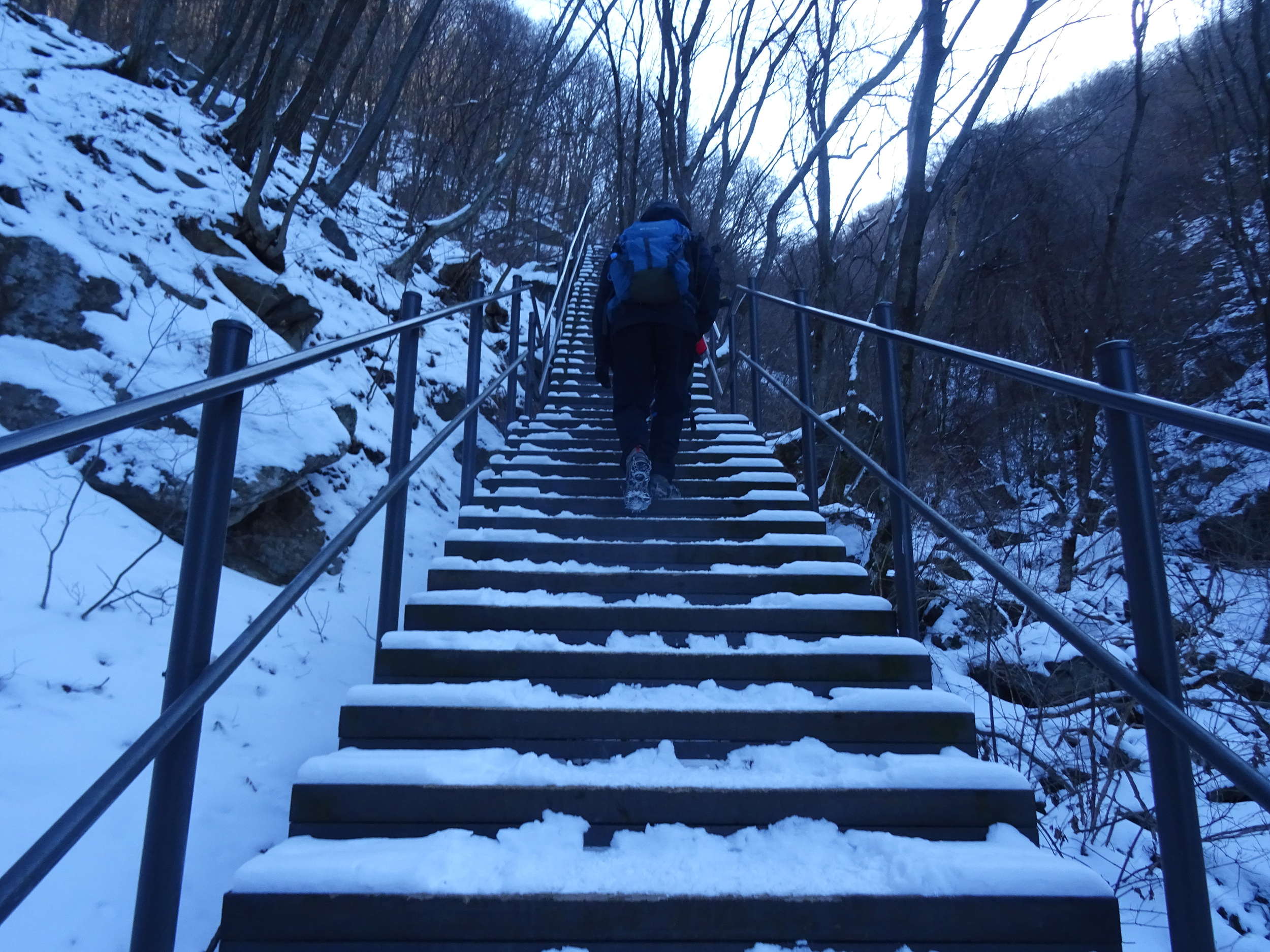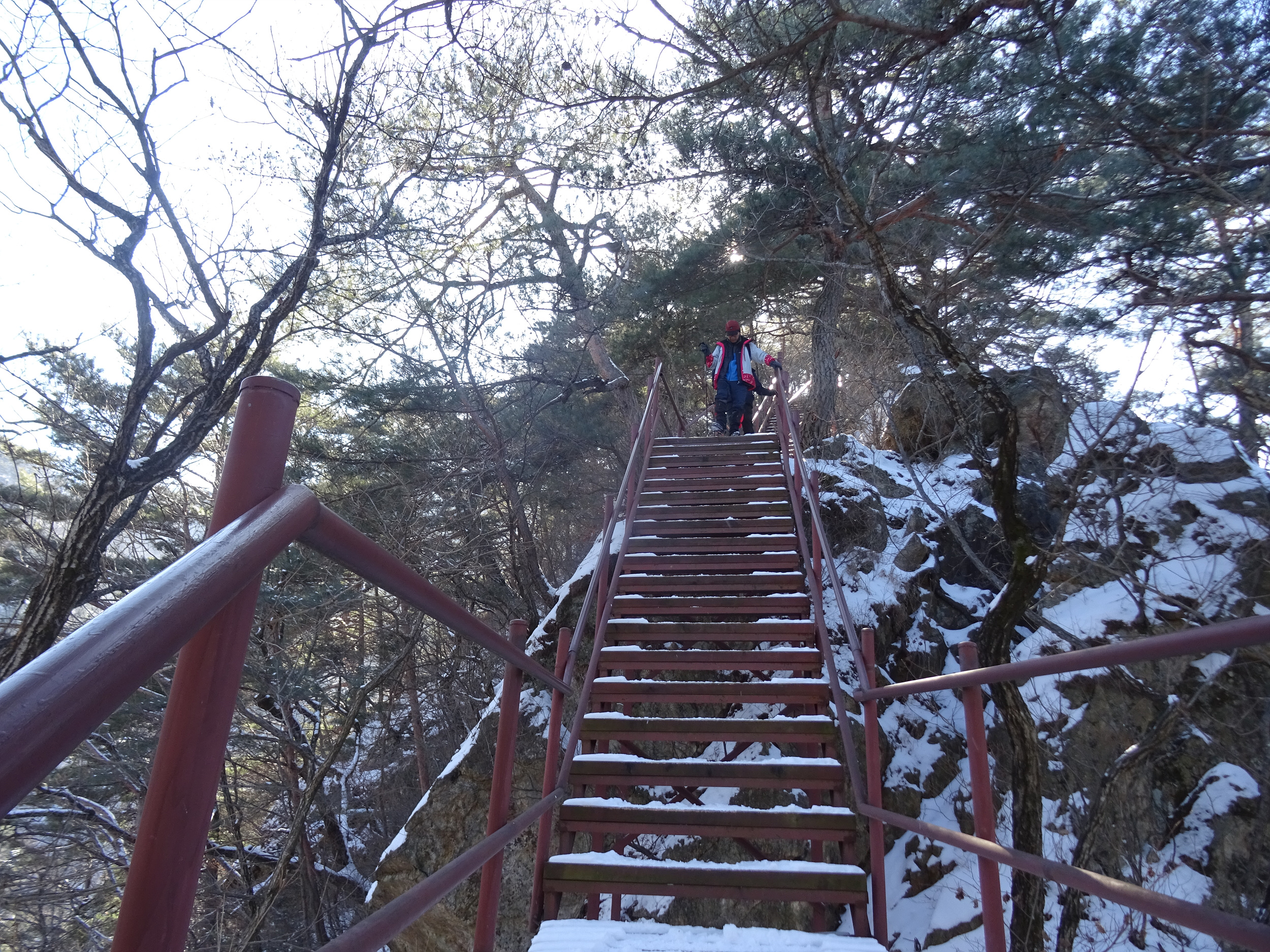 아이젠을 신었다해도 계단오르는 건 조심스러워 난간을 붙잡으며 올라갑니다.