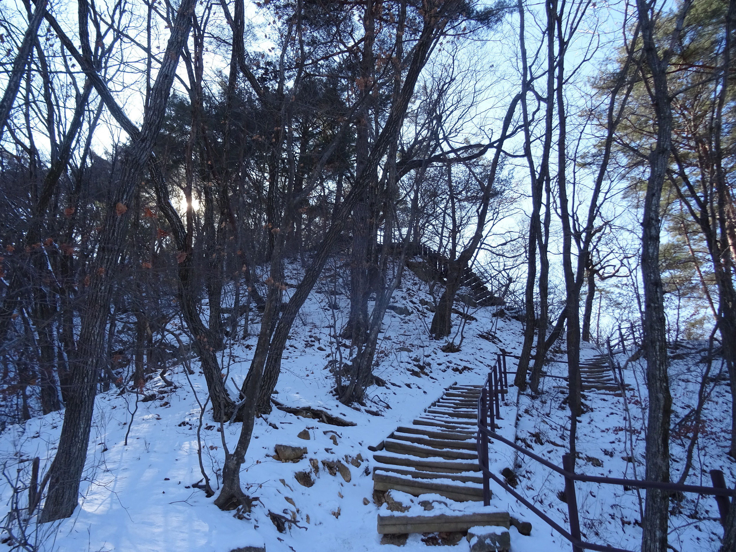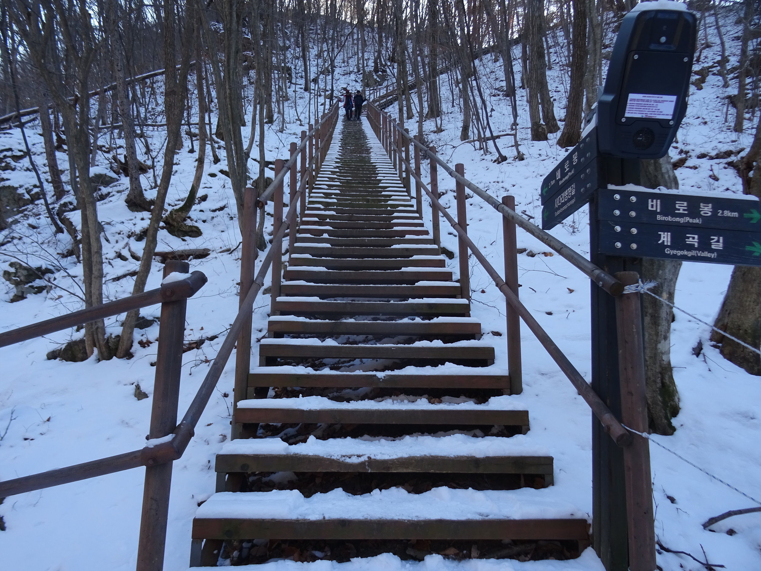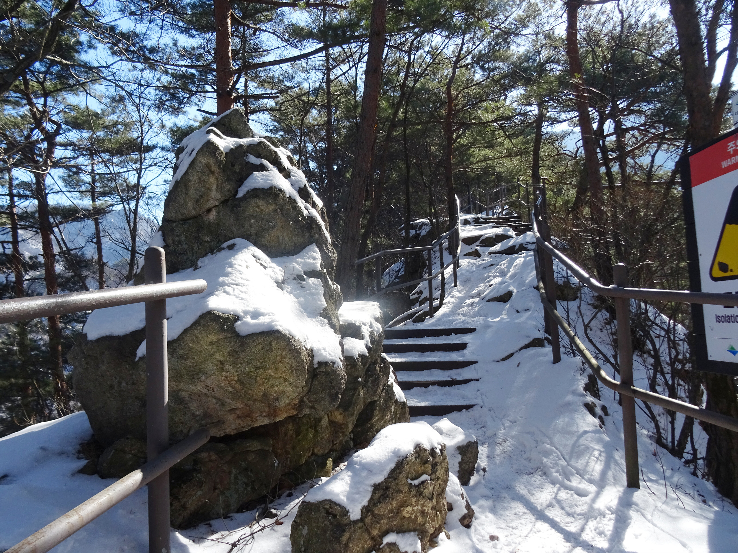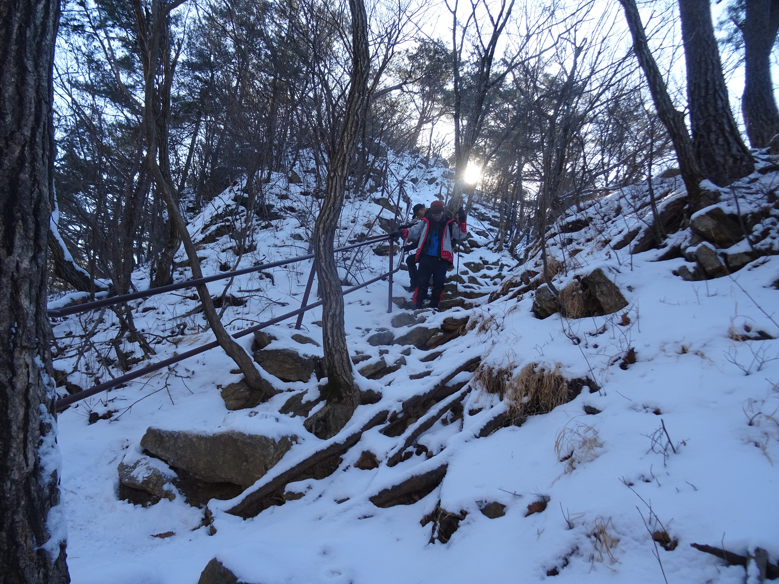 아이젠을 신었다해도 계단오르는 건 조심스러워 난간을 붙잡으며 올라갑니다.