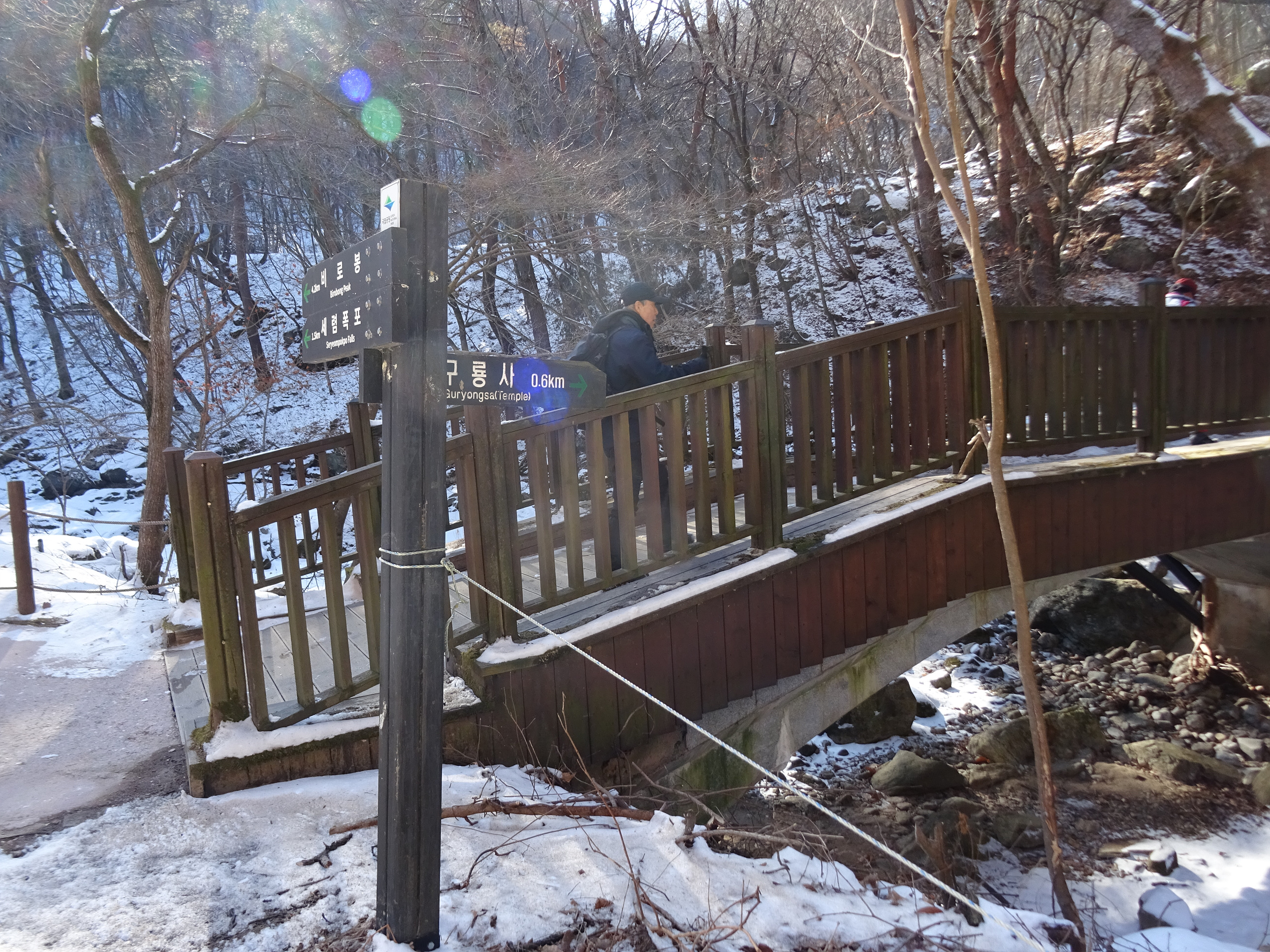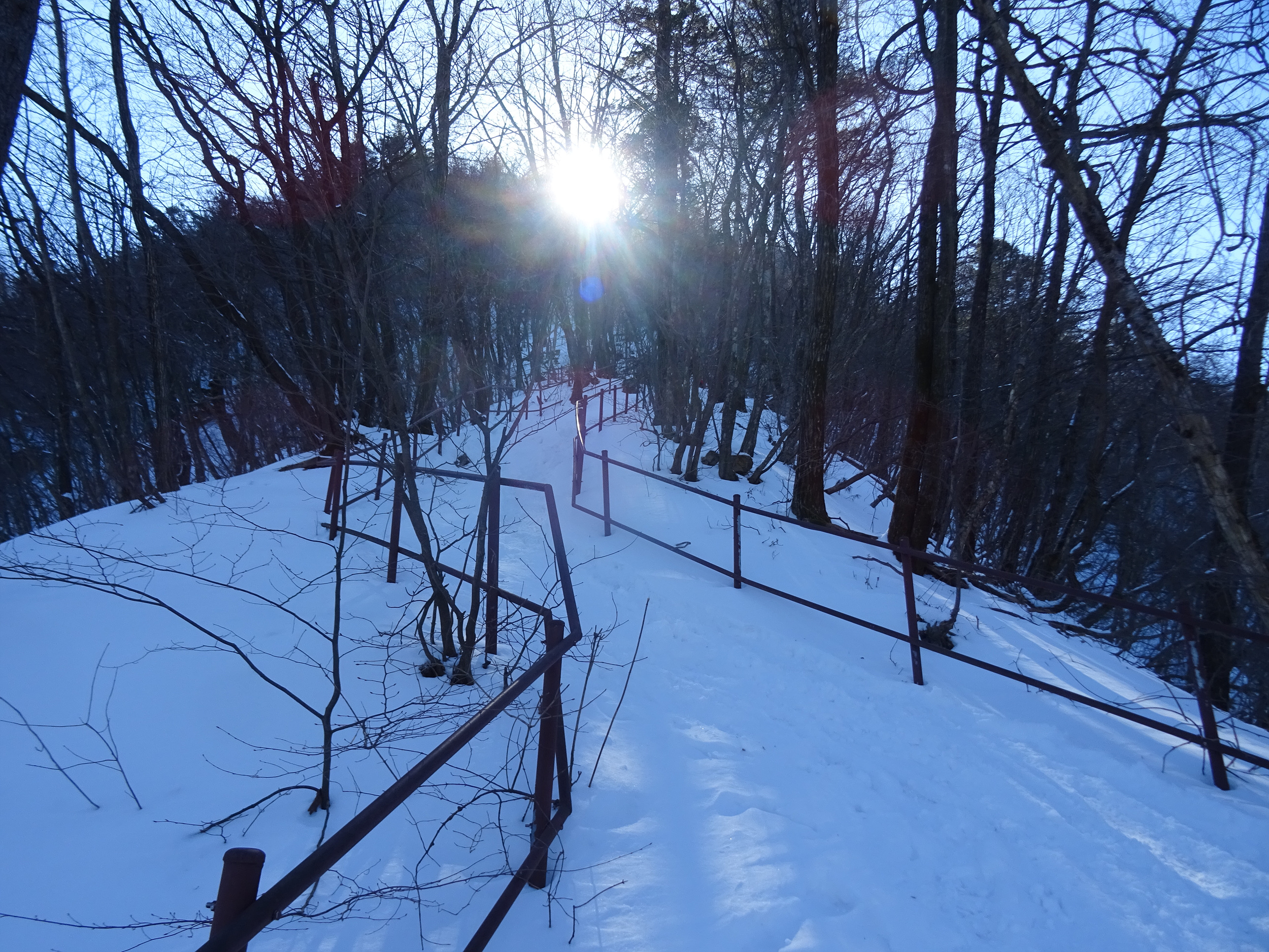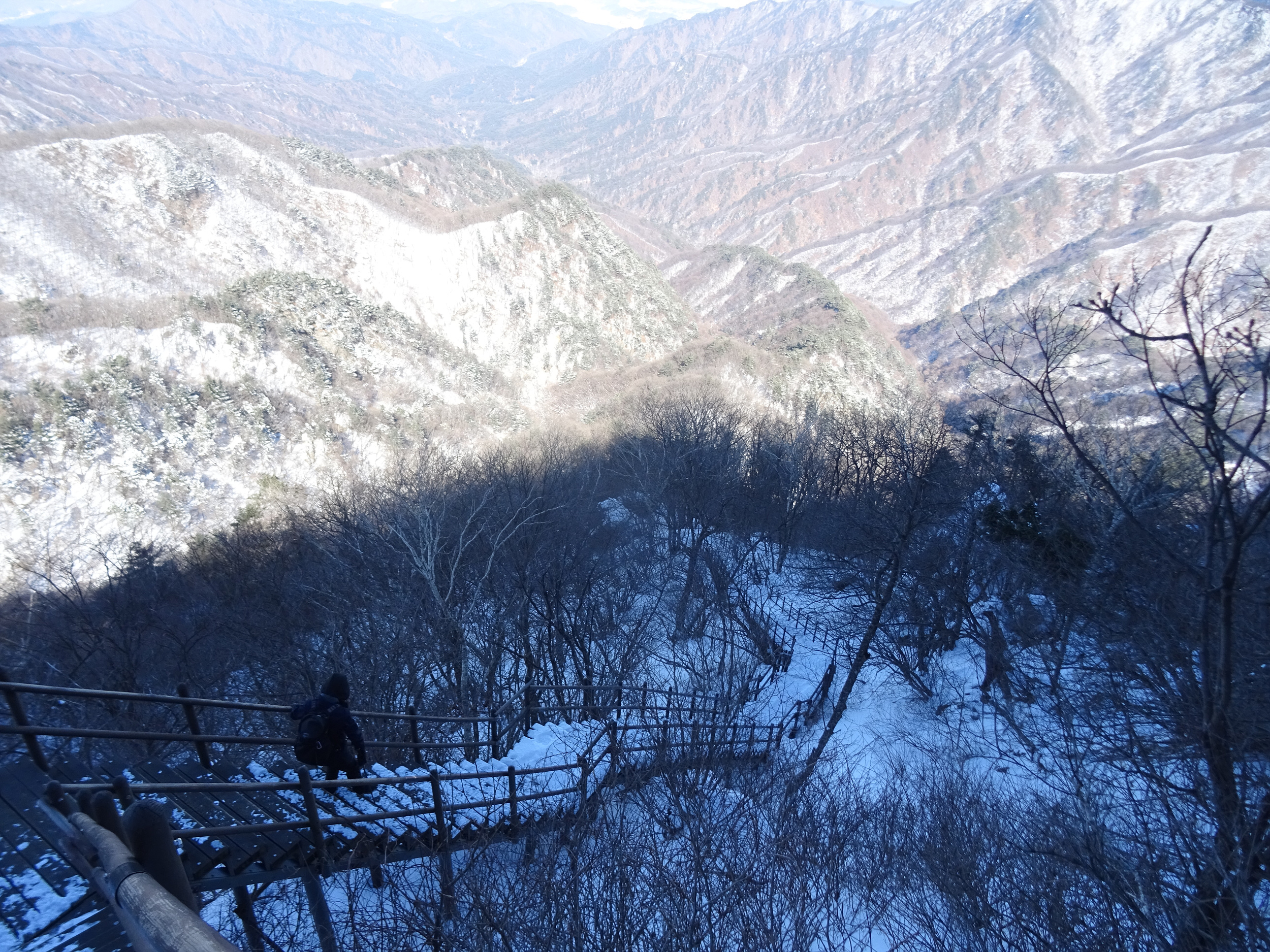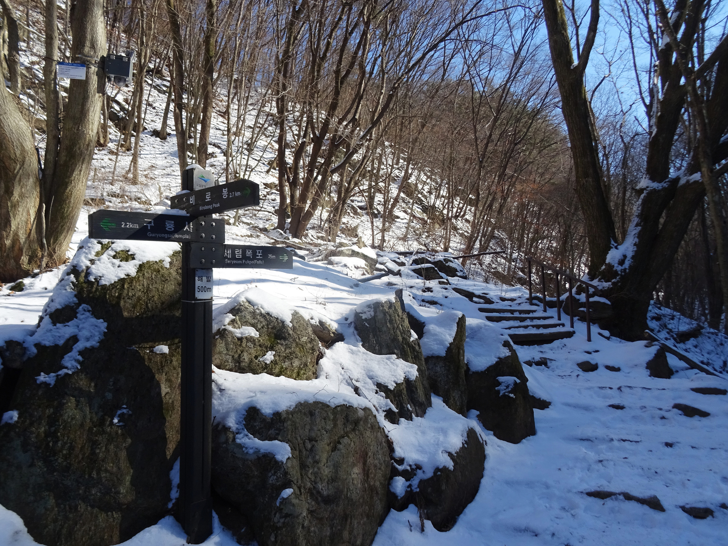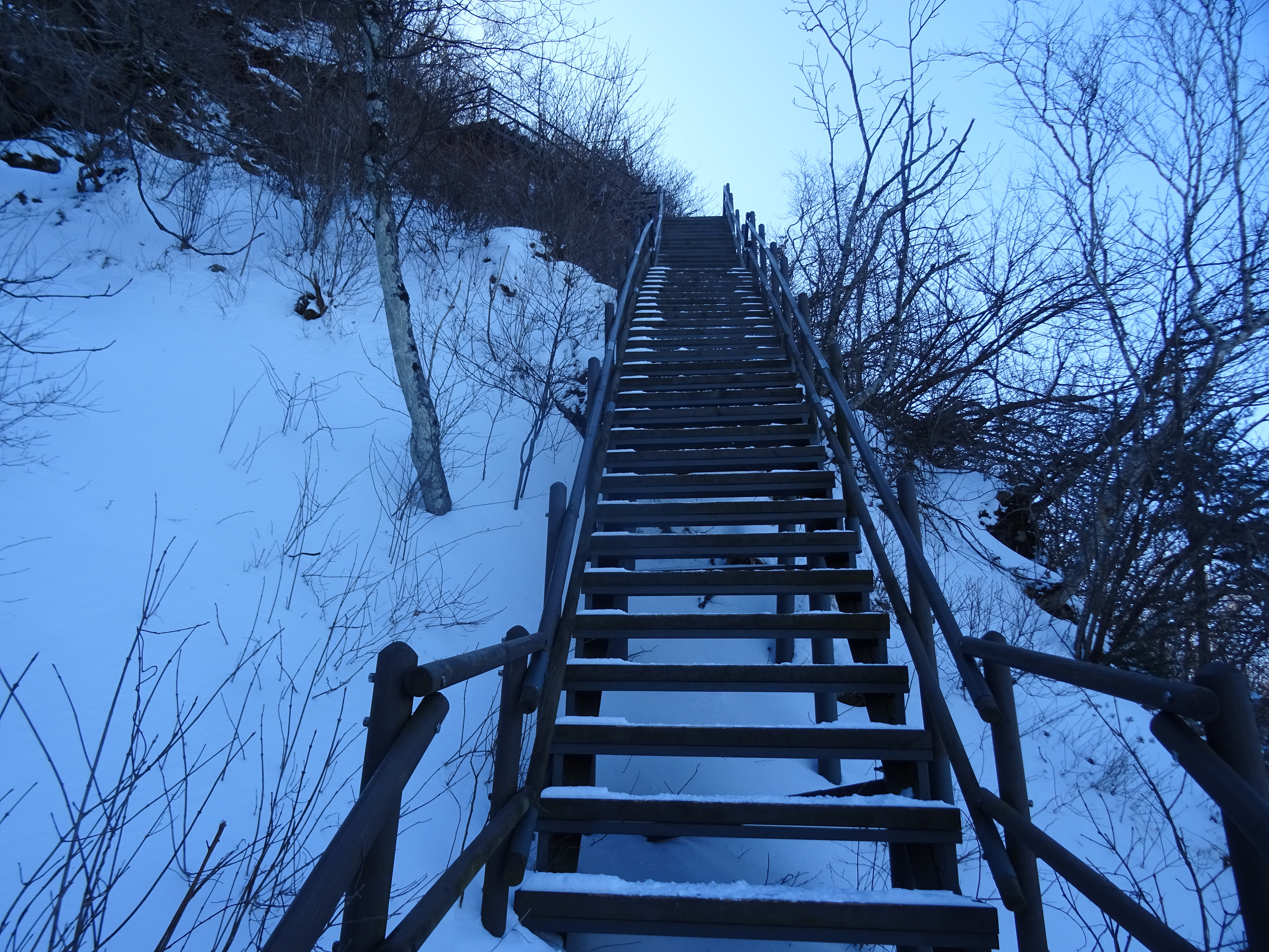 아이젠을 신었다해도 계단오르는 건 조심스러워 난간을 붙잡으며 올라갑니다.