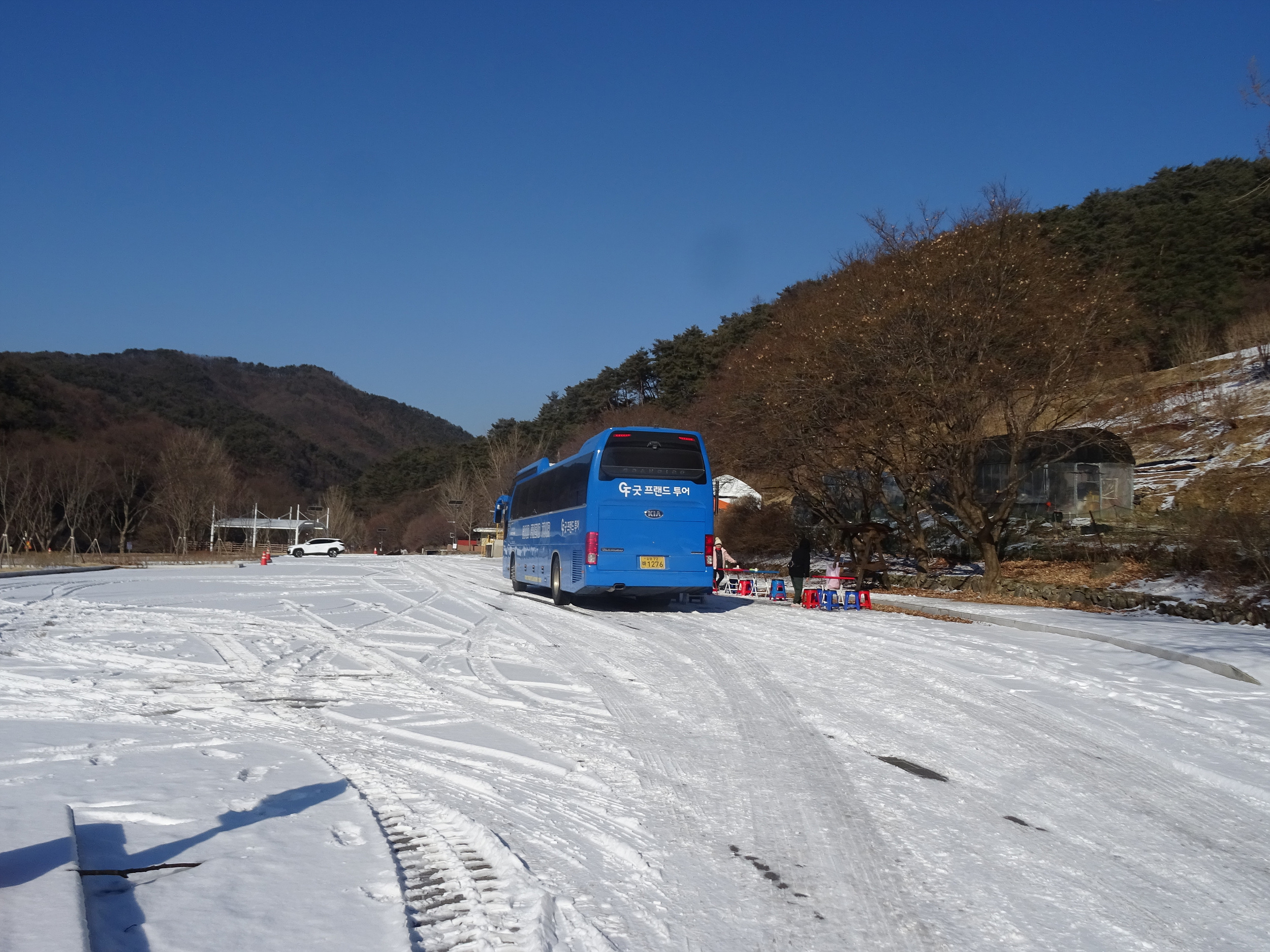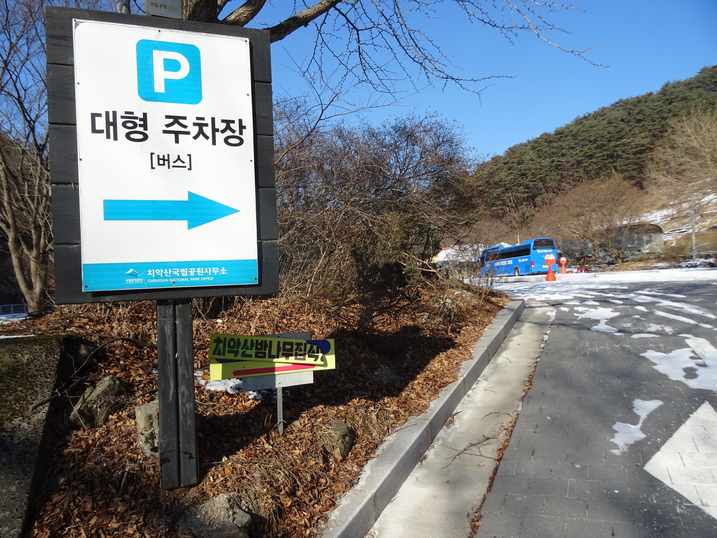 다리 건너 마을에 있는 승용차주차장을 지나, 다시 또 다리를 건너면 대형버스주차장입니다.