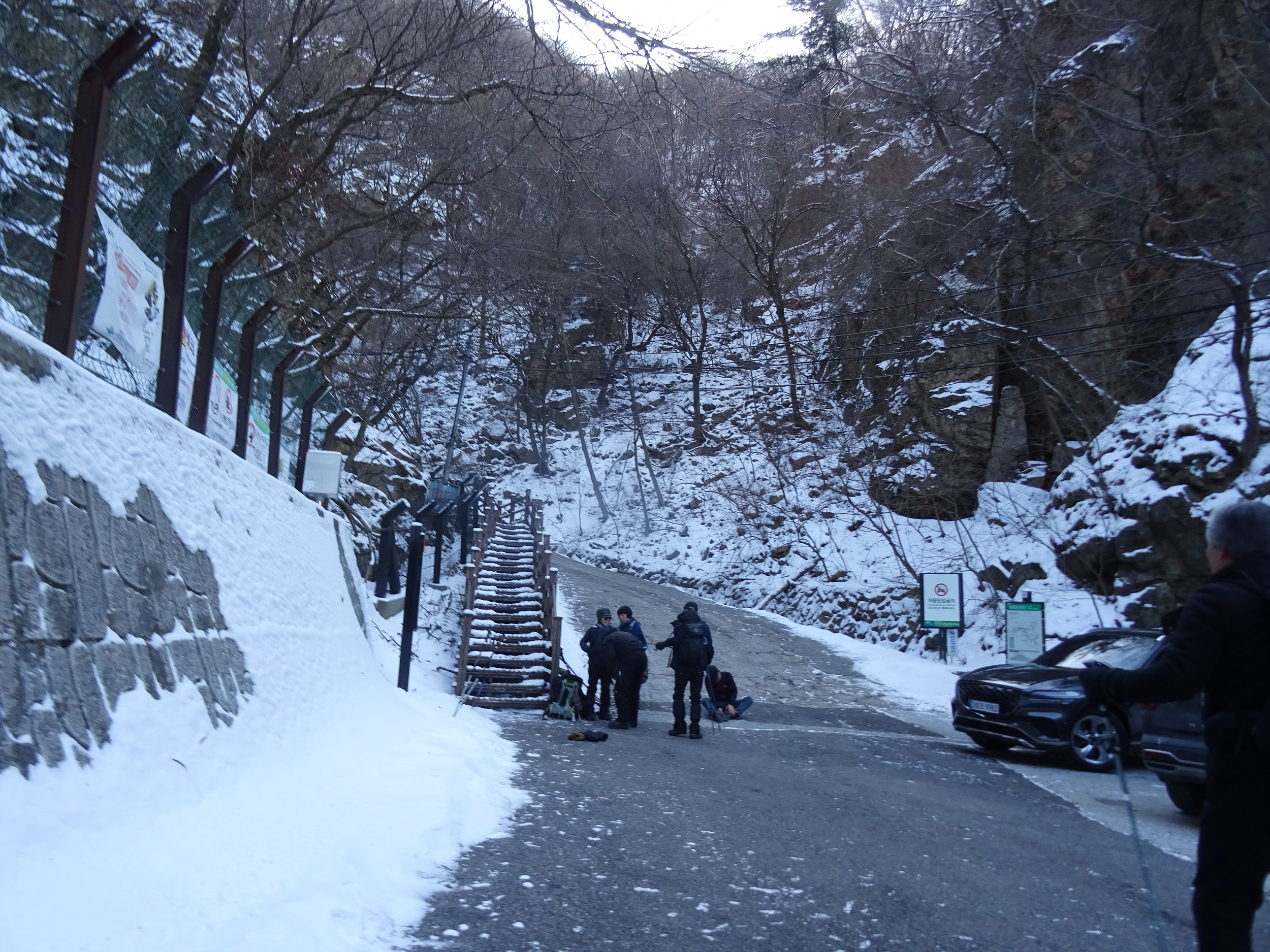 입석사 주차장에서 아이젠을 장착합니다.