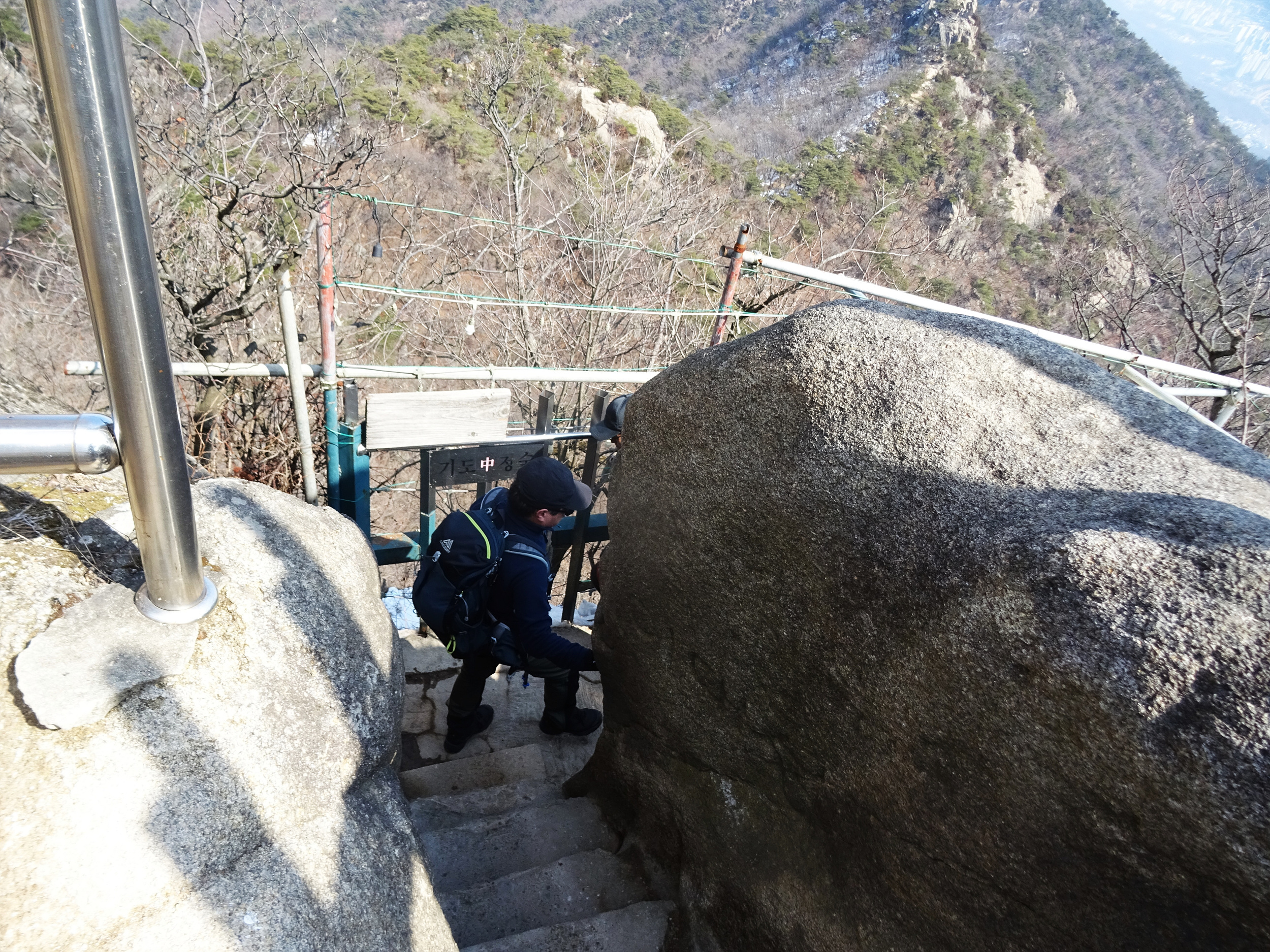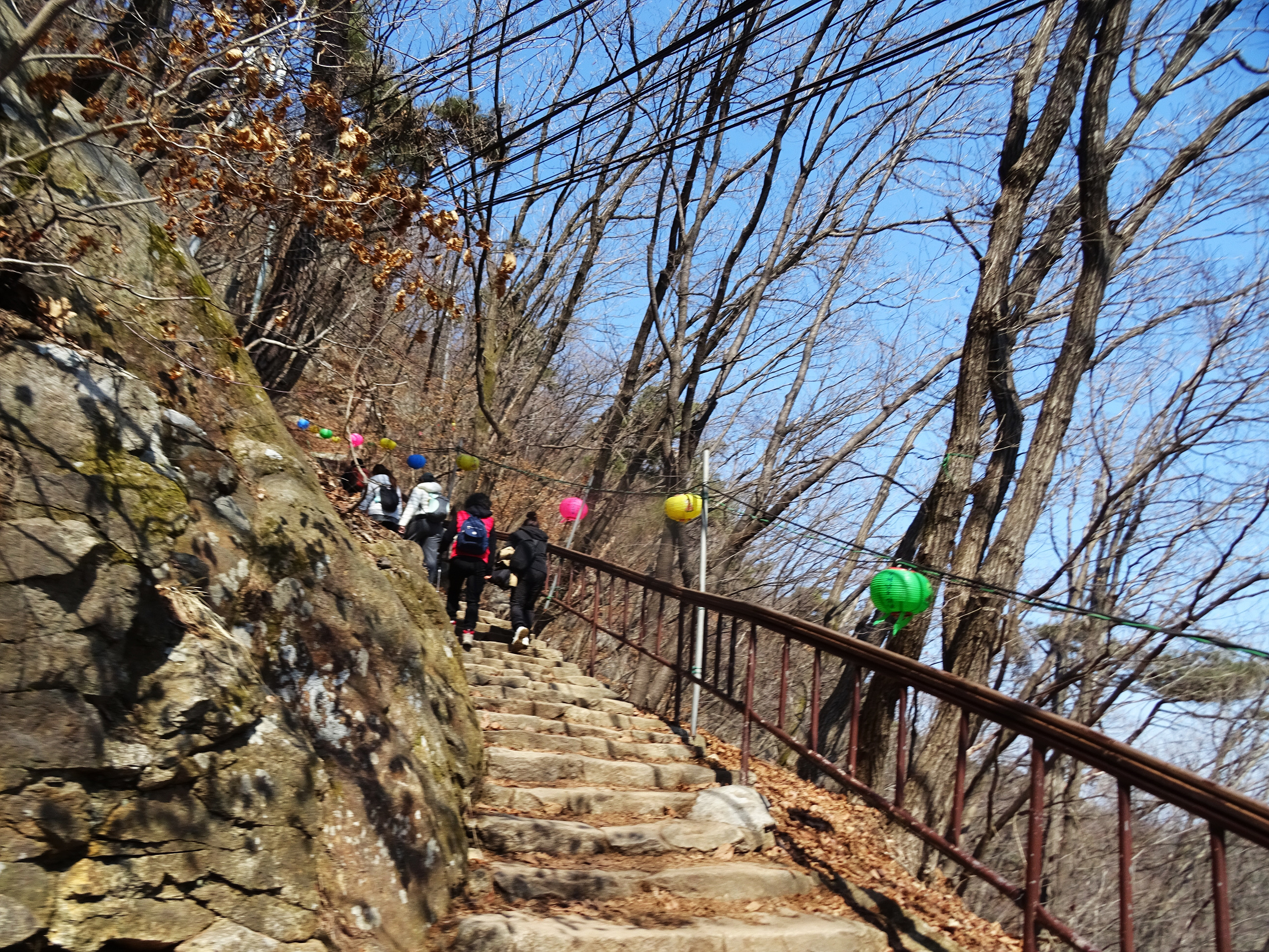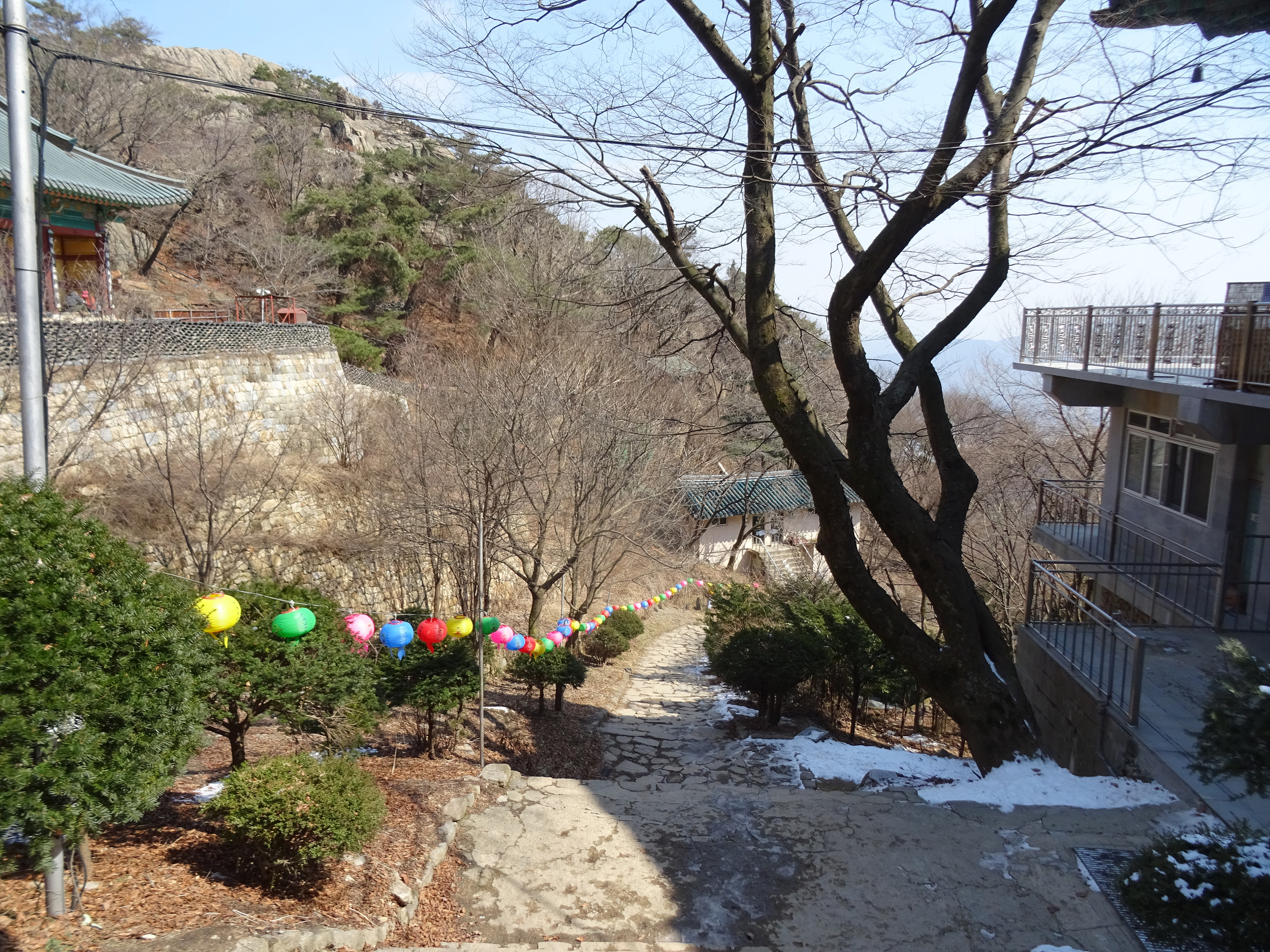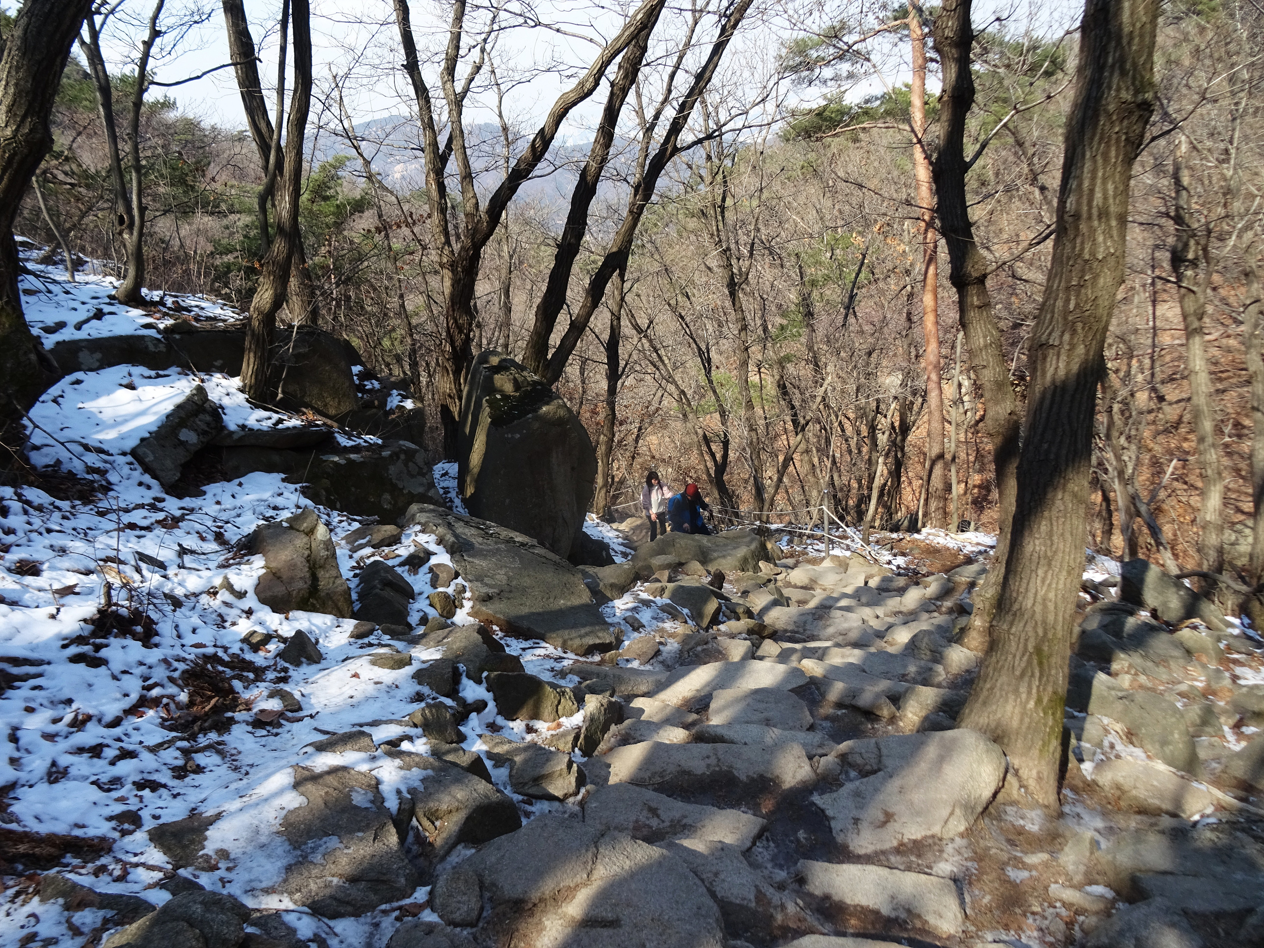 산 윗쪽에는 흰눈으로 덮혔습니다. 돌계단 사이 사이 눈 녹은 곳은 얼어서 미끄러워요.