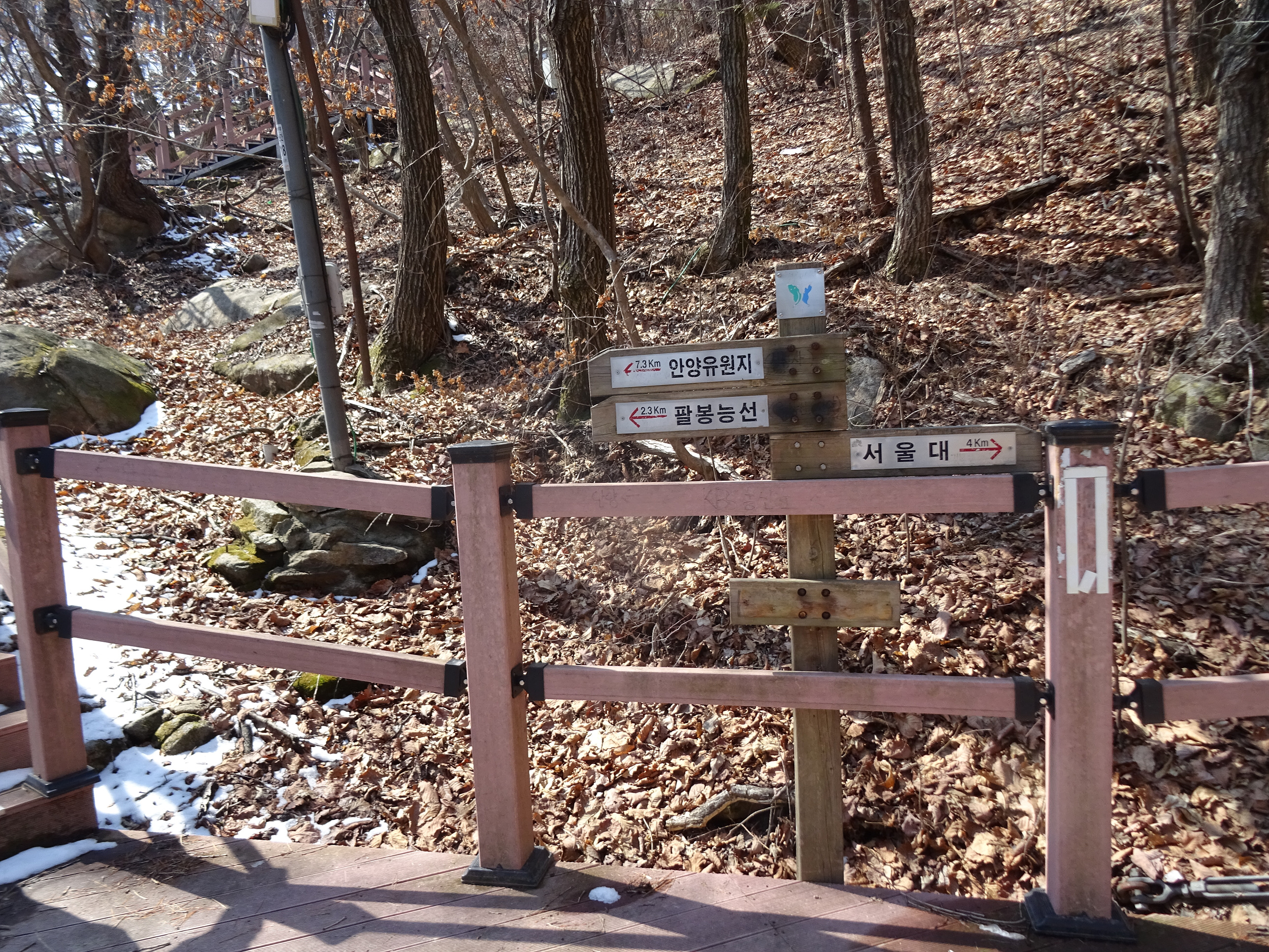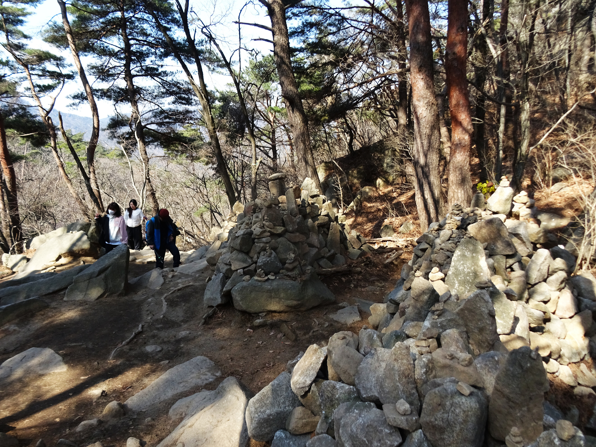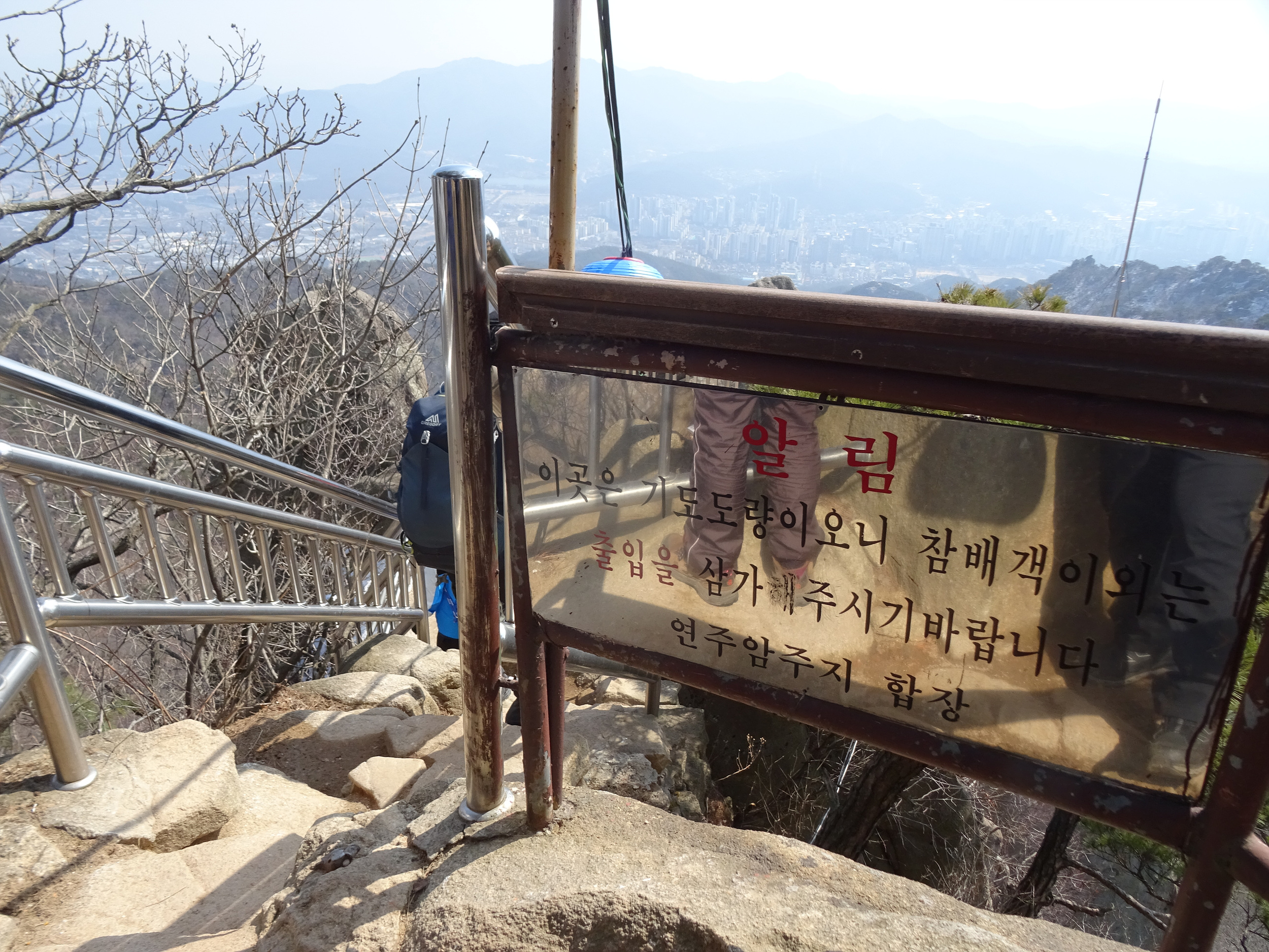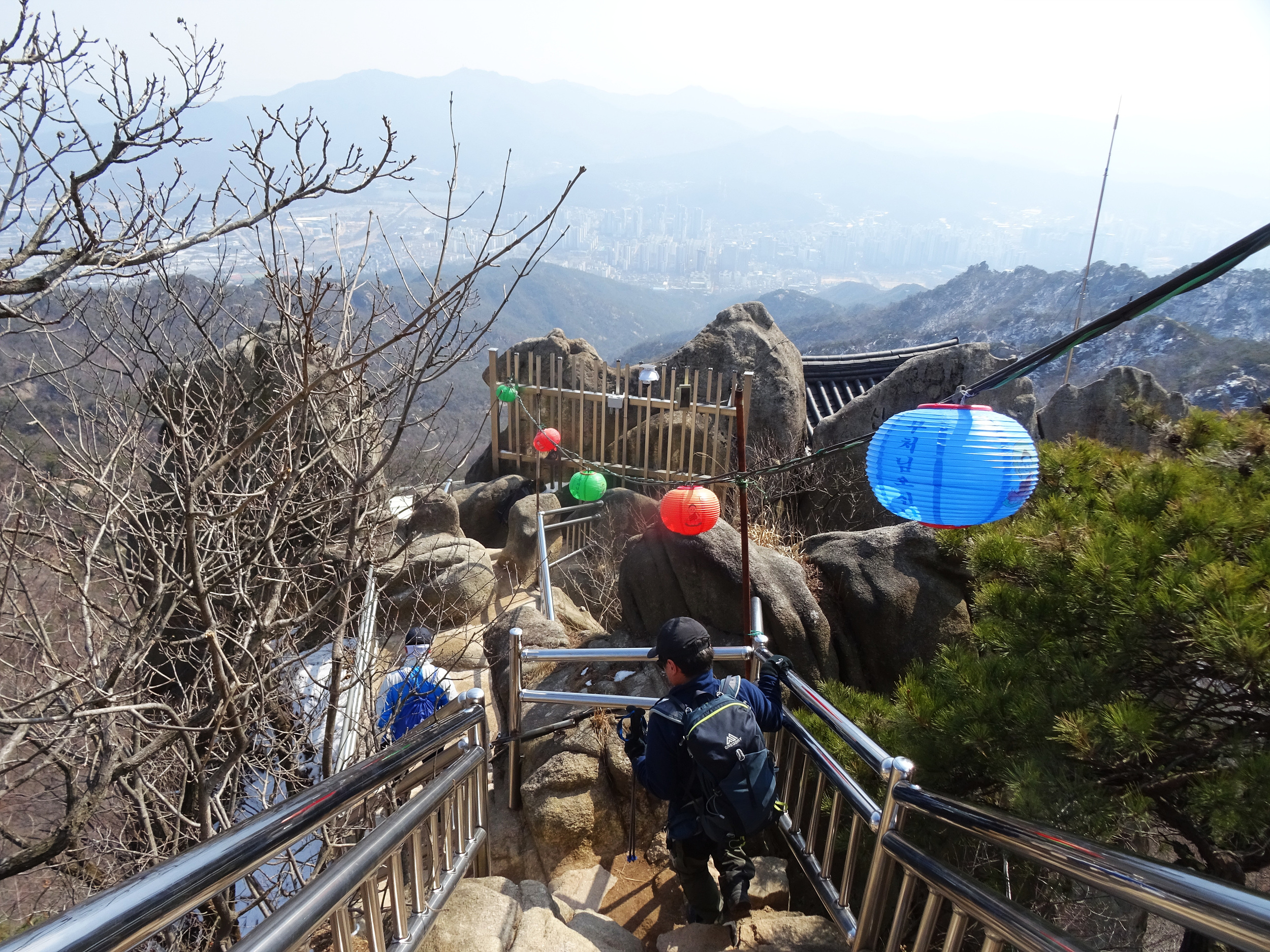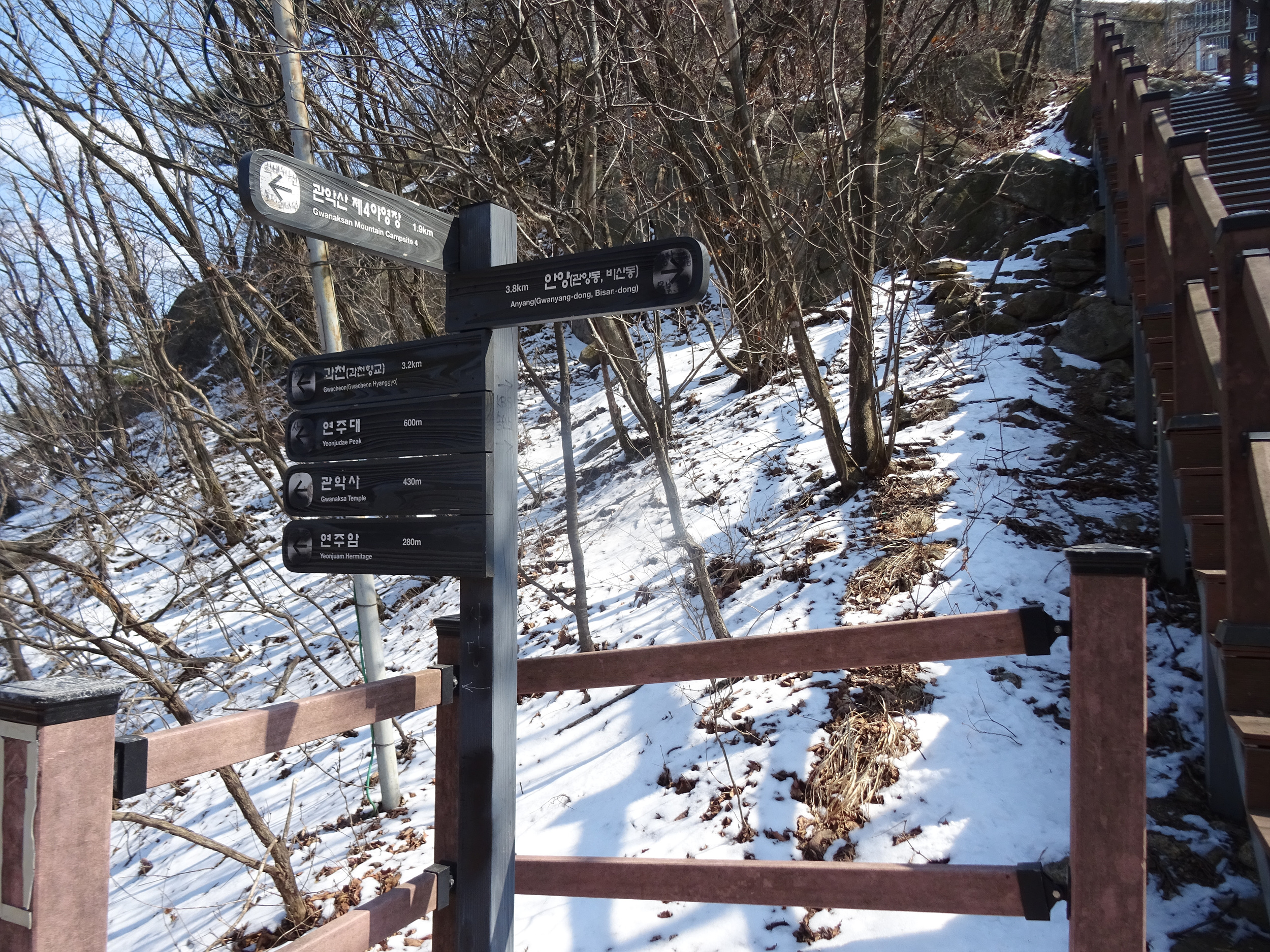 산 윗쪽에는 흰눈으로 덮혔습니다. 돌계단 사이 사이 눈 녹은 곳은 얼어서 미끄러워요.