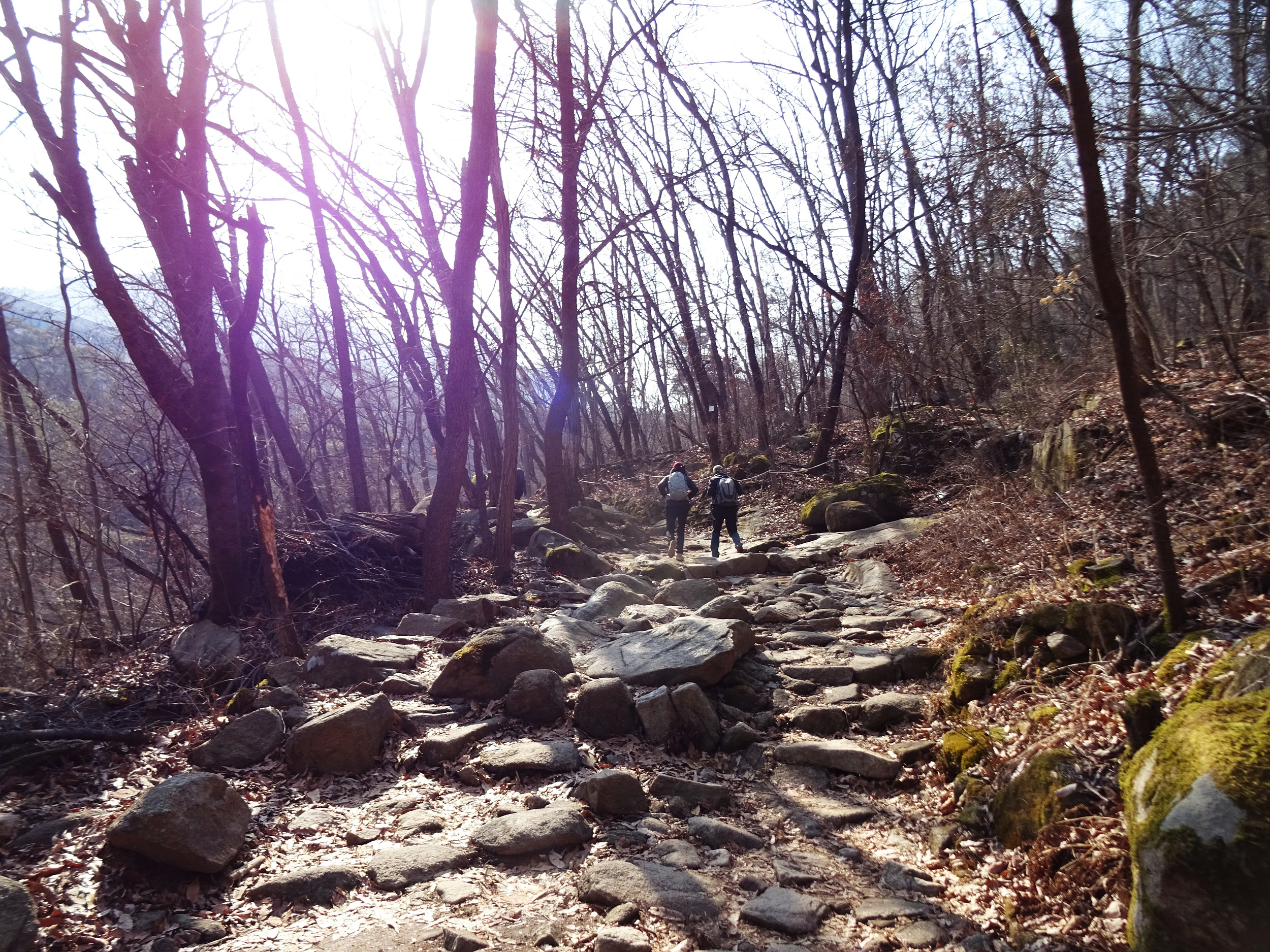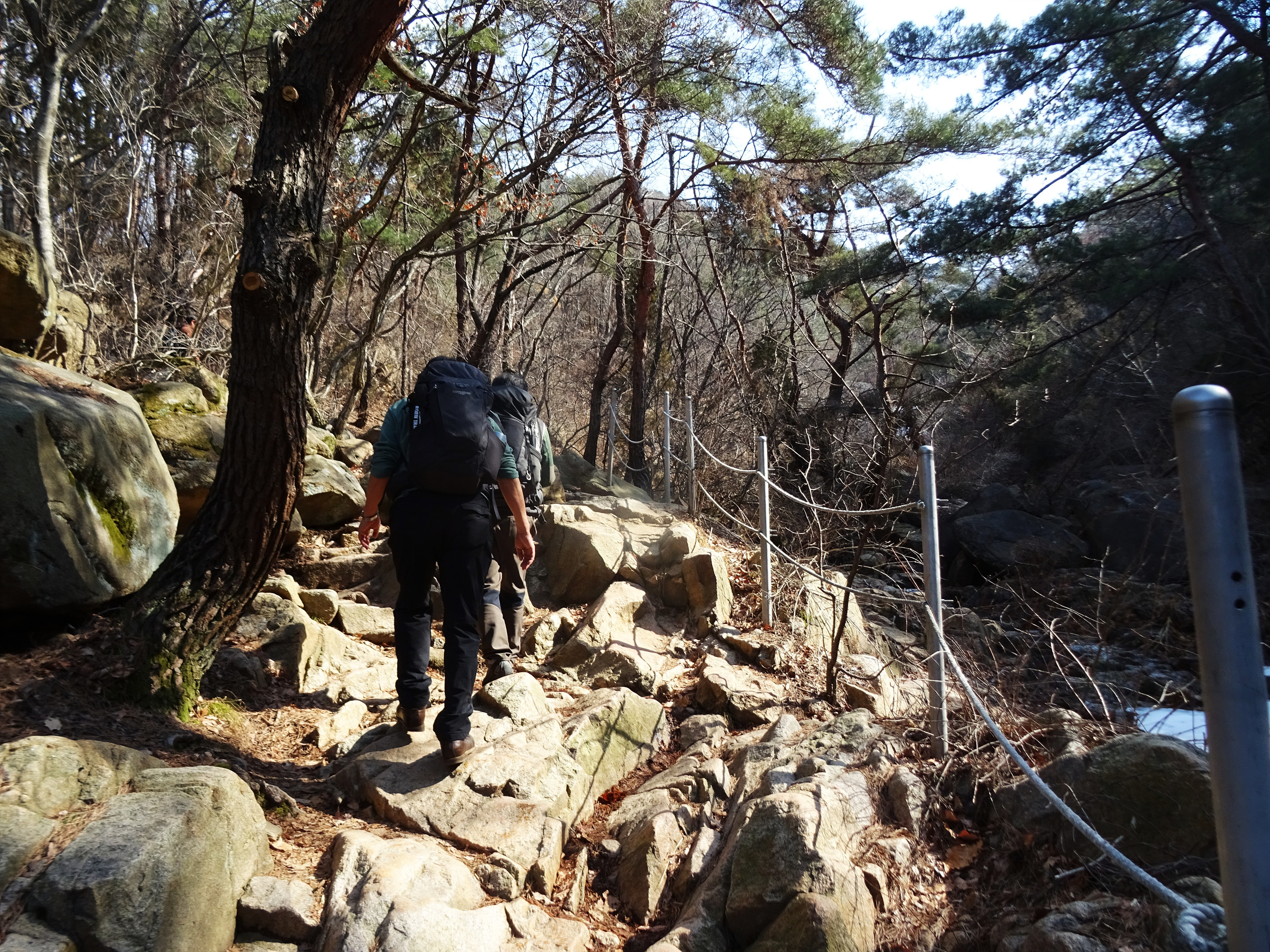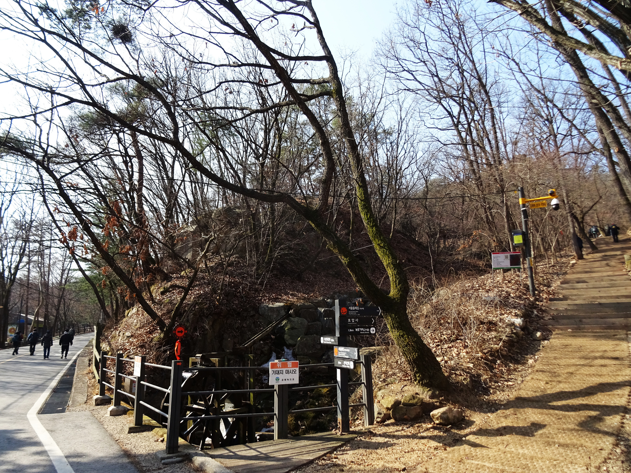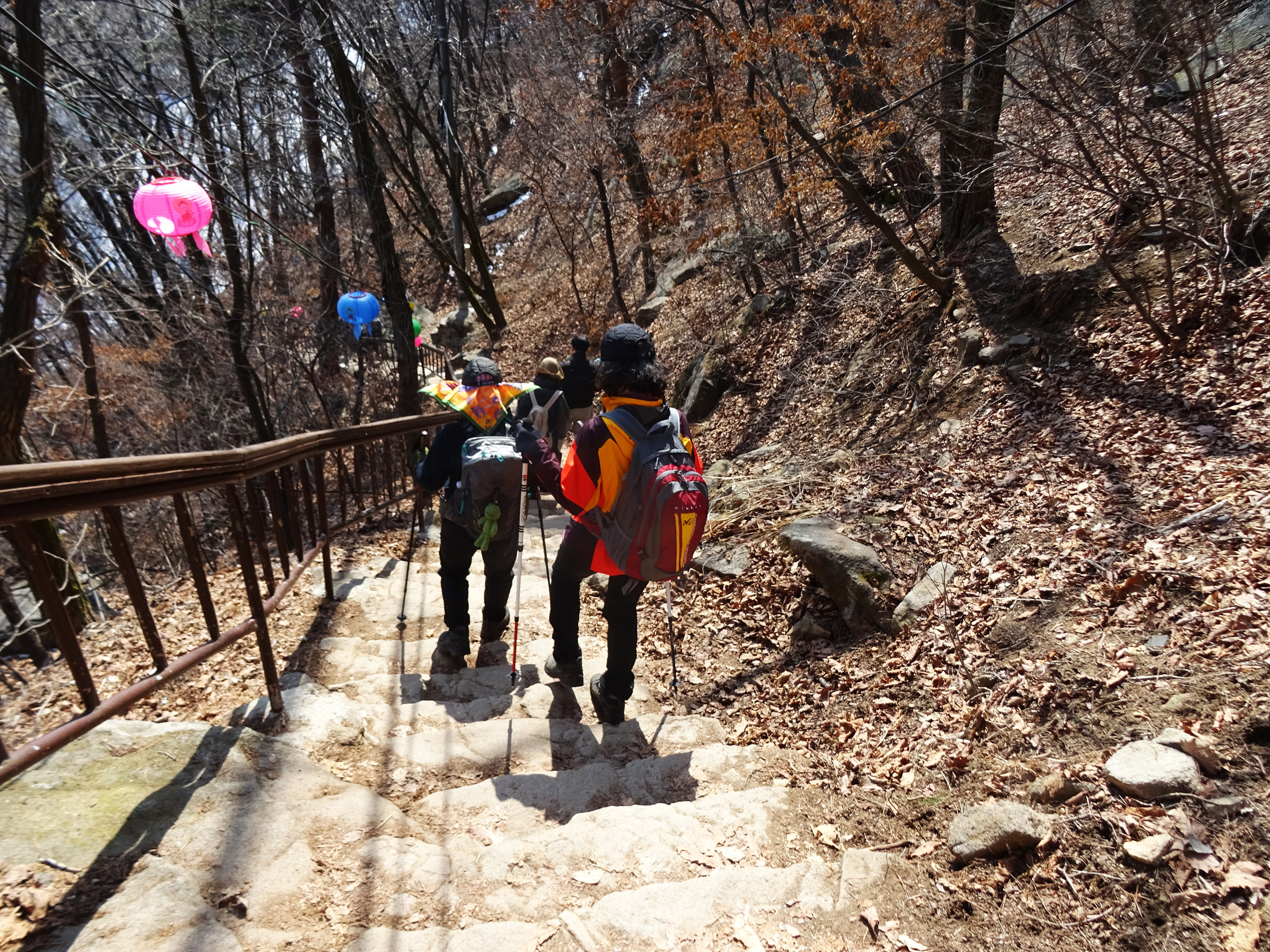 산 윗쪽에는 흰눈으로 덮혔습니다. 돌계단 사이 사이 눈 녹은 곳은 얼어서 미끄러워요.