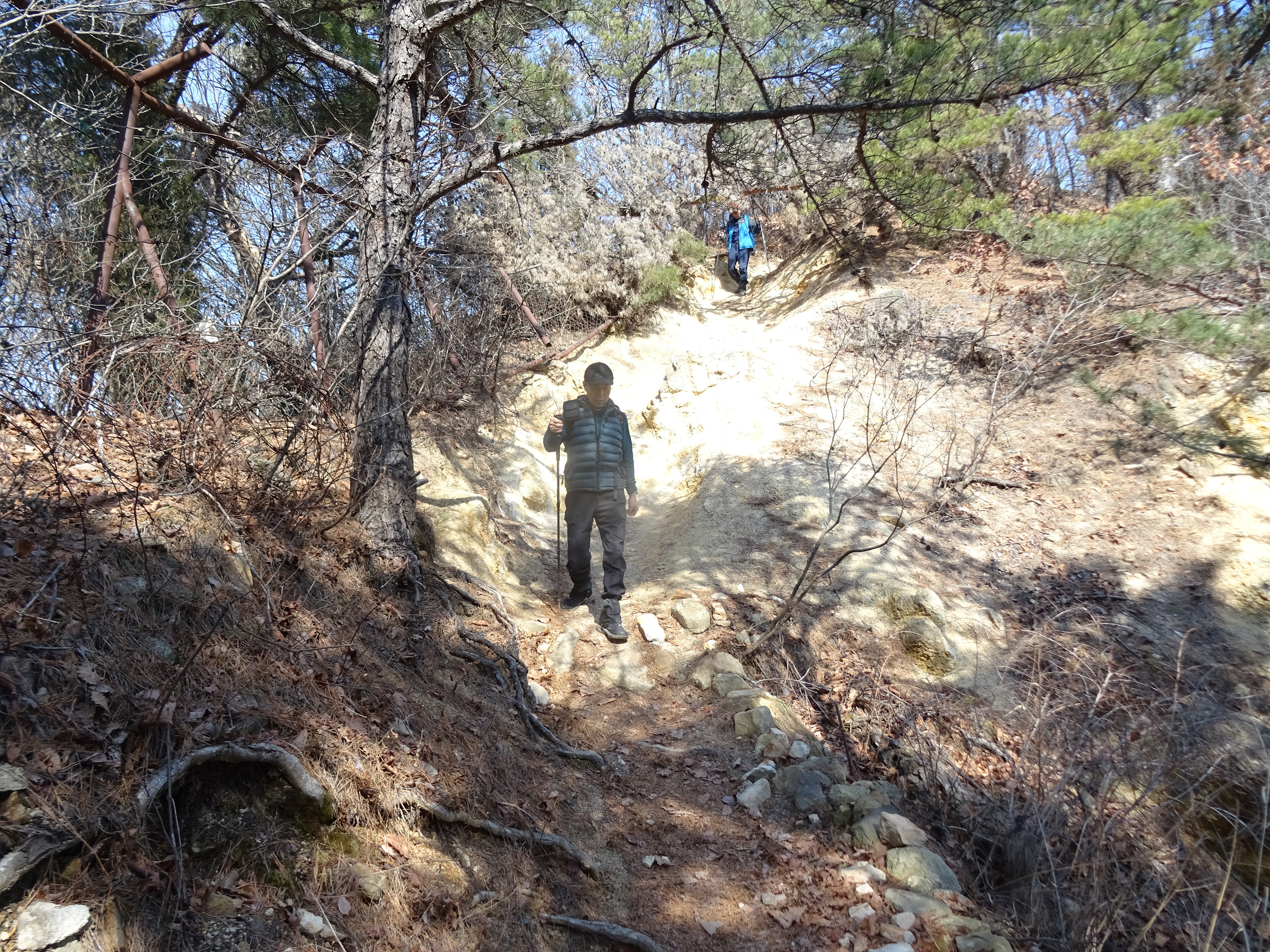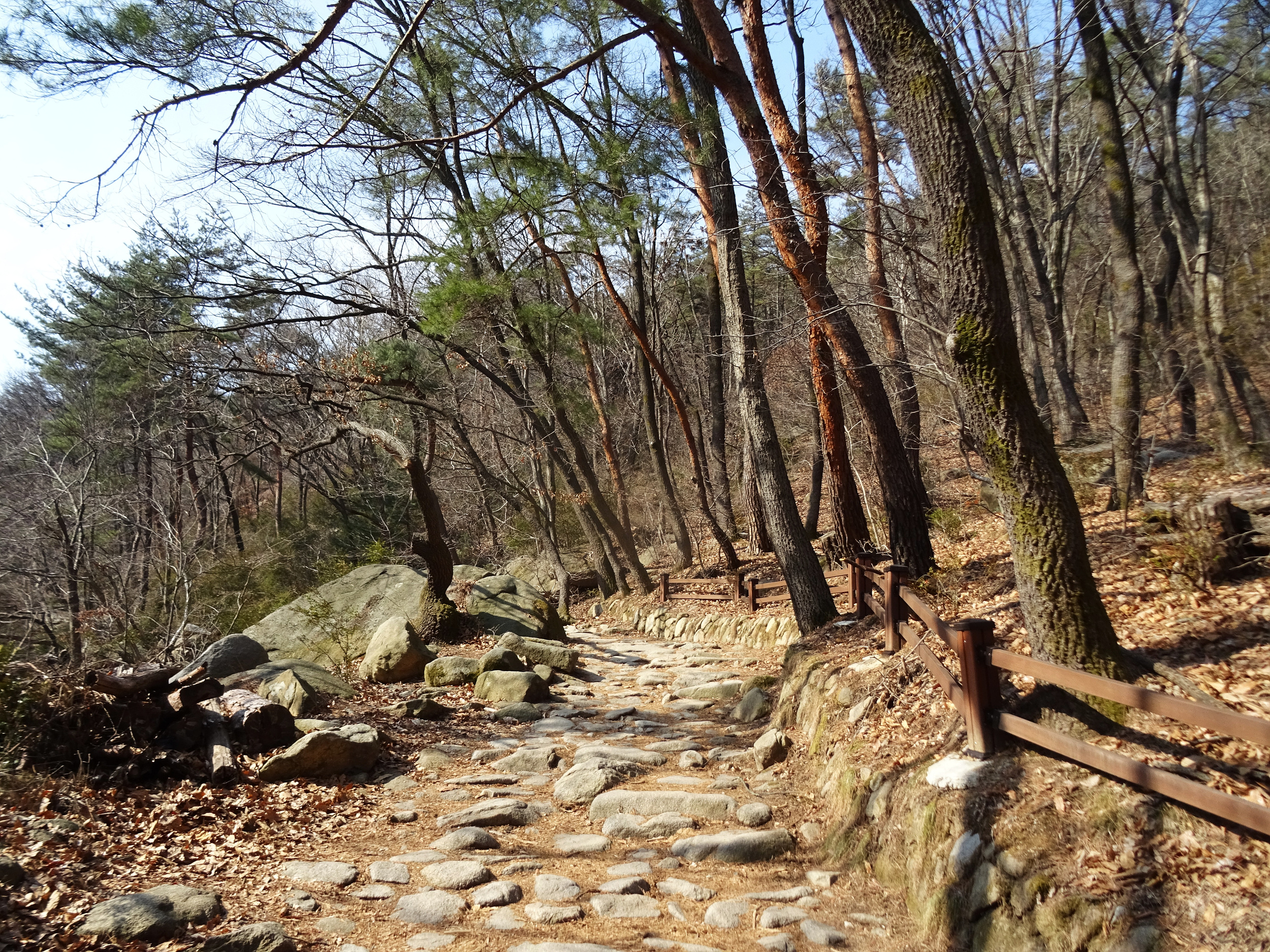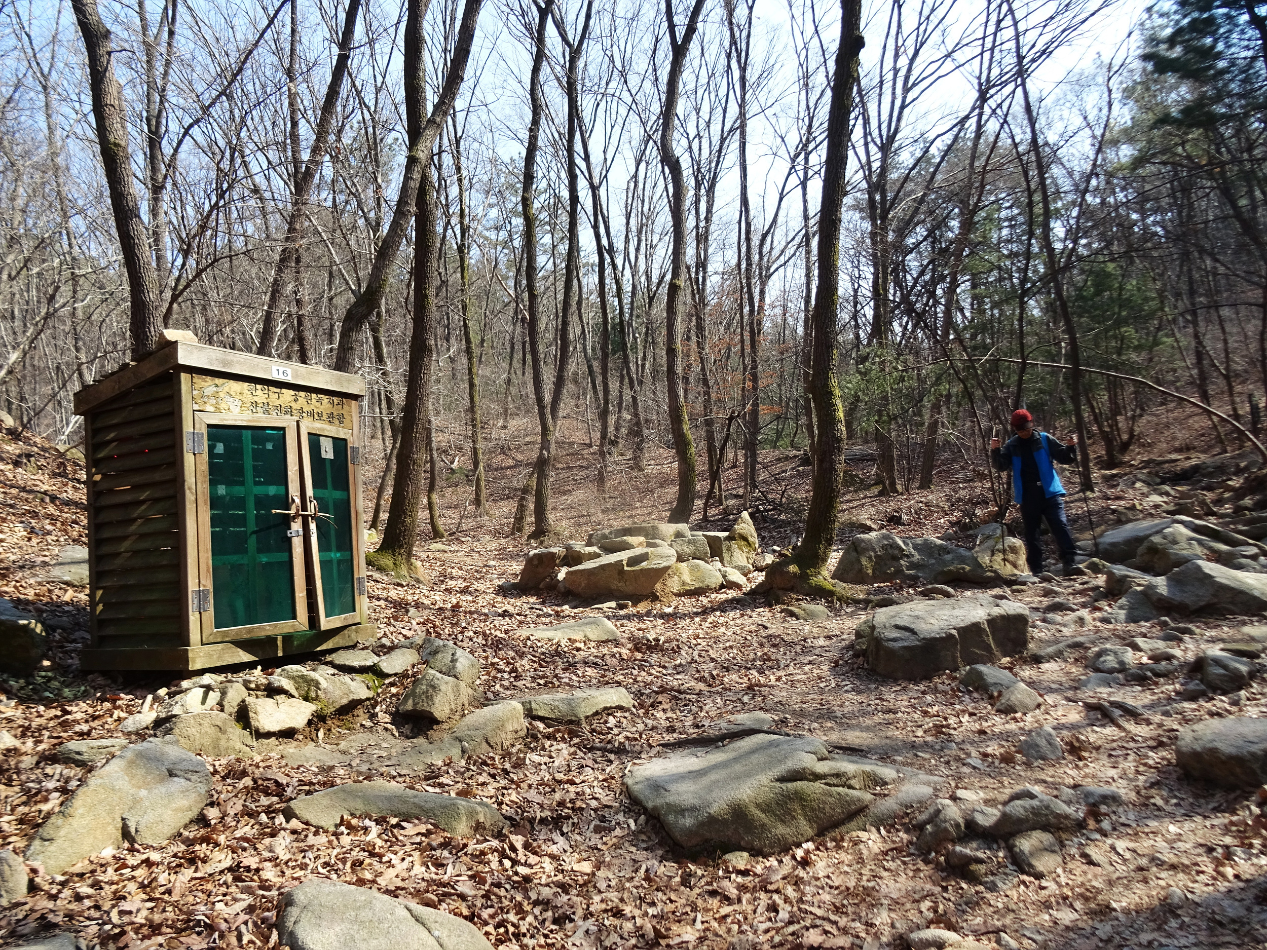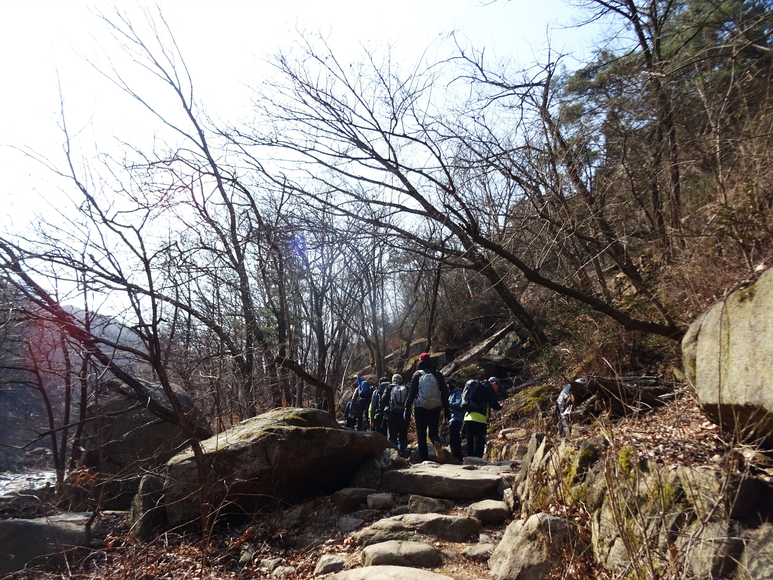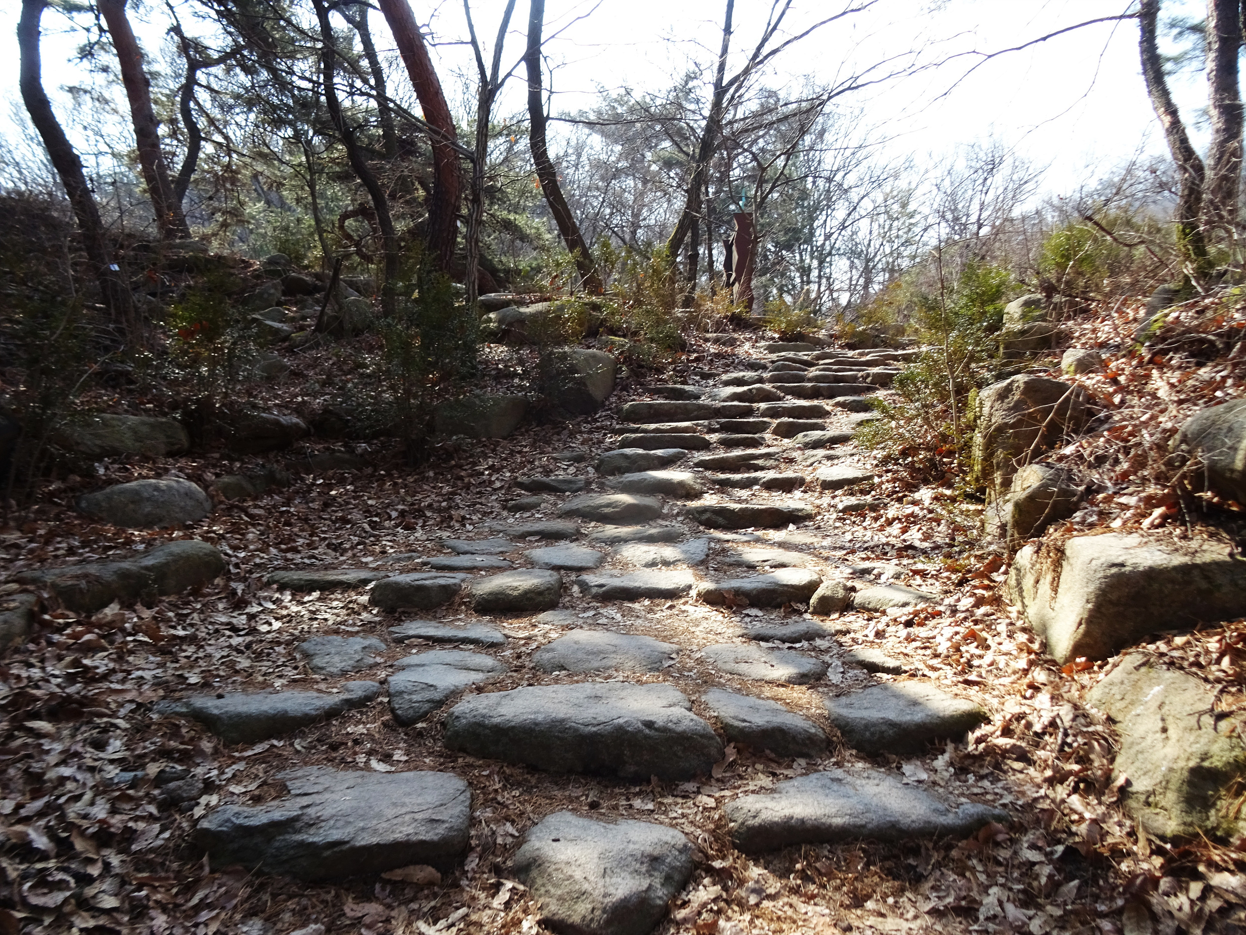 산 윗쪽에는 흰눈으로 덮혔습니다. 돌계단 사이 사이 눈 녹은 곳은 얼어서 미끄러워요.