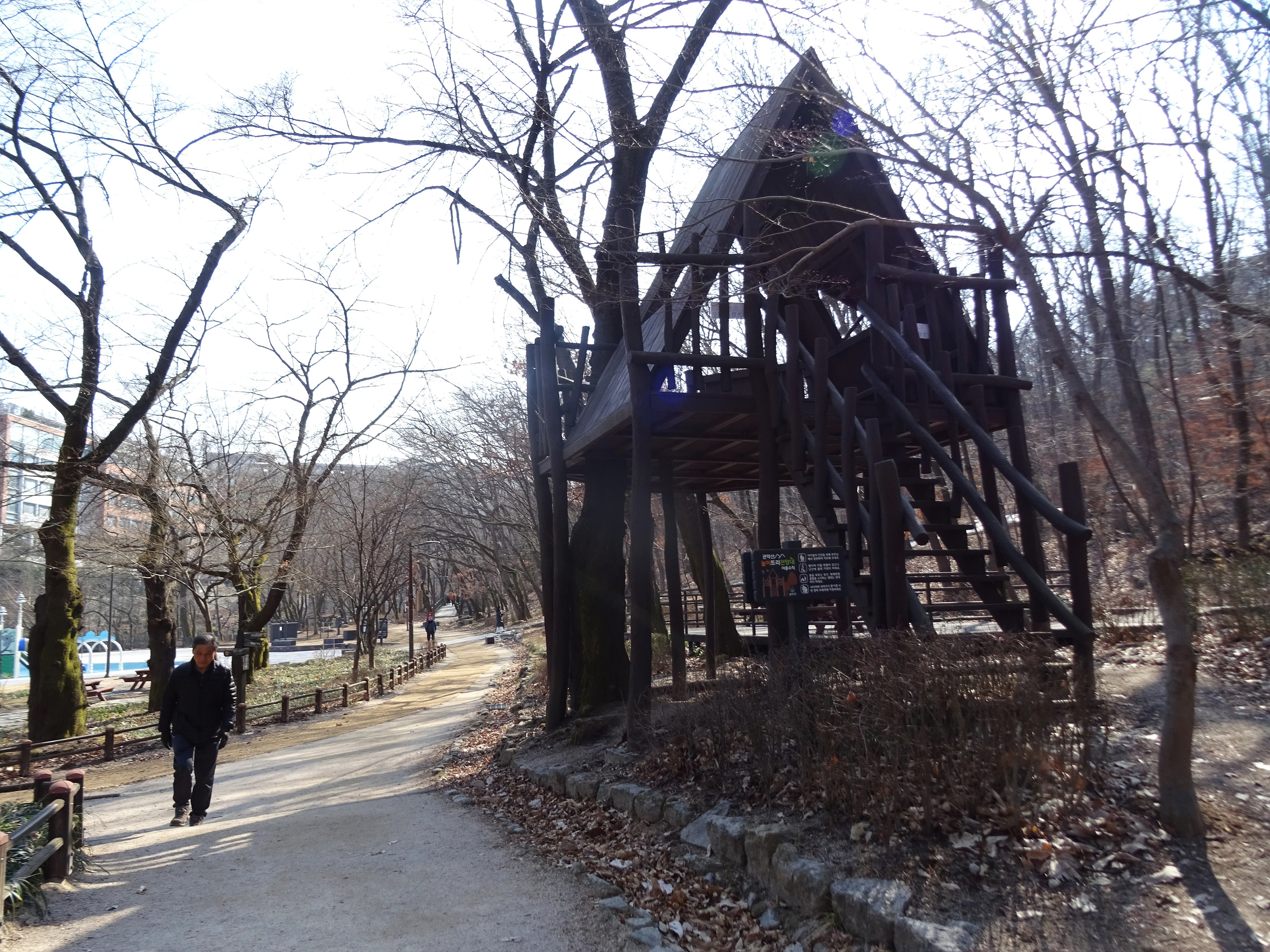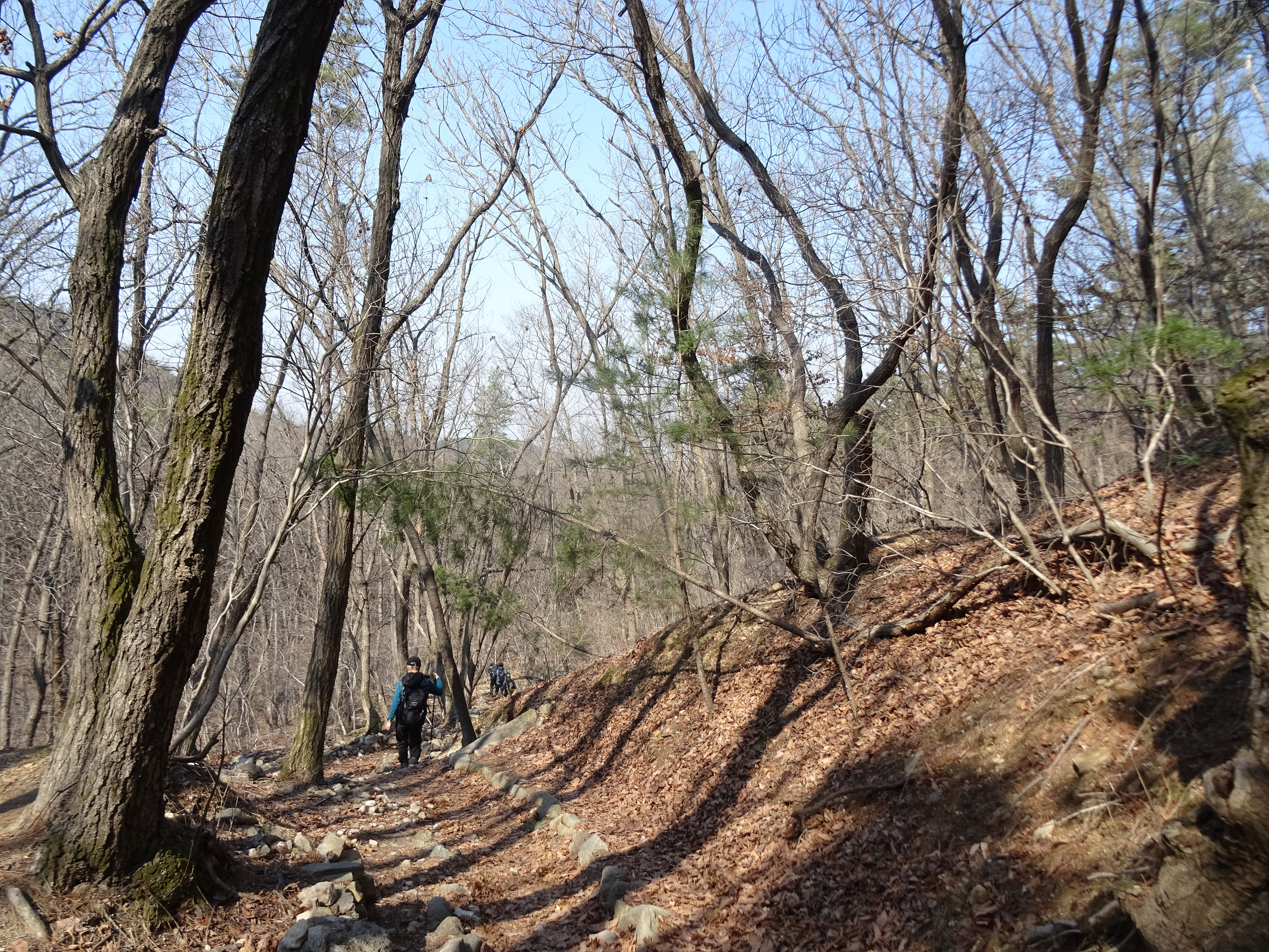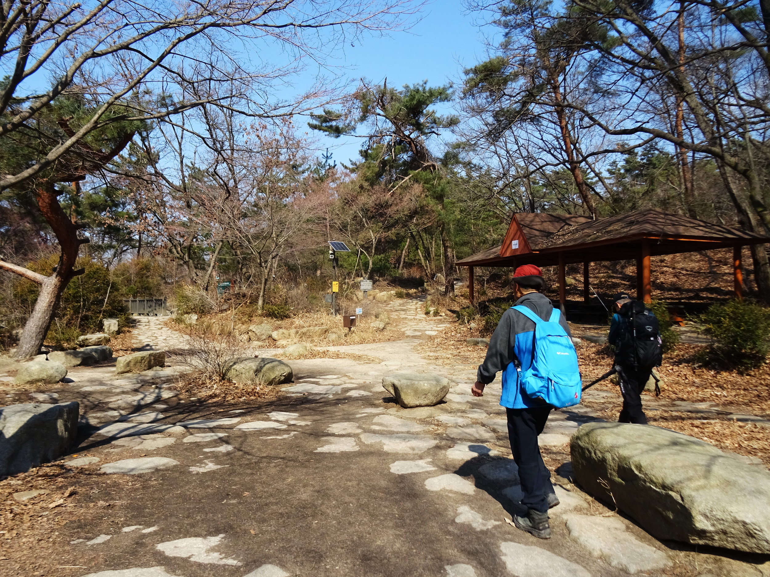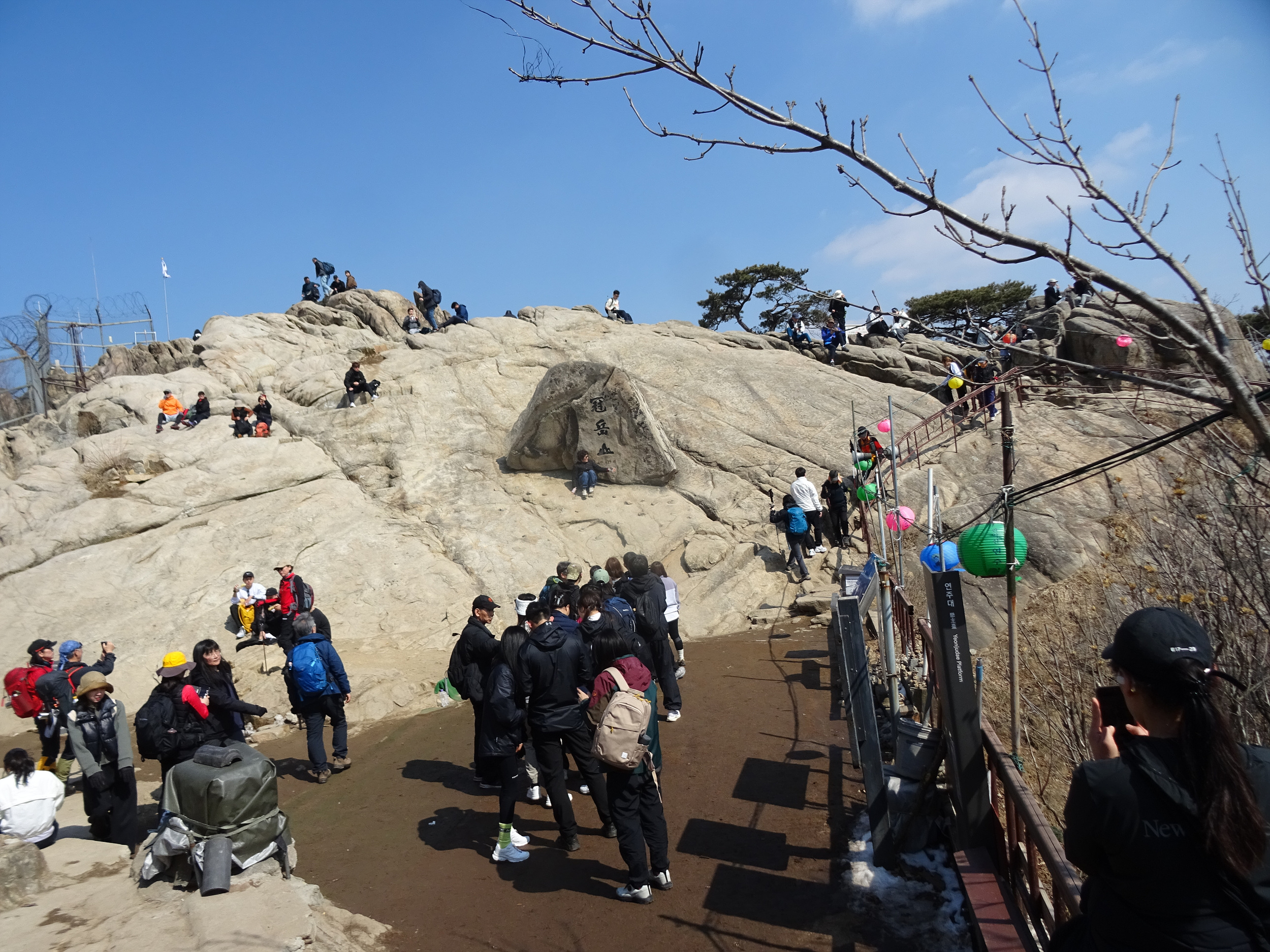 산 윗쪽에는 흰눈으로 덮혔습니다. 돌계단 사이 사이 눈 녹은 곳은 얼어서 미끄러워요.