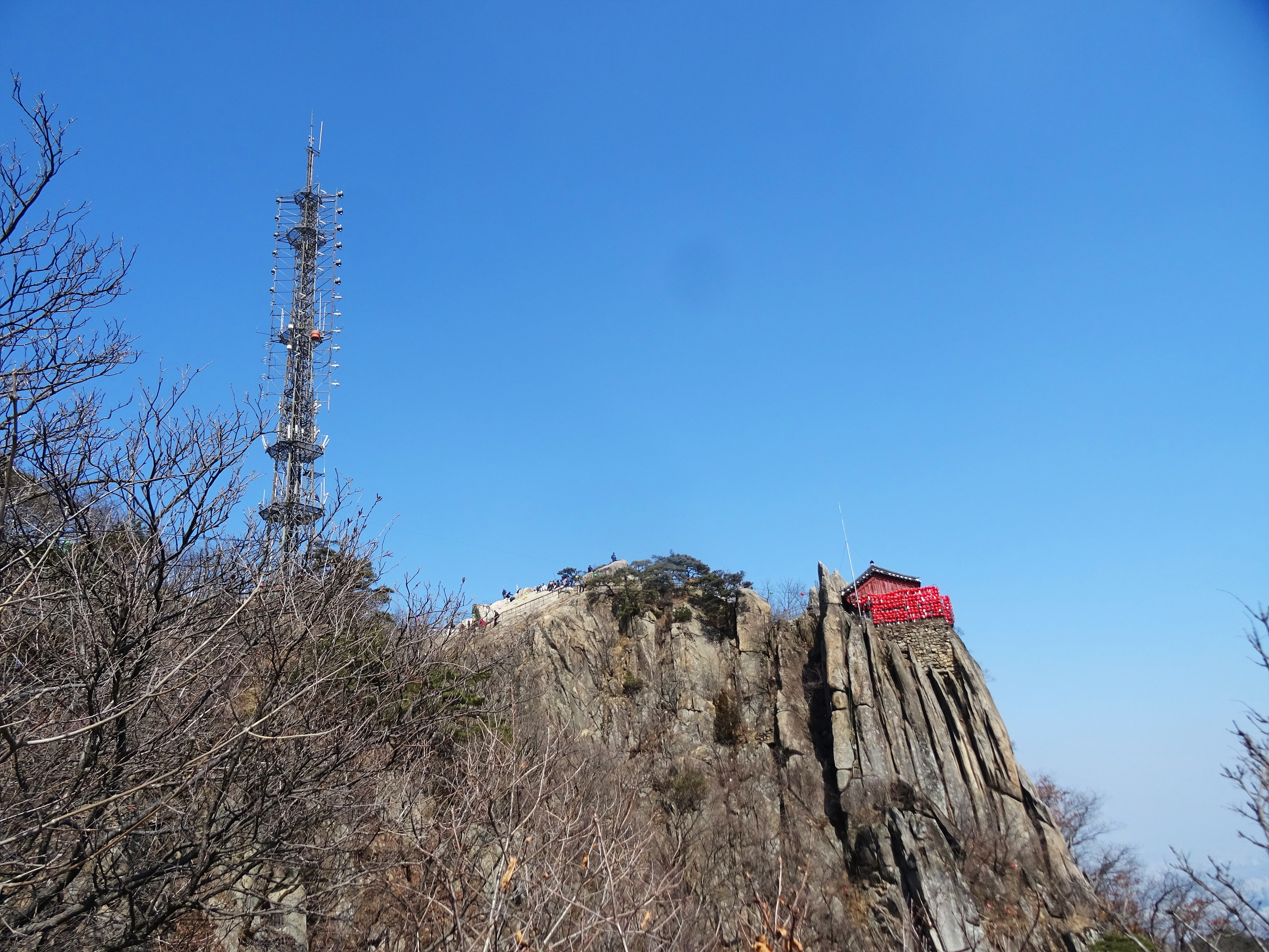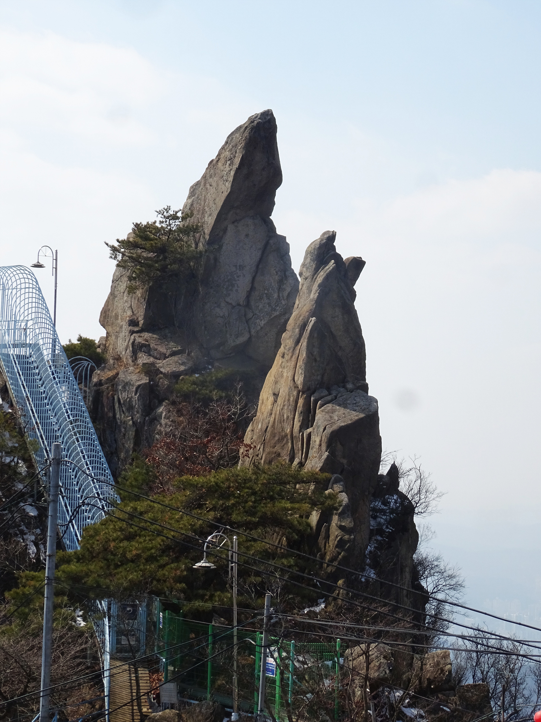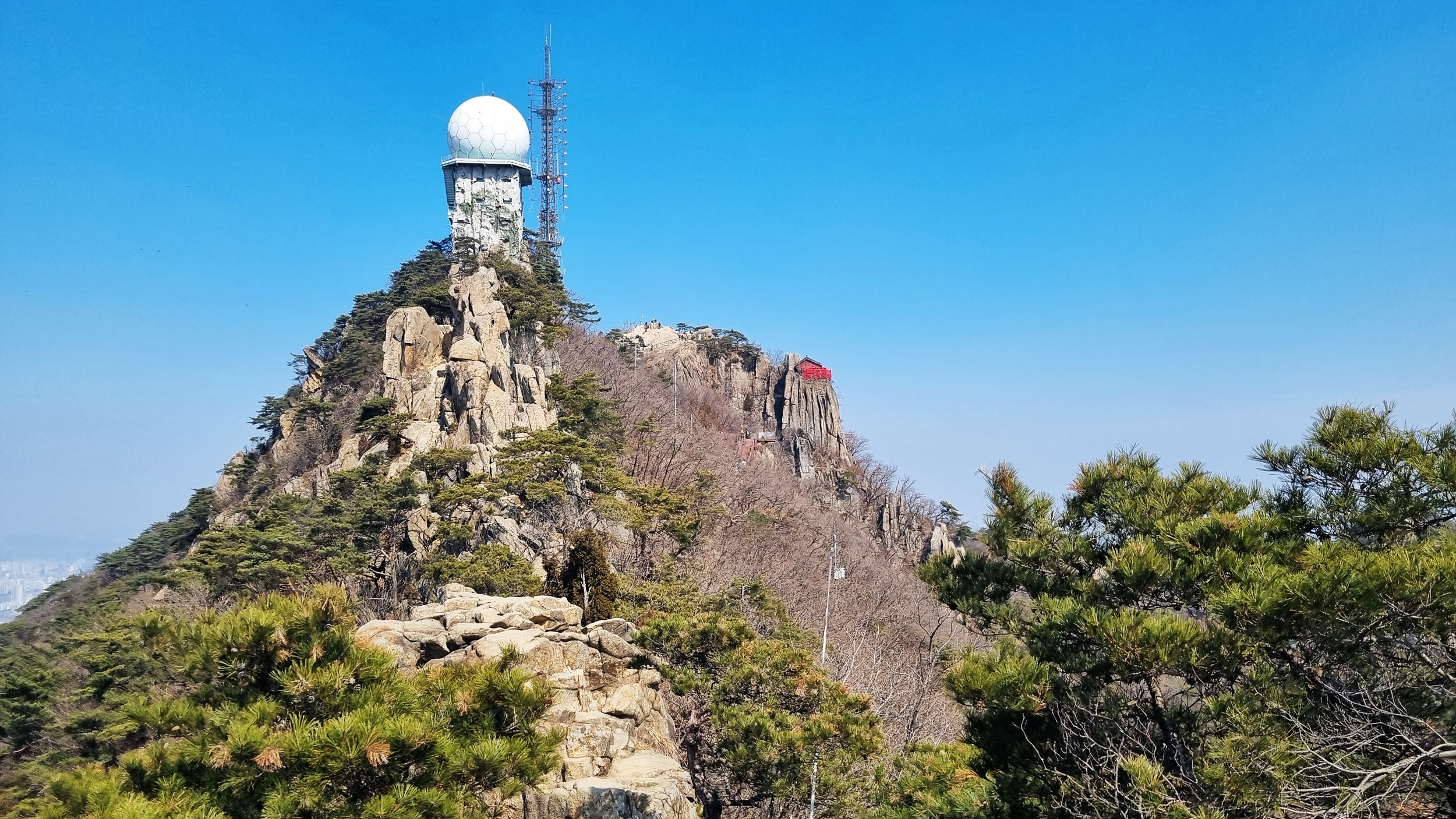 관악산 정상에 우뚝 솟아있는 바위벽 위에서 바라 본 기상관측소와 불꽃바위.