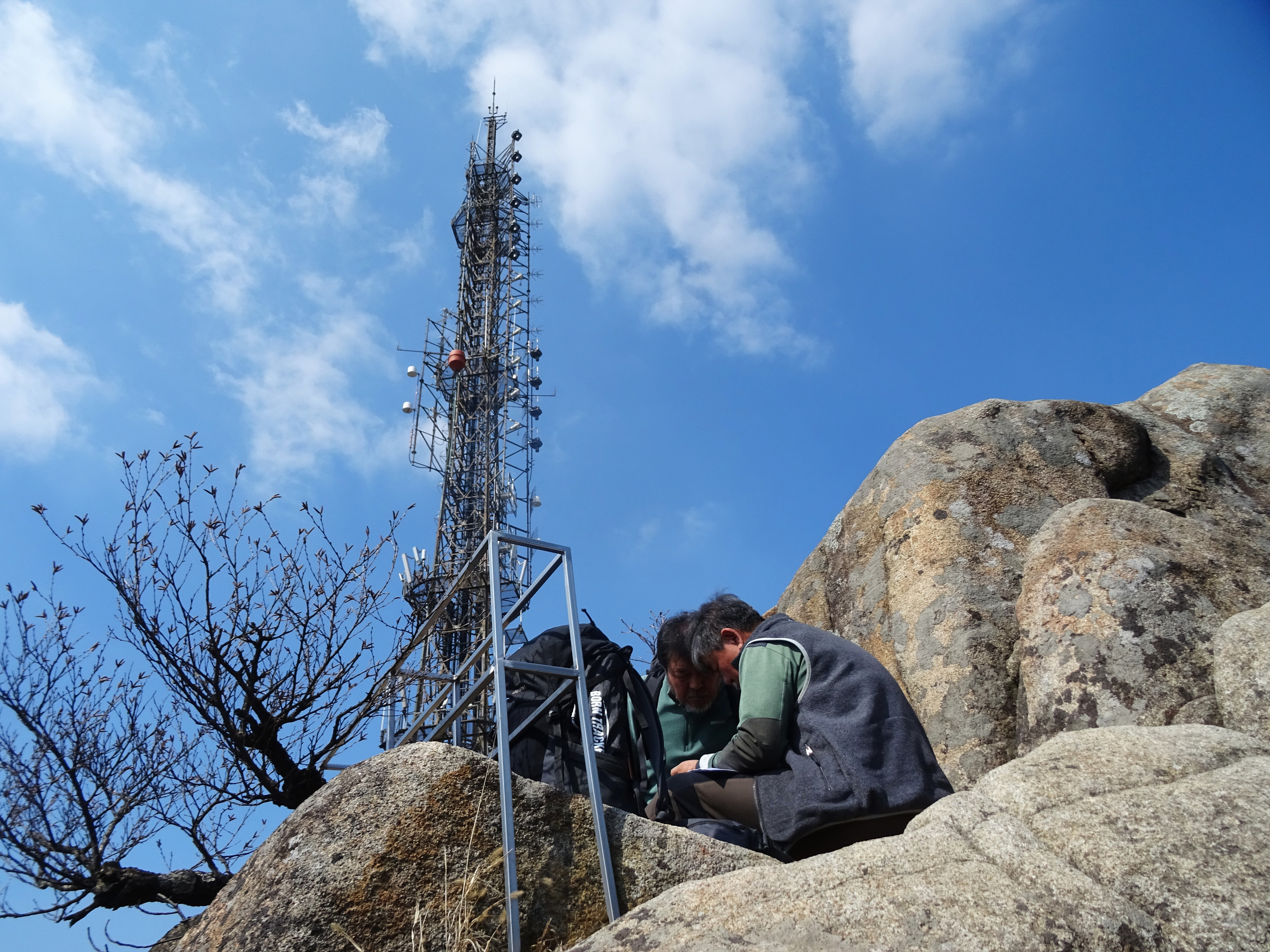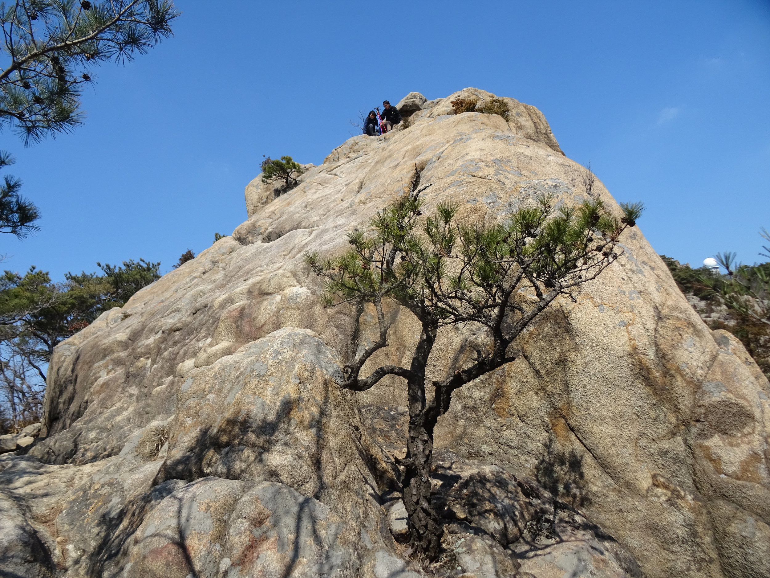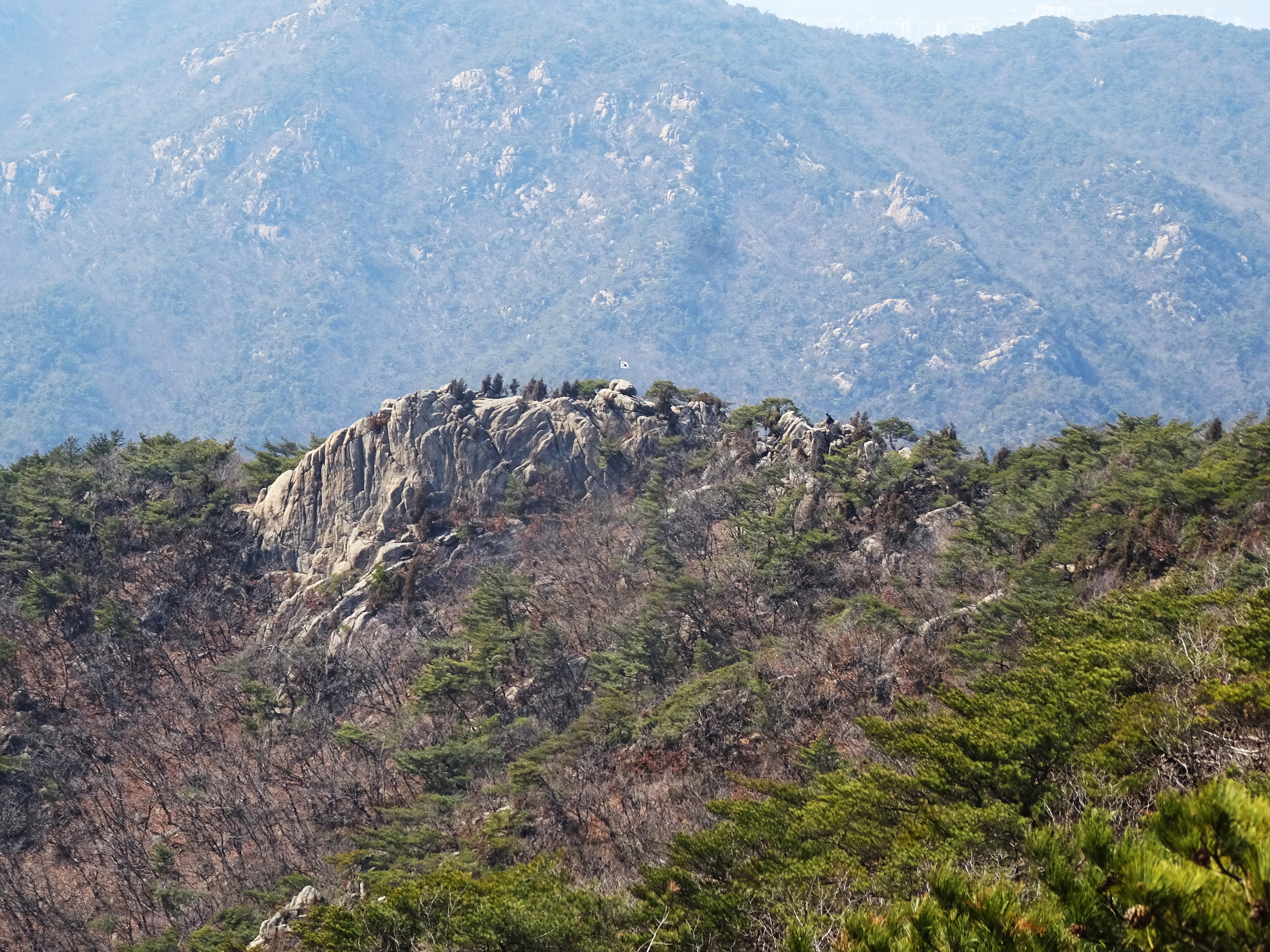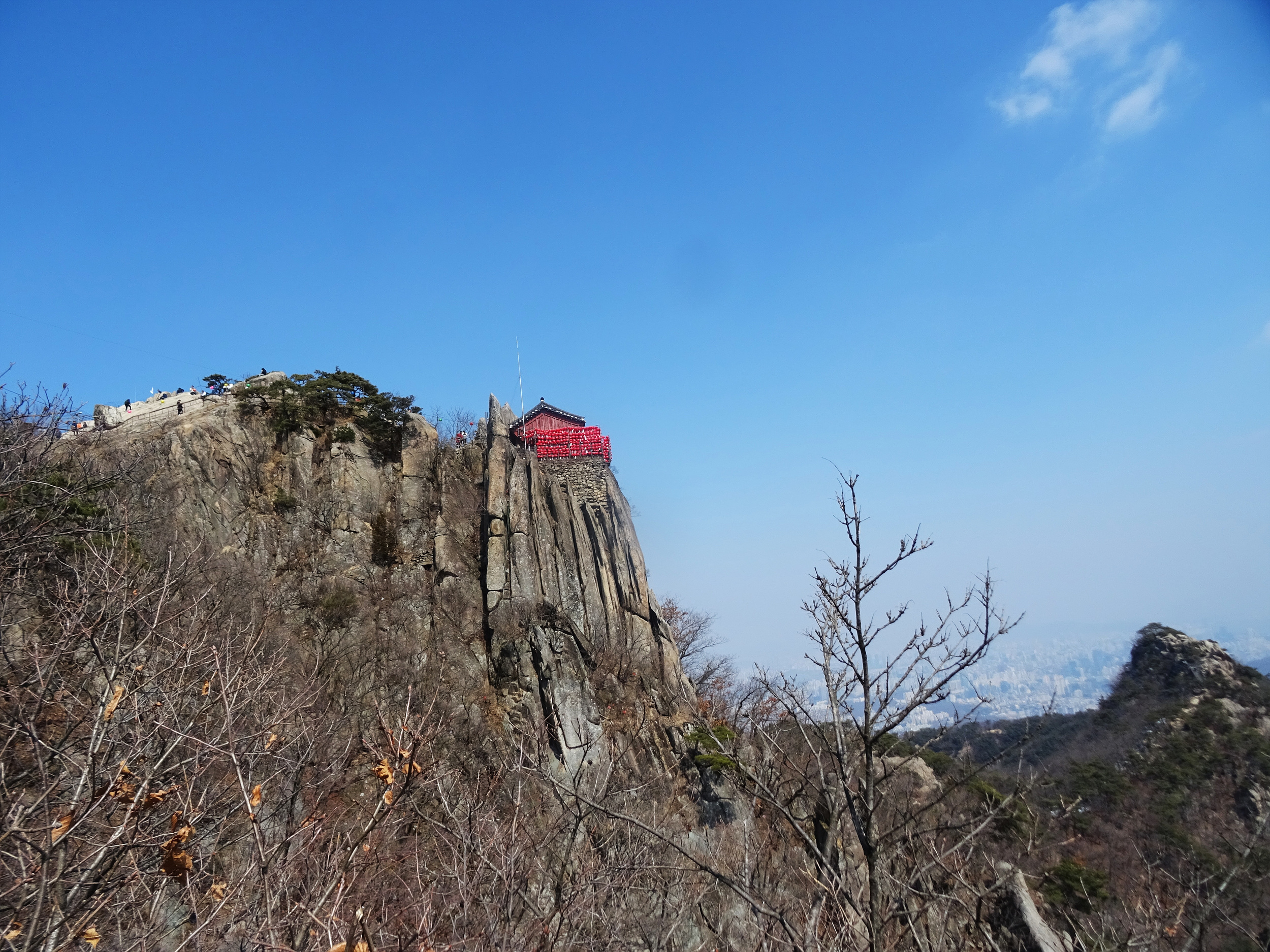 관악산 정상에 우뚝 솟아있는 바위벽 위에서 바라 본 기상관측소와 불꽃바위.