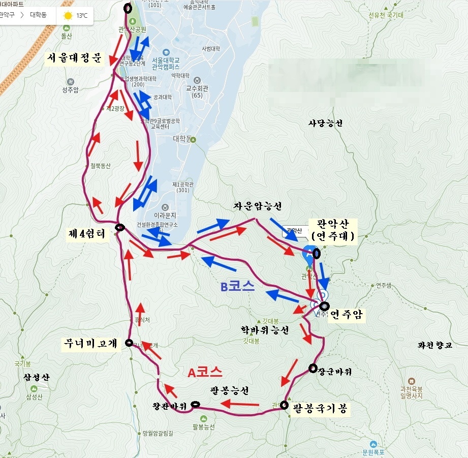 산행코스 : 서울대정문→제2광장→제4쉼터→신공학관갈림길→자운암능선→연주대(정상)→연주암→팔봉능선갈림길→장군바위→팔봉국기봉→팔봉능선→무너미고개→제4쉼터→서울대정문 (13km, 5시간)