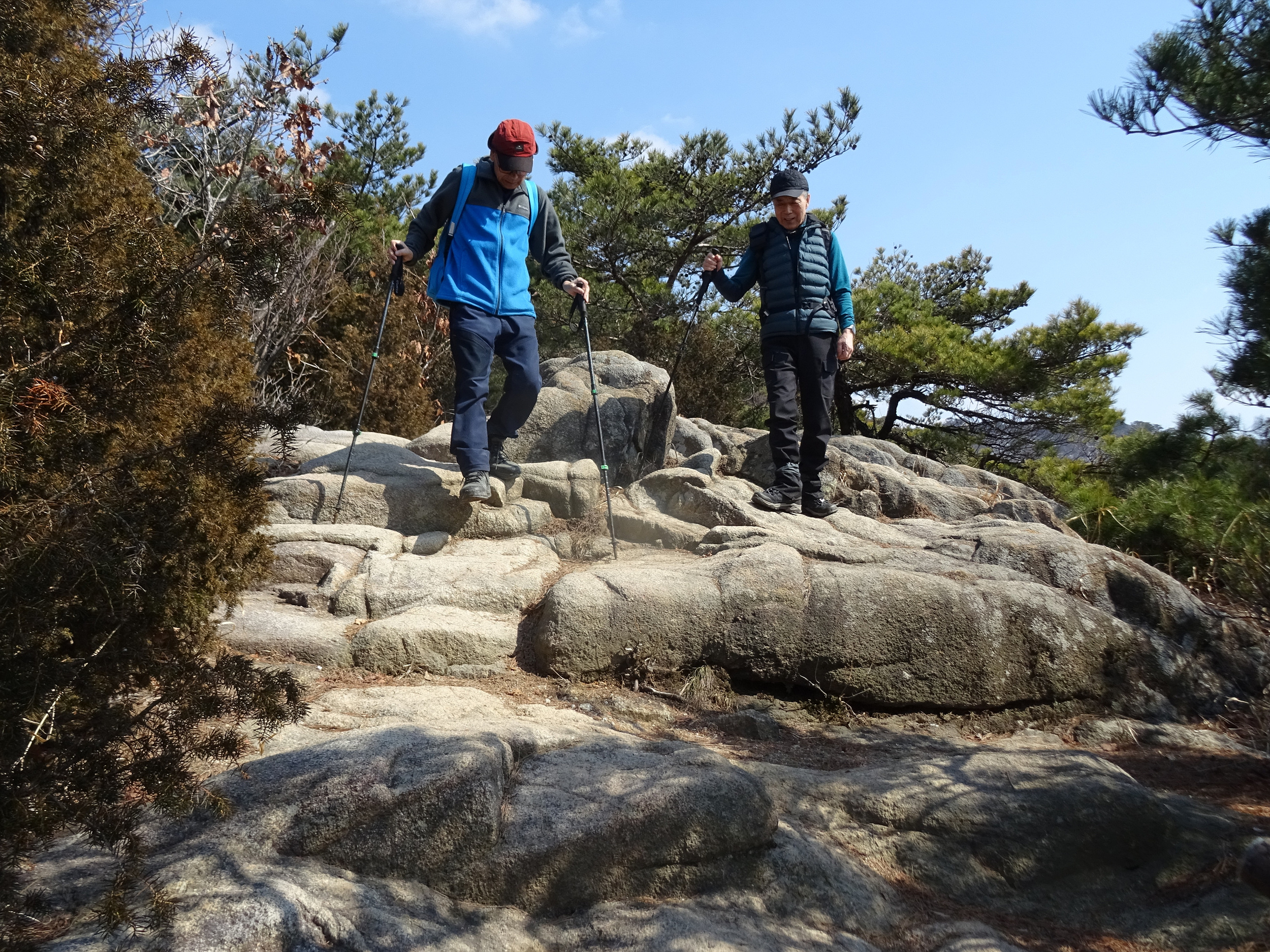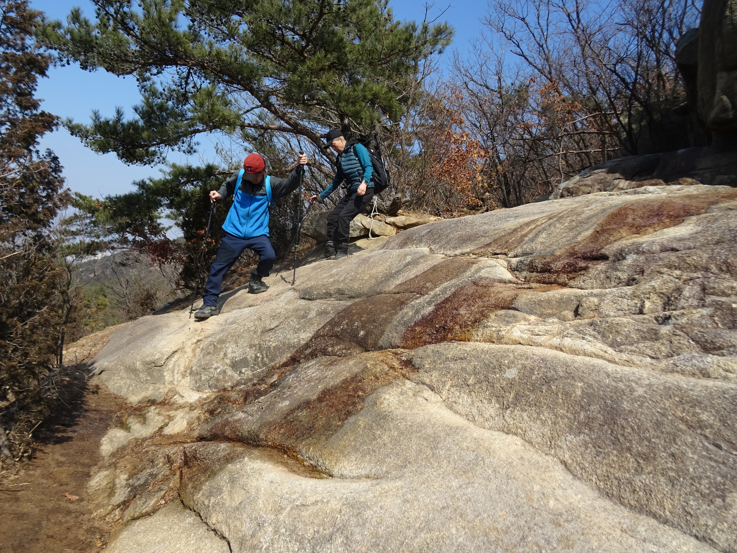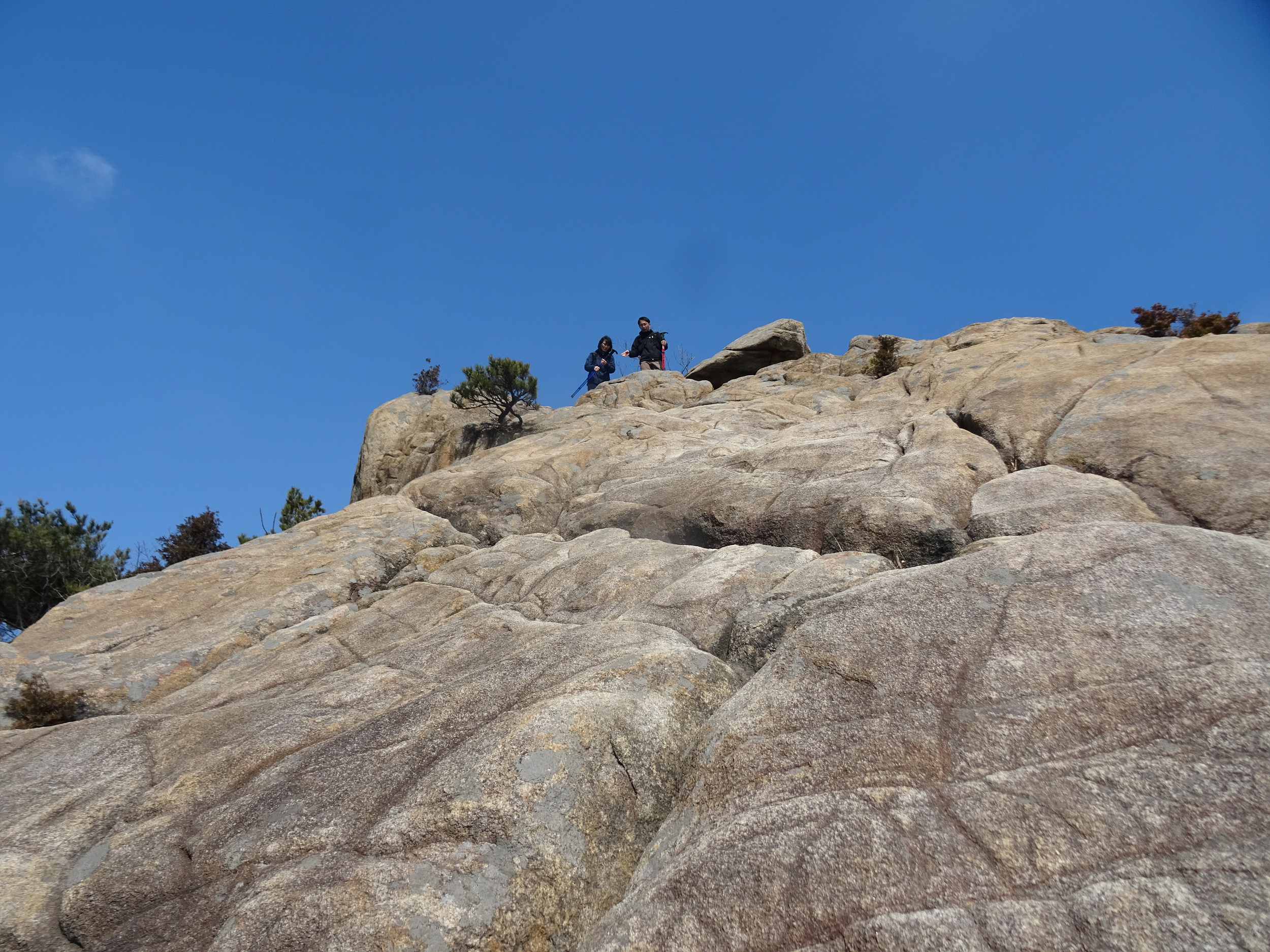 깃대봉 바위 끝부분에 젊은이 2명이 내려오려고 하는데, 이리로 내려오는 건 쉽지않아 보입니다.