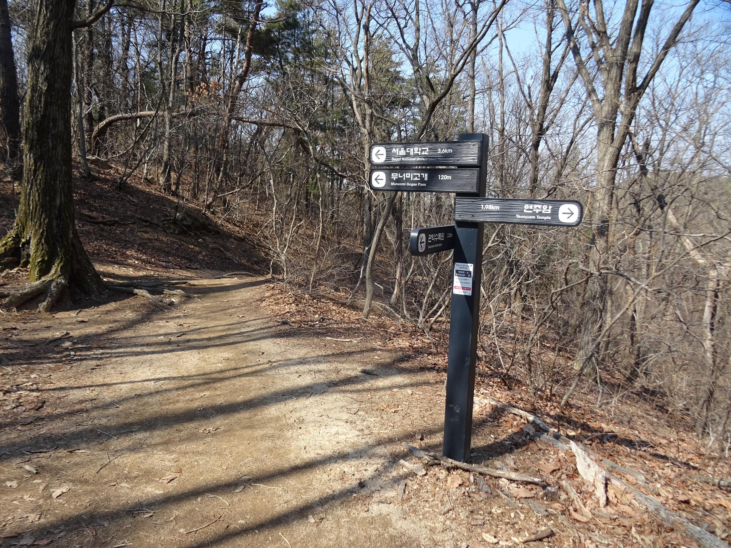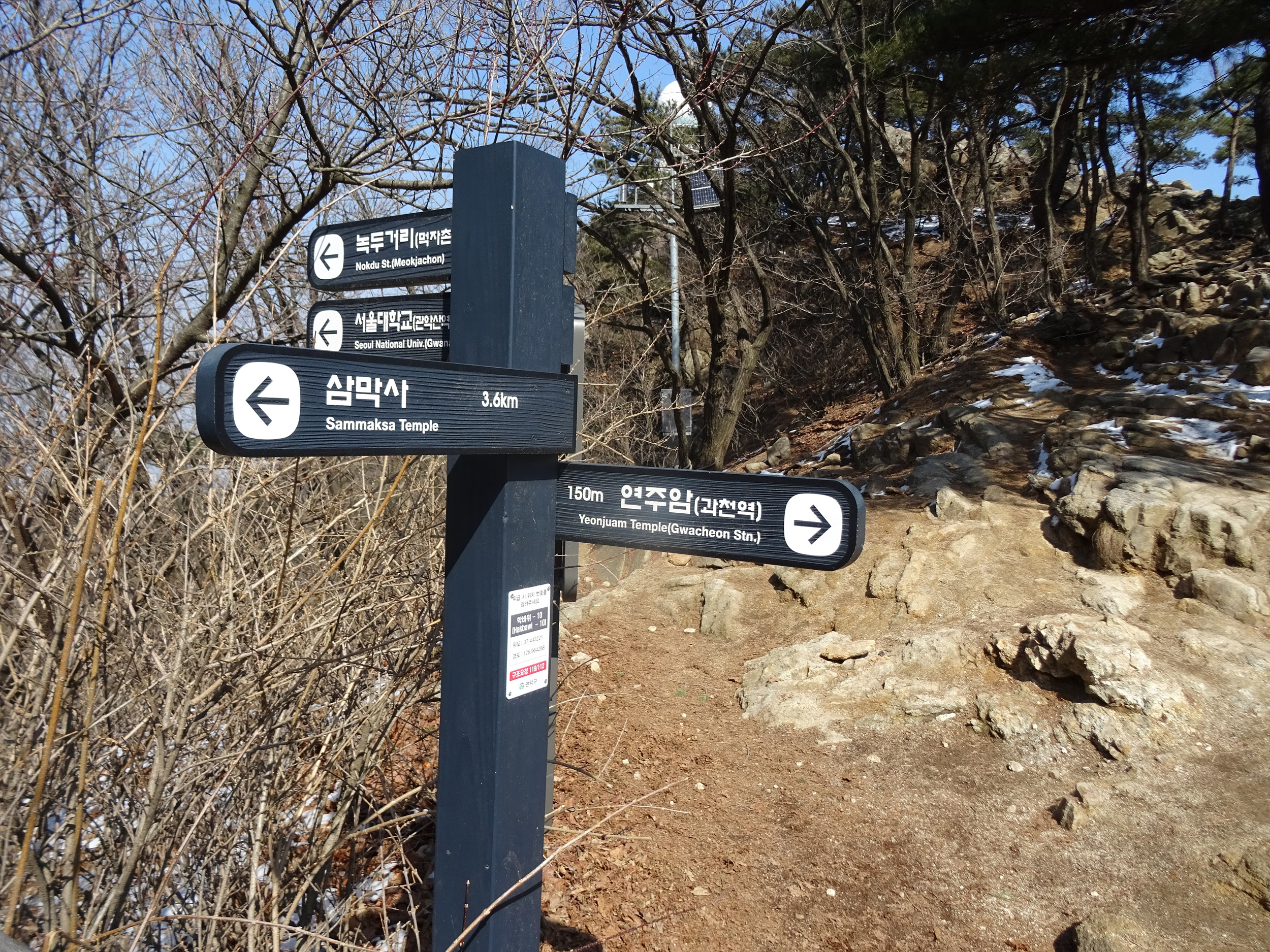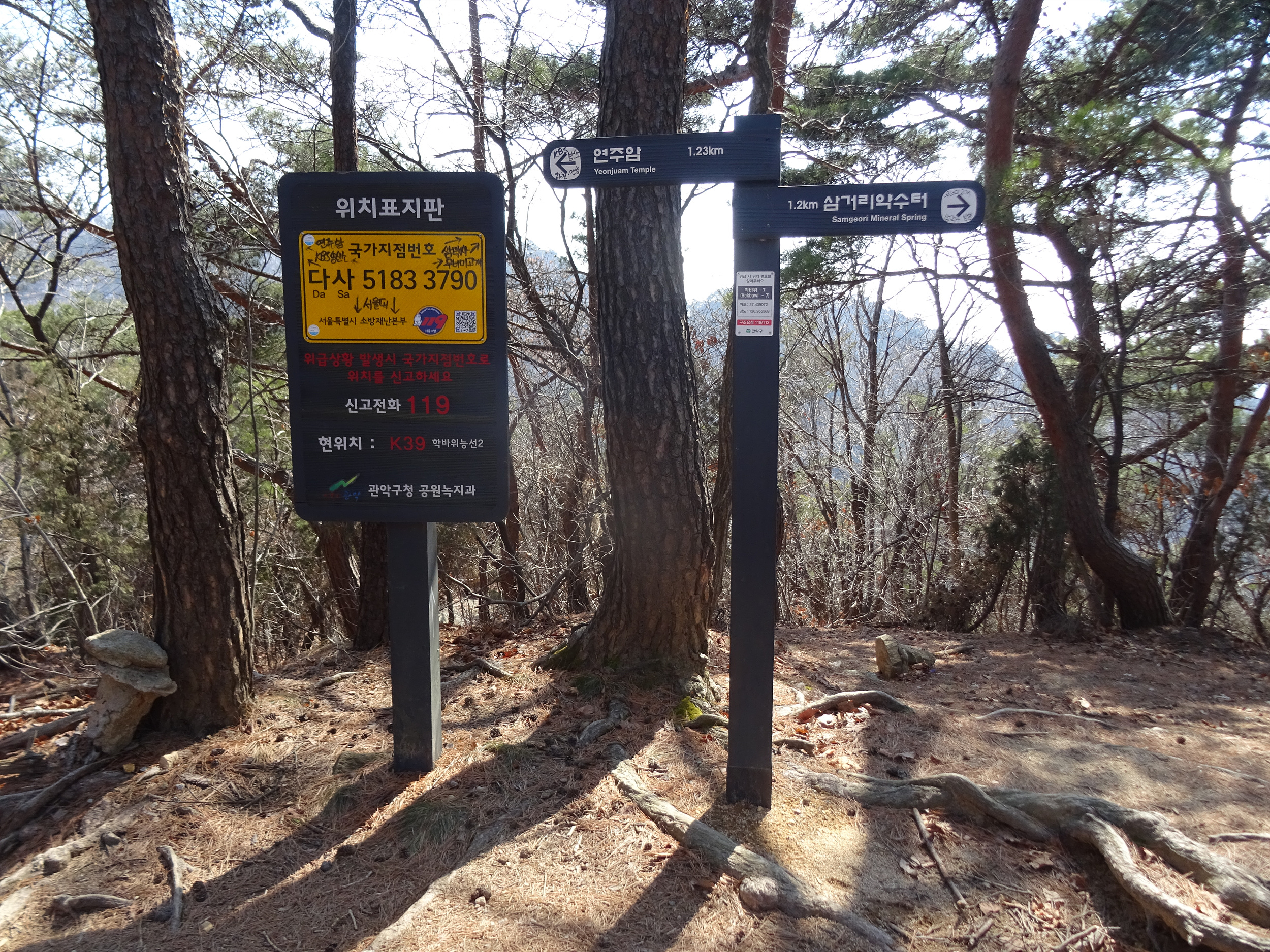 위치표지판에는 매직펜으로 연주암 가는 방향, 삼막사와 무너미고개로 가는 방향, 서울대 방향을 써 놓았습니다.