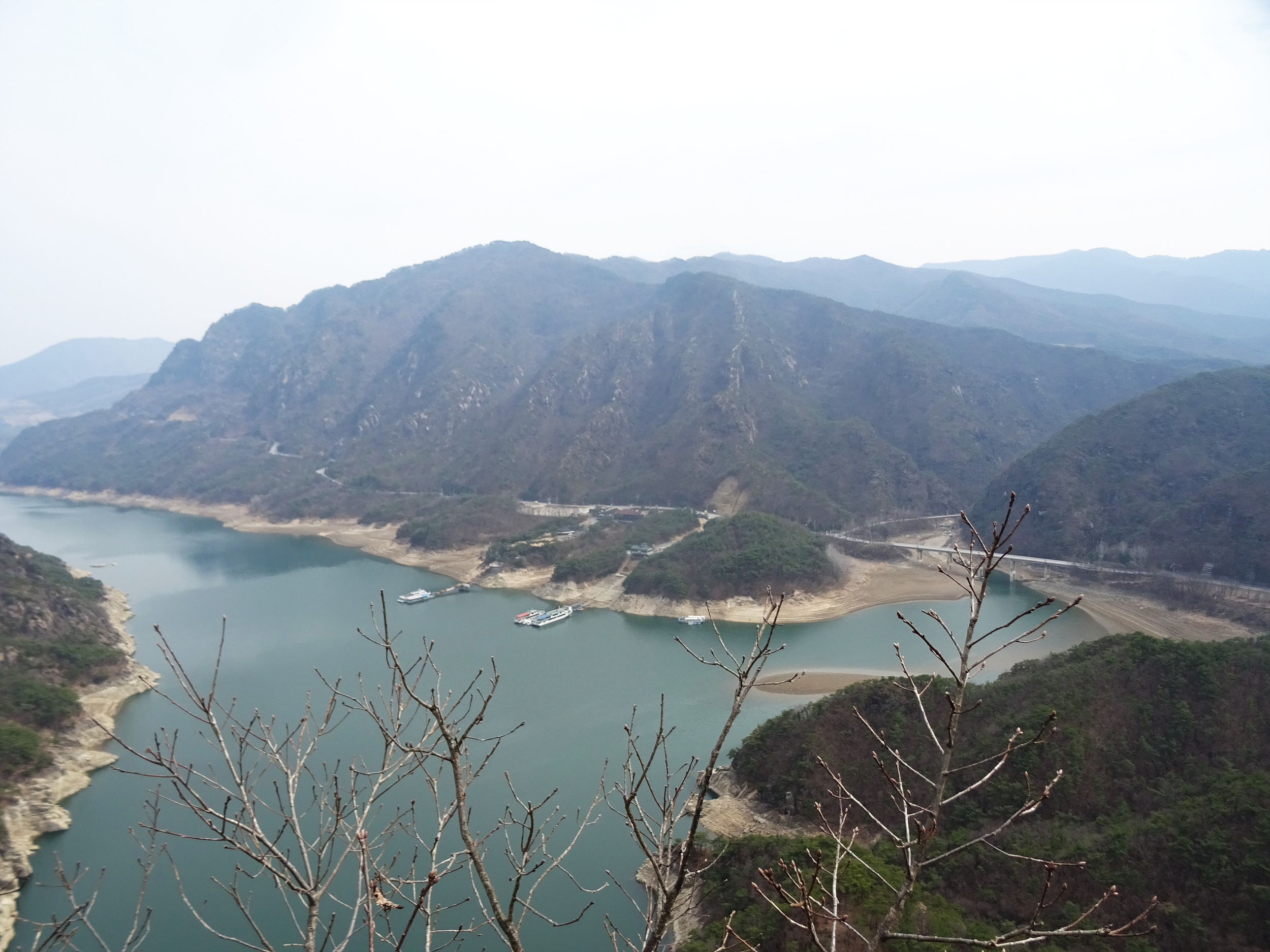 발 아래에 보이는 충주호의 푸른 강물이, 뱀처럼 구불구불 흘러갑니다.