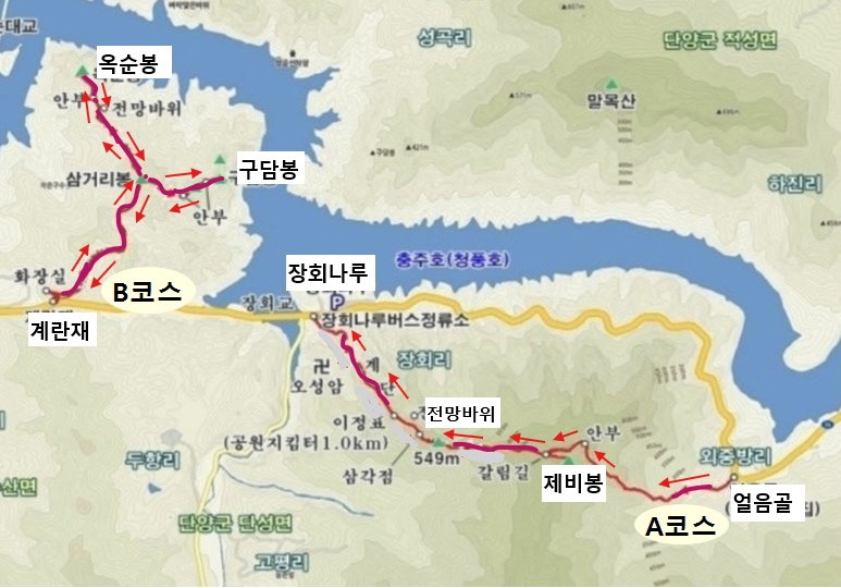 장회나루에서 계란재로 이동한 후, 구담봉으로 갈 겁니다.